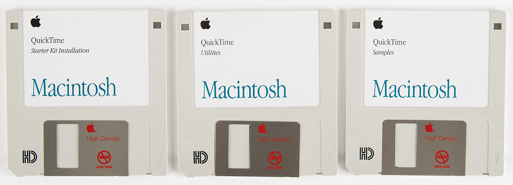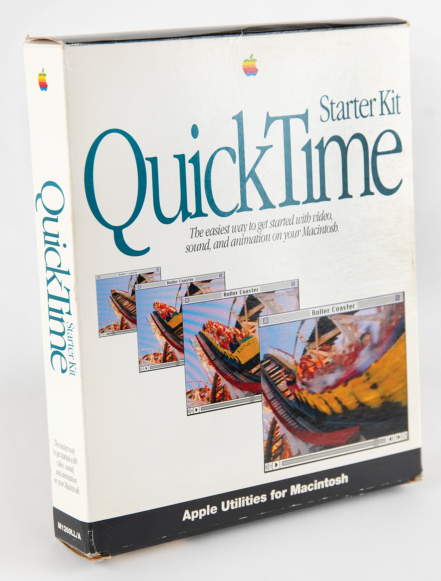 Apple Computer QuickTime Starter Kit (M1269LL/A) for the Macintosh released by the company in 1992. The original box, 8˝ x 9.5˝ x 1.5˝, contains the 51-page User’s Guide, its Support Services card, and three 3.5˝ floppy disks for ‘Starter Kit Installation,’ ‘Utilities,’ and ‘Samples.’ In fine condition, with trivial wear to the box.