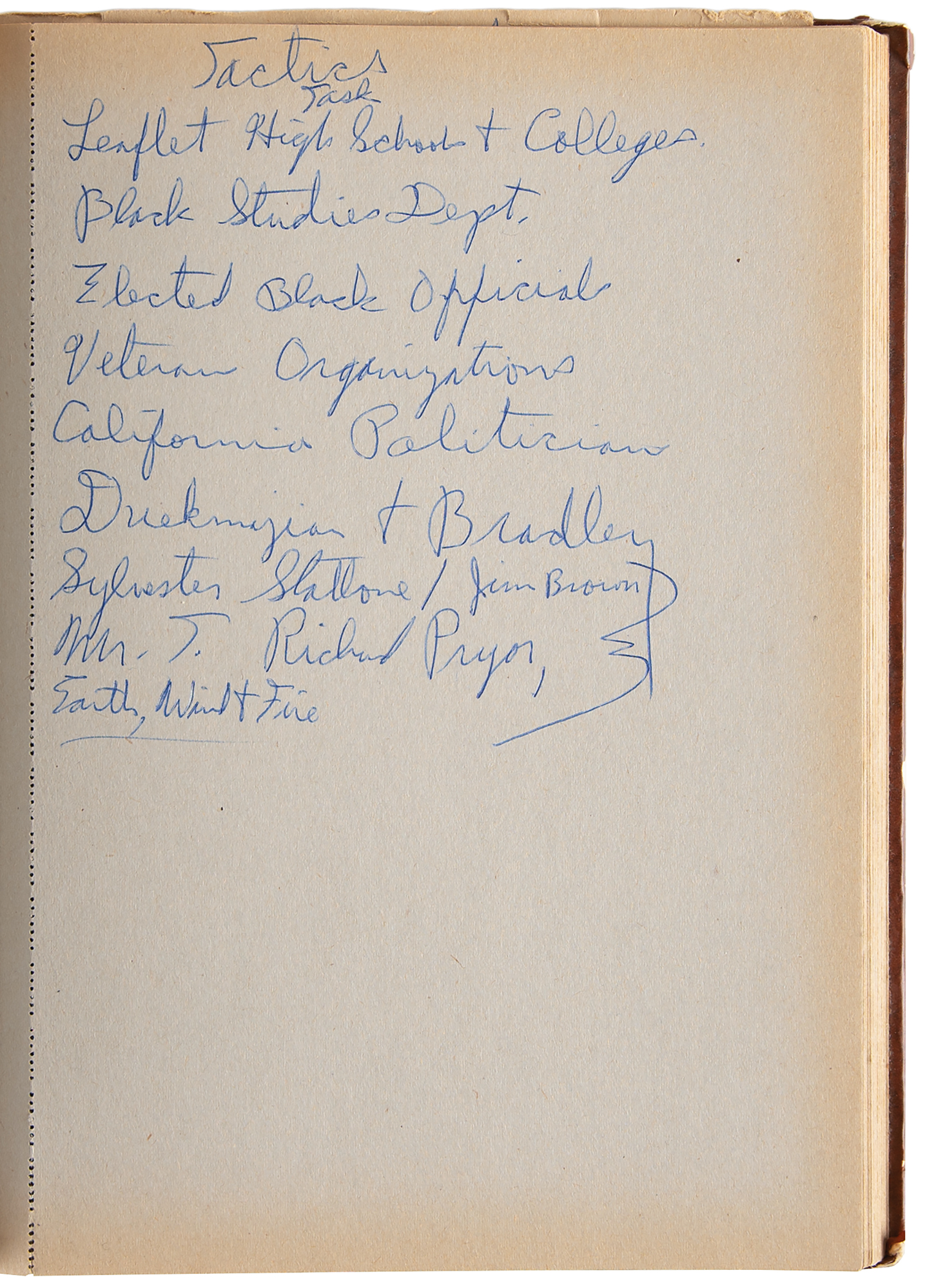 - List of “Tactics,” or “Tasks,” which read: “Leaflet High Schools & Colleges,” “Black Studies Dept.,” “Elected Black Officials,” “Veteran Organizations,” “California Politicians,” “Duekmejian & Bradley,” “Sylvester Stallone / Jim Brown,” “Mr. T, Richard Pryor,” and Earth Wind & Fire.”