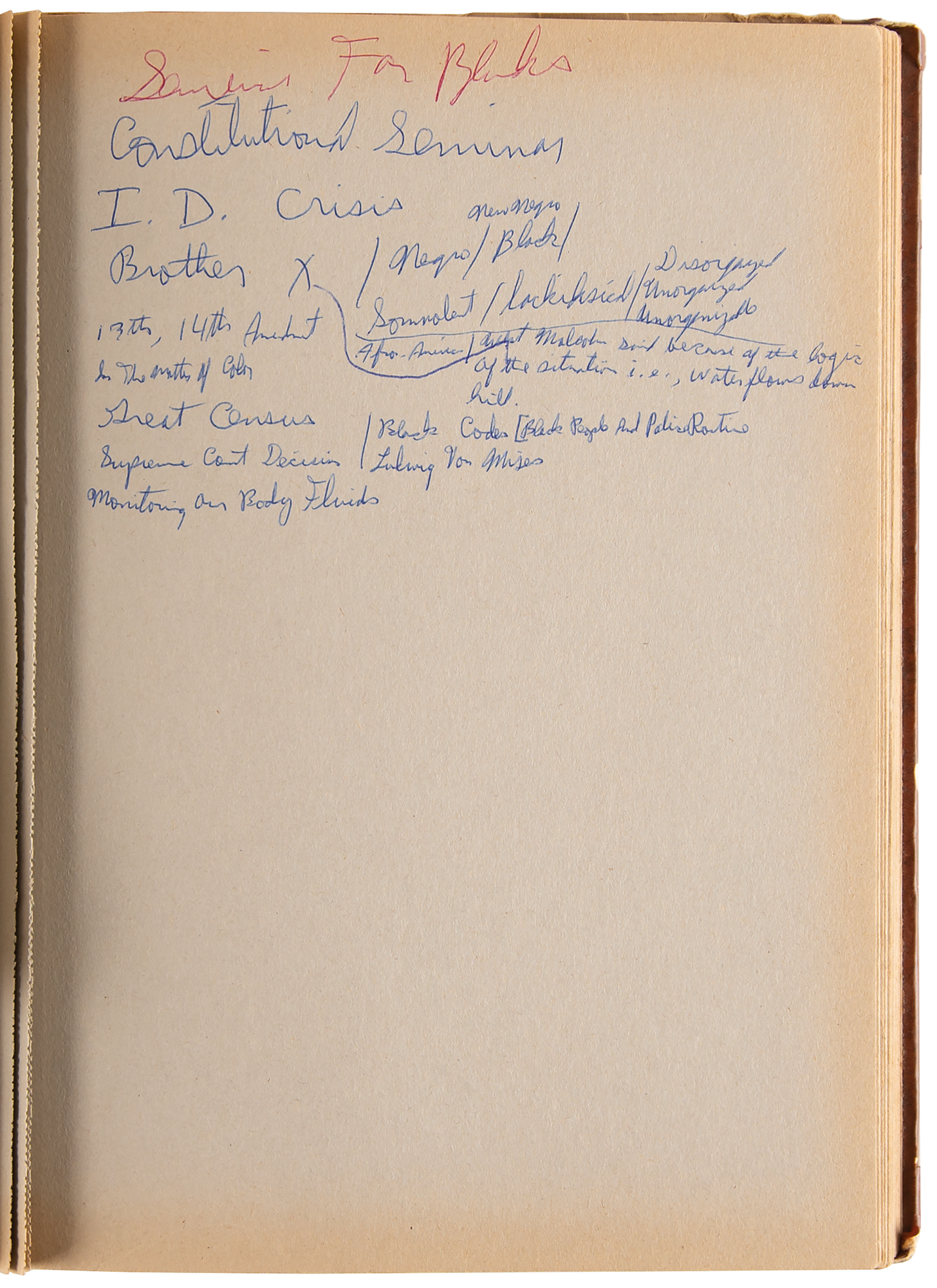 Eldridge Cleaver’s set of three journal notebooks from circa 1985-1987, containing over 160 pages of sundry handwritten notes and musings by the influential writer and political activist. These notebooks illustrate Cleaver’s life and views in the 1980s, a mindset far removed from his days as a Black Panther revolutionary of the 1960s. Among the various subjects found therein, Cleaver tries developing ideas for a screenplay, makes notes about books he wants to read, lists the names of people he plans to contact, and begins a daily diary, starting with the date he received divorce papers from his wife of 20 years. Cleaver also takes up the causes of Clare Morrison, an elderly widow who lost her house to hostile tenants, and Elmer ‘Geronimo’ Pratt, who was falsely imprisoned since 1972 for a murder he did not commit. The notebooks are as follows:
