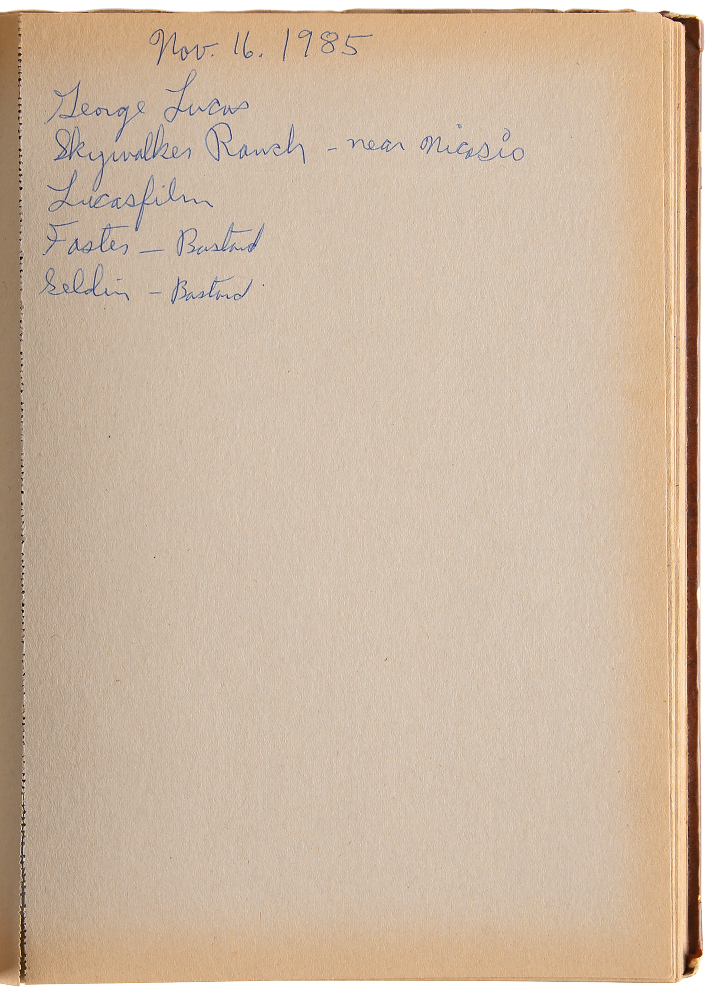- “Nov. 16, 1985 / George Lucas / Skywalker Ranch – near Nicasio / Lucasfilm / Foster—Bastard / Seldin—Bastard.”