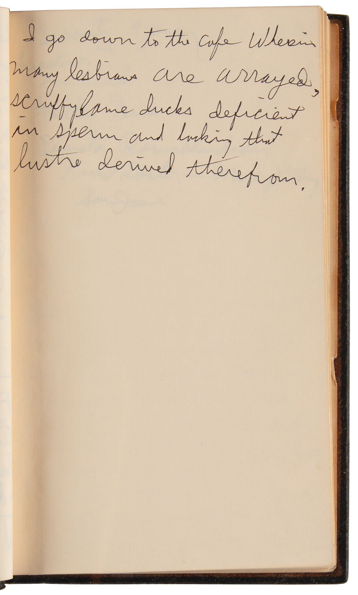 - “I go down to the café wherein many lesbians are arrayed, scruffy lame ducks deficient in sperm and lacking that lustre derived therefrom.”