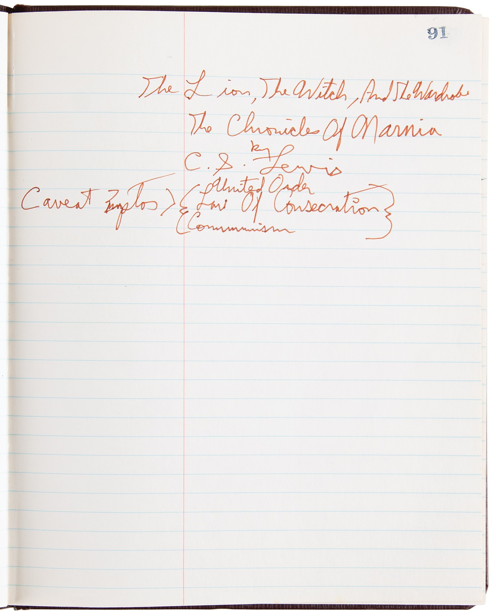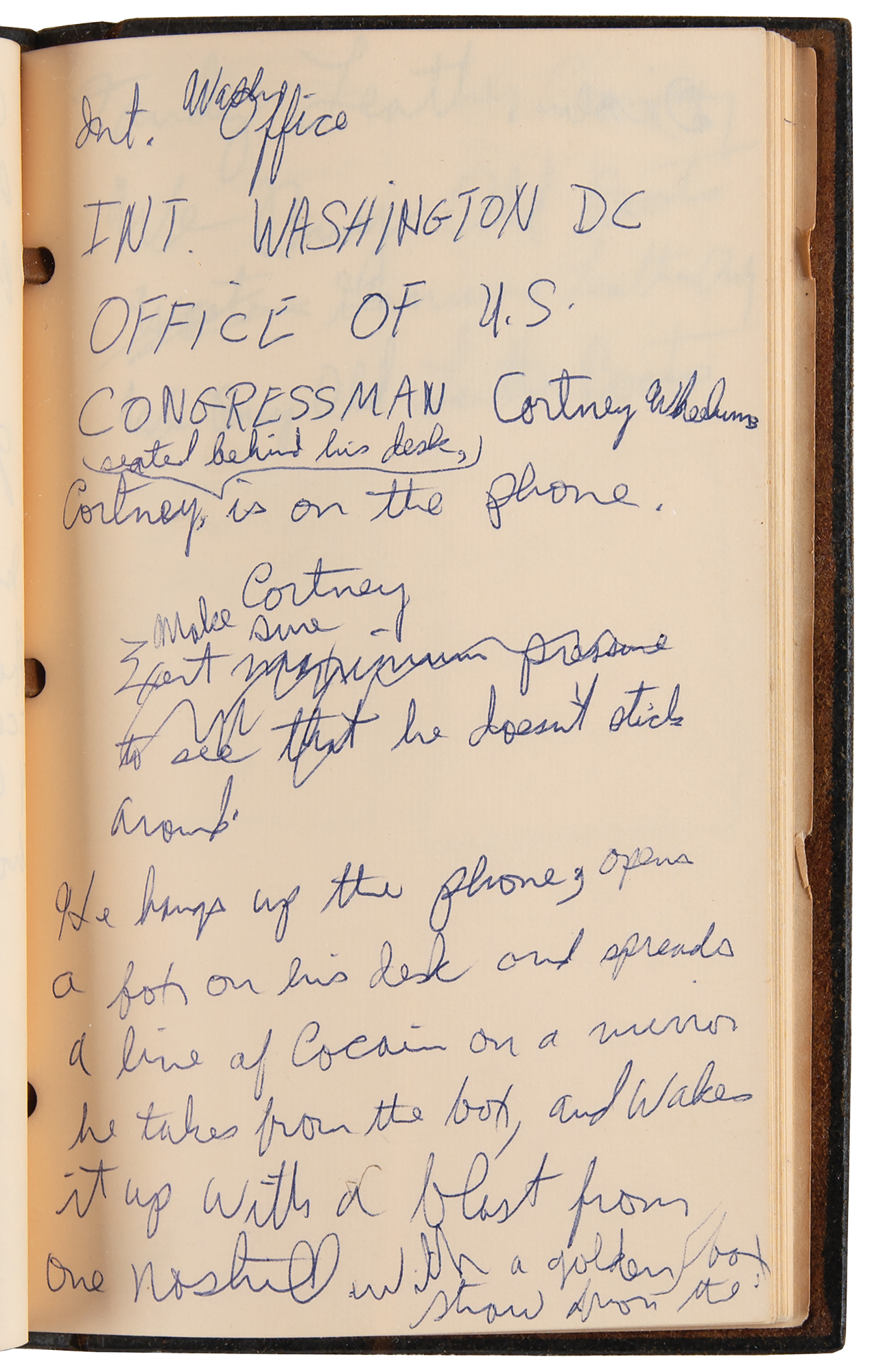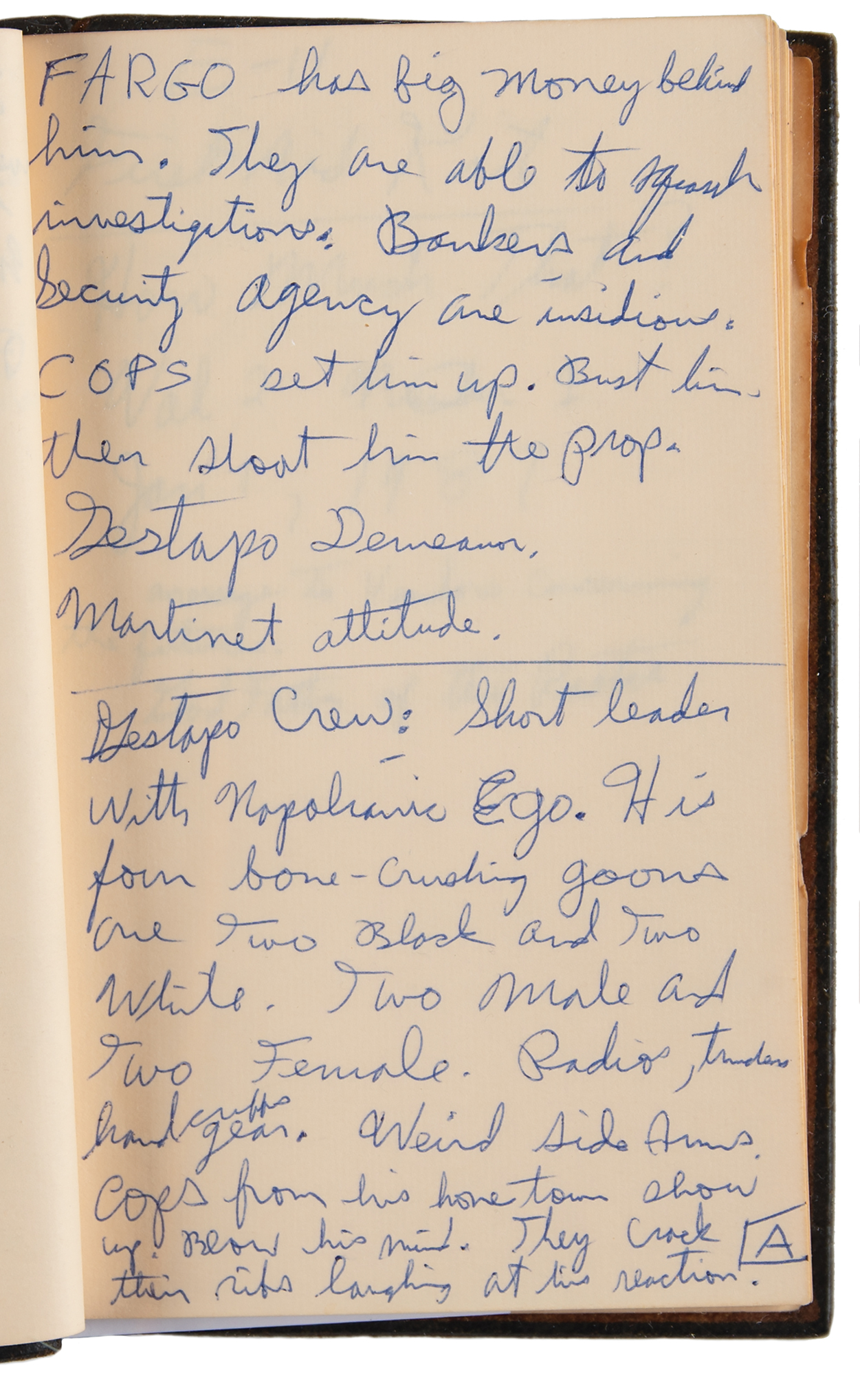 Leather-bound notebook, 6 x 9, 148 pages (59 with Cleaver’s handwriting), some damage to front cover, and general toning to interior. The notebook includes notes for a film script and various other subjects, to-do lists, possible speaking engagements, author names and book titles, and contact information for various people. Highlighted quotes include:
