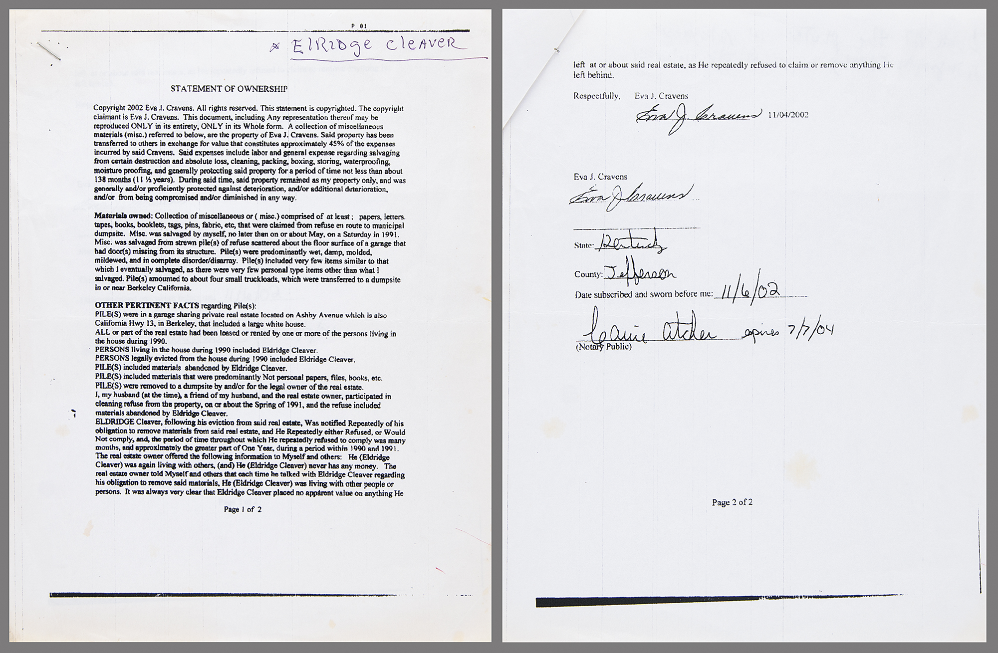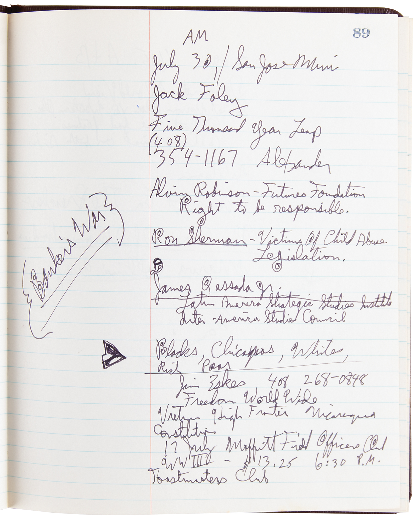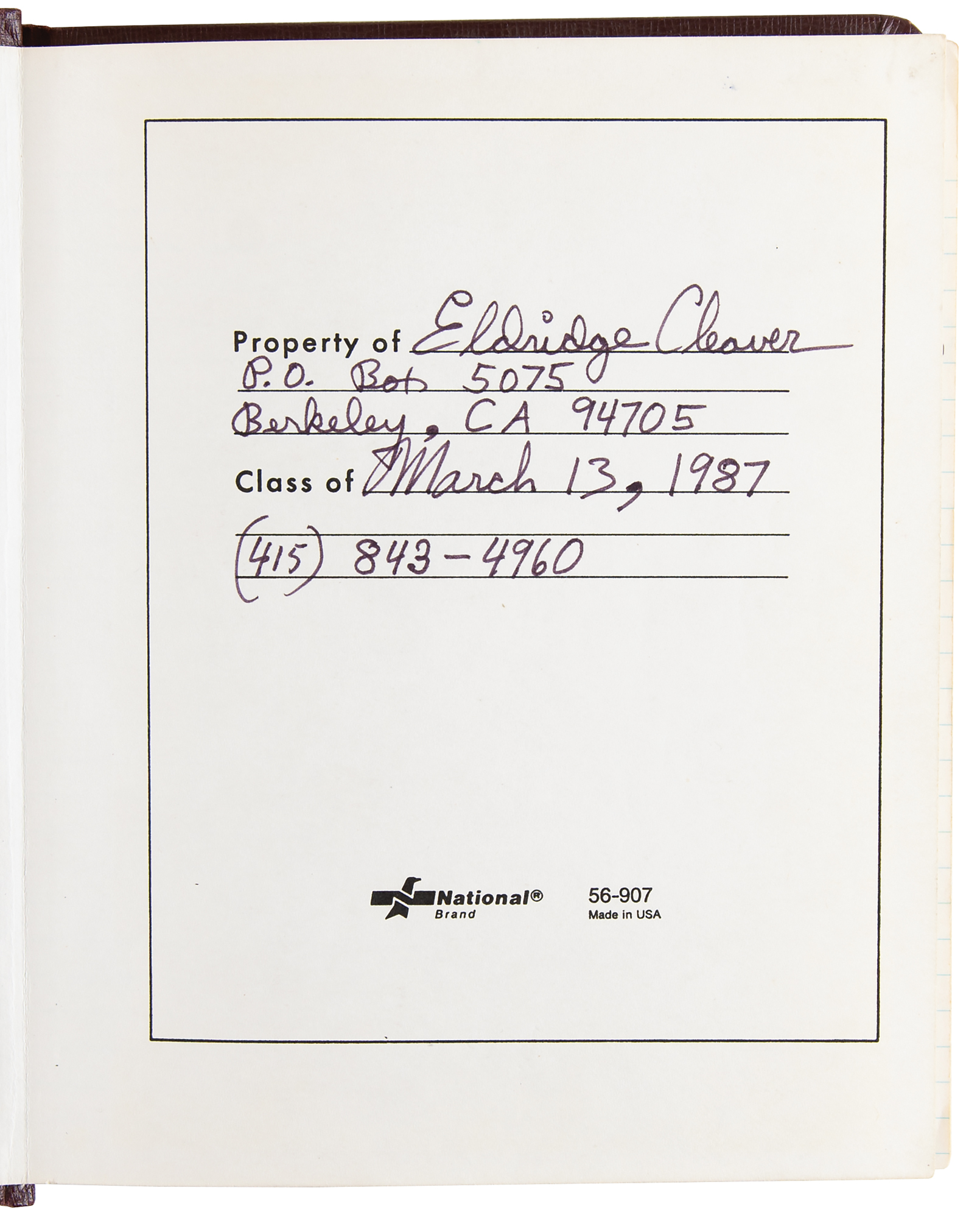 Circa 1987 hardcover notebook, 8 x 9.75, 300 pages (64 with Cleaver’s handwriting), the first page filled out in black felt tip by Cleaver with his ownership signature, “Eldridge Cleaver,” and contact information. Partial separation of rear cover from spine. Cleaver used this book as a partial diary, starting entries on March 13, 1987, with the last dated entry occurring on July 3, 1987. Highlighted dates and quotes include: