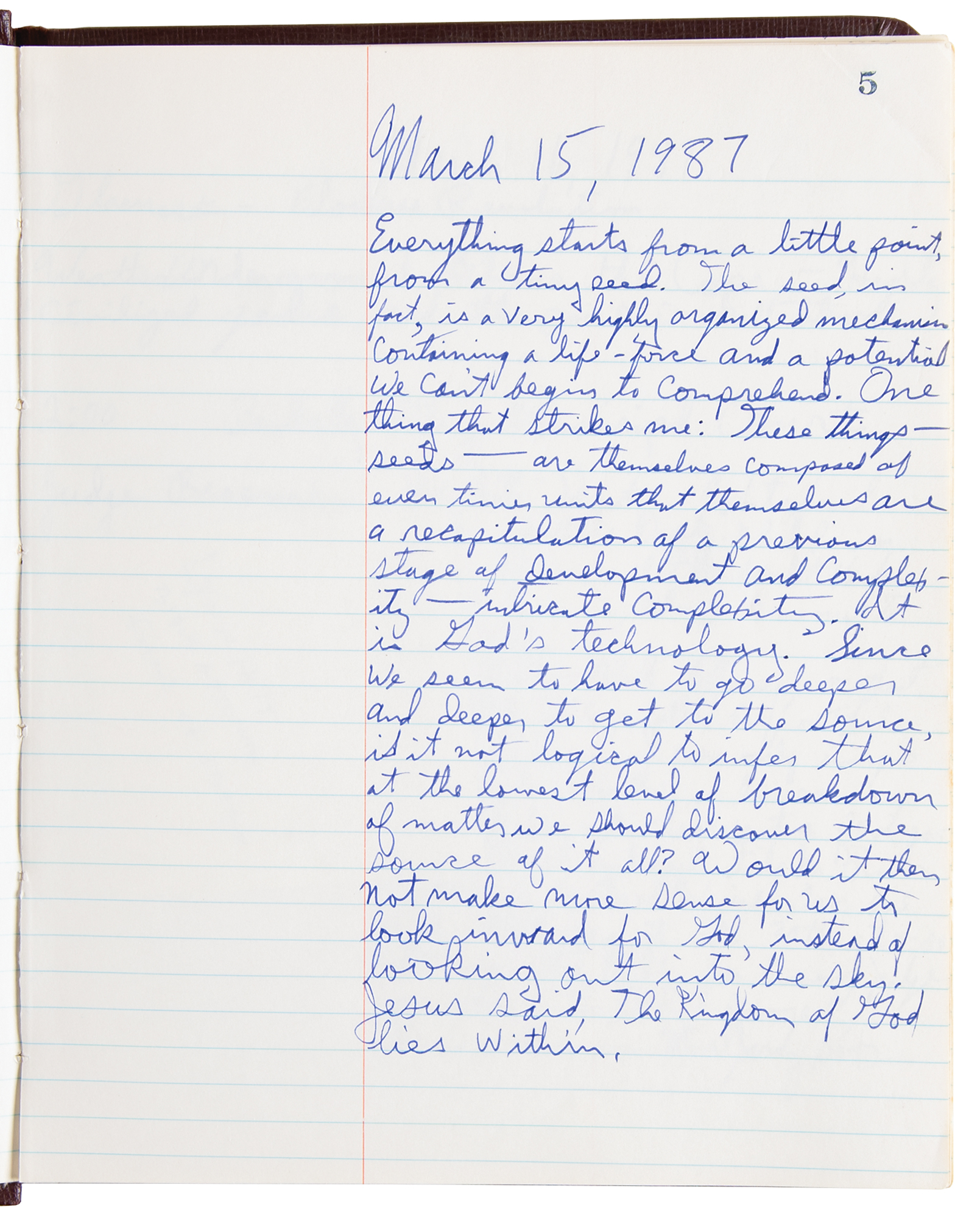 - March 15, 1987: “Everything starts from a little point, from a tiny seed. The seed, in fact, is a very highly organized mechanism containing a life-force and a potential we can't begin to comprehend. One thing that strikes me: These things—seeds—are themselves composed of even tinier units that themselves are a recapitulation of a previous stage of development and complexity—intricate complexity. It is God's technology. Since we seem to have to go deeper and deeper to get to the source, is it not logical to infer that at the lowest level of breakdown of matter we should discover the source of it all? Would it then not make more sense for us to look inward for God, instead of looking out into the sky. Jesus said, The Kingdom of God lies within."