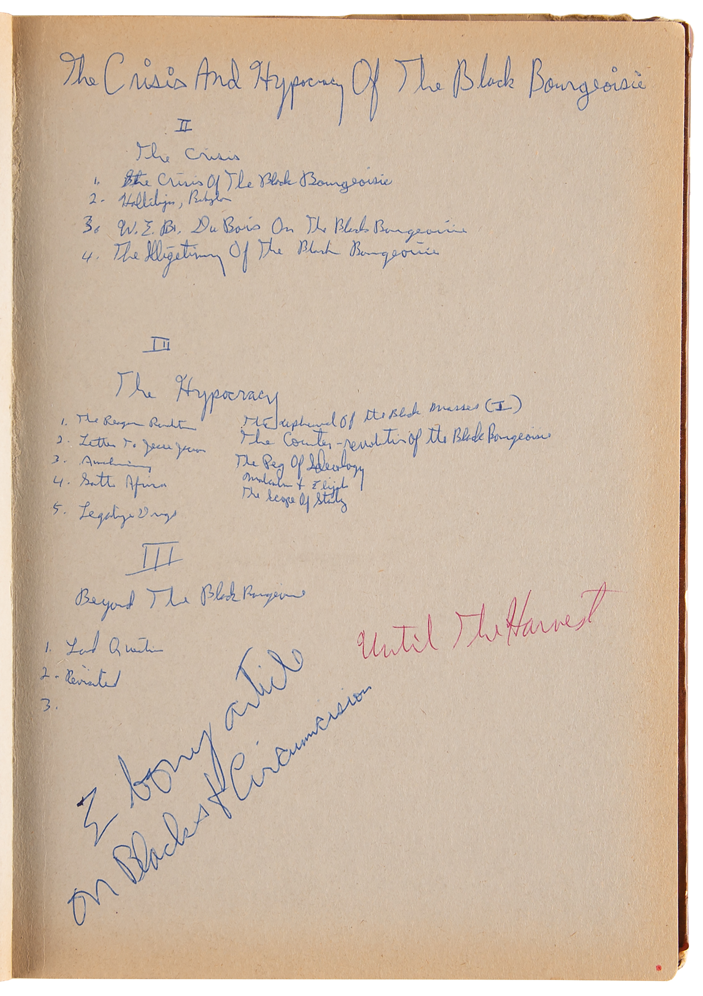 - Chapter and section titles for his article ‘The Crisis of the Black Bourgeoisie,’ which includes “3. W. E. B. DuBois on the Black Bourgeoisie,” “The Hypocracy / 1. The Reagan Revolution The Upheaval of the Black Masses (I), 2. Letter to Jesse Jackson The Counter-revolution of the Black Bourgeoisie,” “4. South Africa Malcolm & Elijah,” and “5. Legalize Drugs The Scope of Study.”