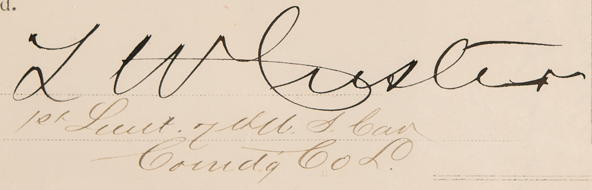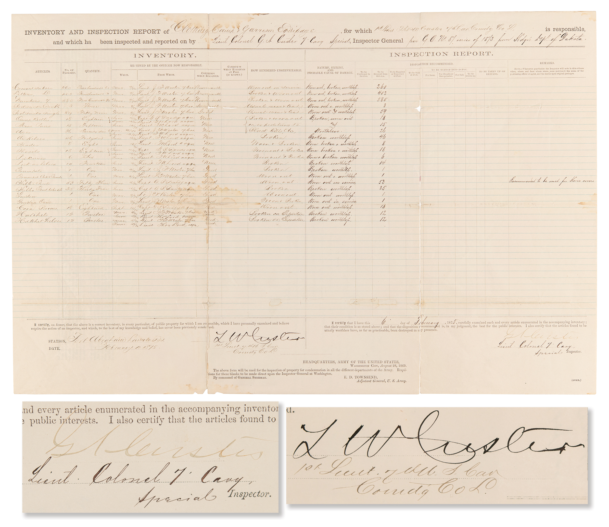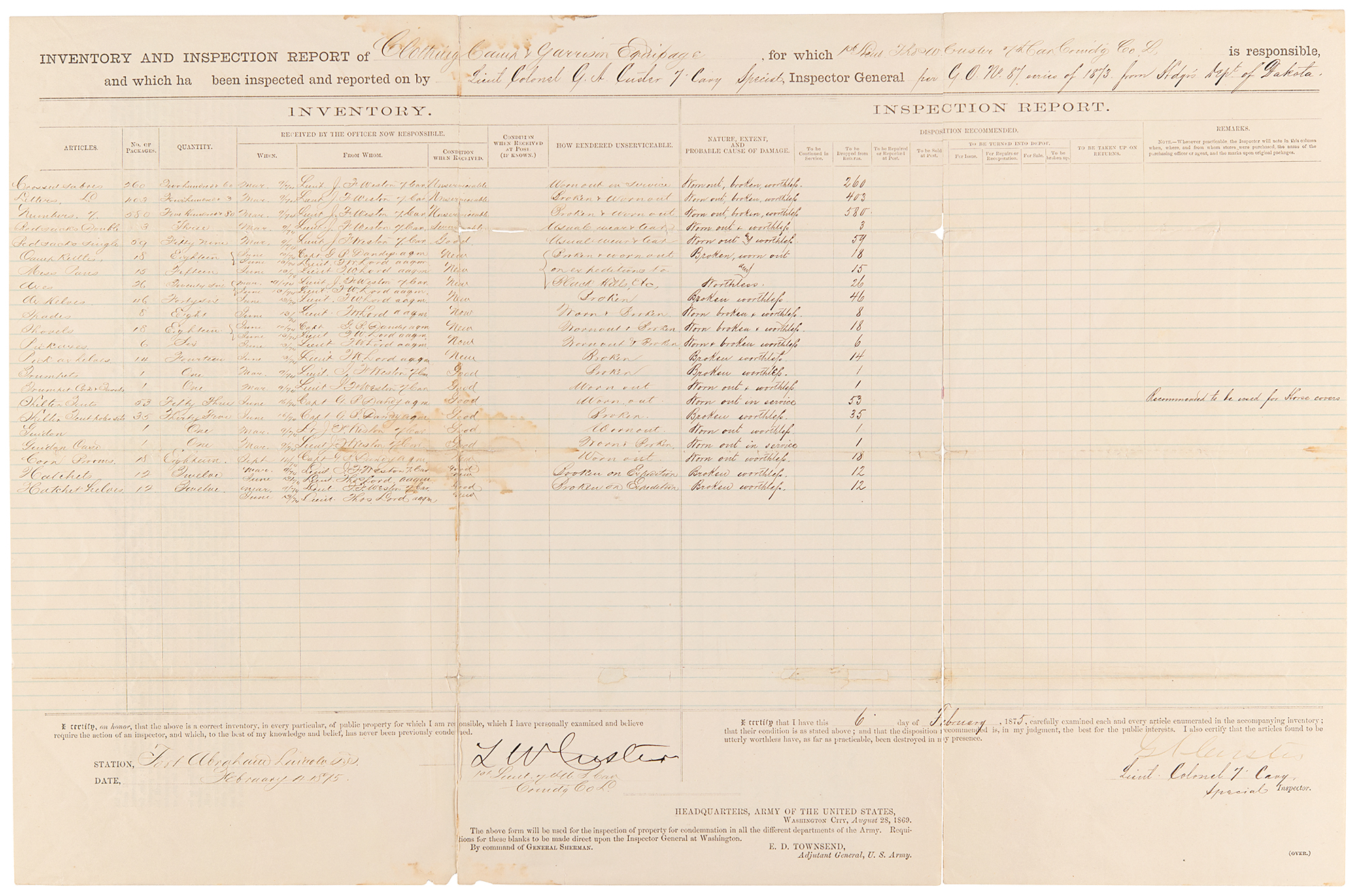 Rare partly-printed DS, signed “G. A. Custer” and "T. W. Custer," one page, 24 x 15.75, February 6, 1875. An "Inventory and Inspection Report of Clothing, Camp & Garrison Equipage…inspected and reported on by Lieut. Colonel G. A. Custer," completed at Fort Abraham Lincoln in the Dakota Territory. The report lists a large amount of equipment including "Crossed sabres," "Bed sacks," "Mess pans," "Axes," "Spades," "Shovels," "Pickaxes," "Trumpets," "Shelter tents," "Guidon," and "Hatchets," much of which is designated as "Worn out, broken, worthless," with allusions to their service in the field: "Broken & worn out on expeditions to Black Hills, etc." Only the shelter tents were deemed worth saving, and recommended "to be used for Horse covers." Signed at the conclusion in ink by Lieutenant Colonel George Armstrong Custer ("G. A. Custer"), and countersigned by his younger brother, First Lieutenant Thomas W. Custer ("T. W. Custer")—both of whom would perish at Little Bighorn. In very good condition, with full separations along folds. An outstanding report from the last frontier post Custer and his immediate command were stationed, one year before marching to the Little Bighorn.