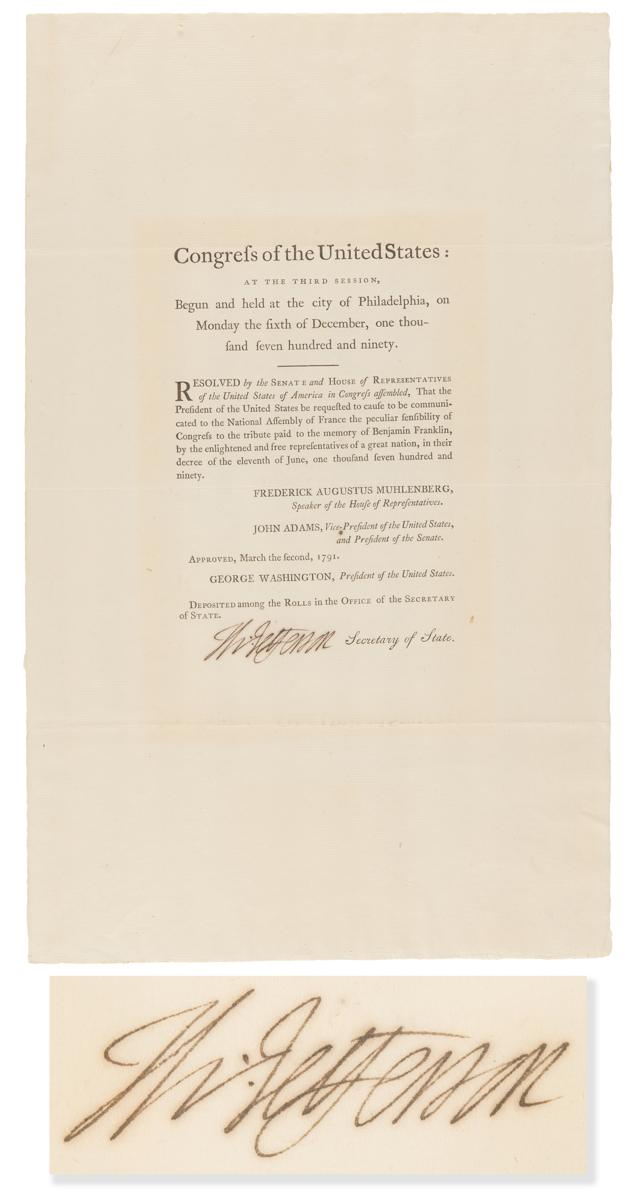 DS, signed “Th: Jefferson,” one page, 9.25 x 15, March 2, 1791. Official printing of a resolution passed by the First Congress of the United States during its Third Session, in full: "Resolved by the Senate and House of Representatives of the United States of America in Congress assembled, That the President of the Unites States be requested to cause to be communicated to the National Assembly of France the peculiar sensibility of Congress to the tribute paid to the memory of Benjamin Franklin, by the enlightened and free representatives of a great nation, in their decree of the eleventh of June, one thousand seven hundred and ninety." Imprinted at the conclusion with the names of Speaker Frederick Muhlenberg, Vice President John Adams, and President George Washington, and prominently signed below in ink by Secretary of State Thomas Jefferson. In fine condition, with a faint block of toning from prior display.