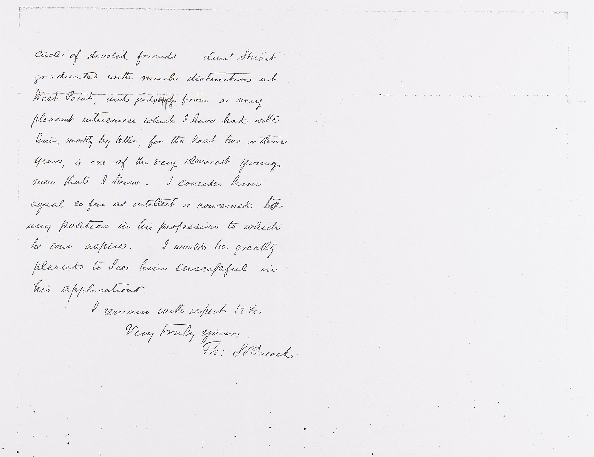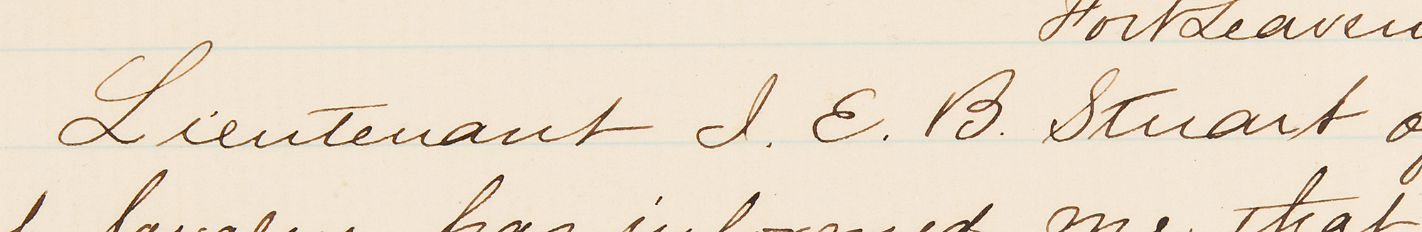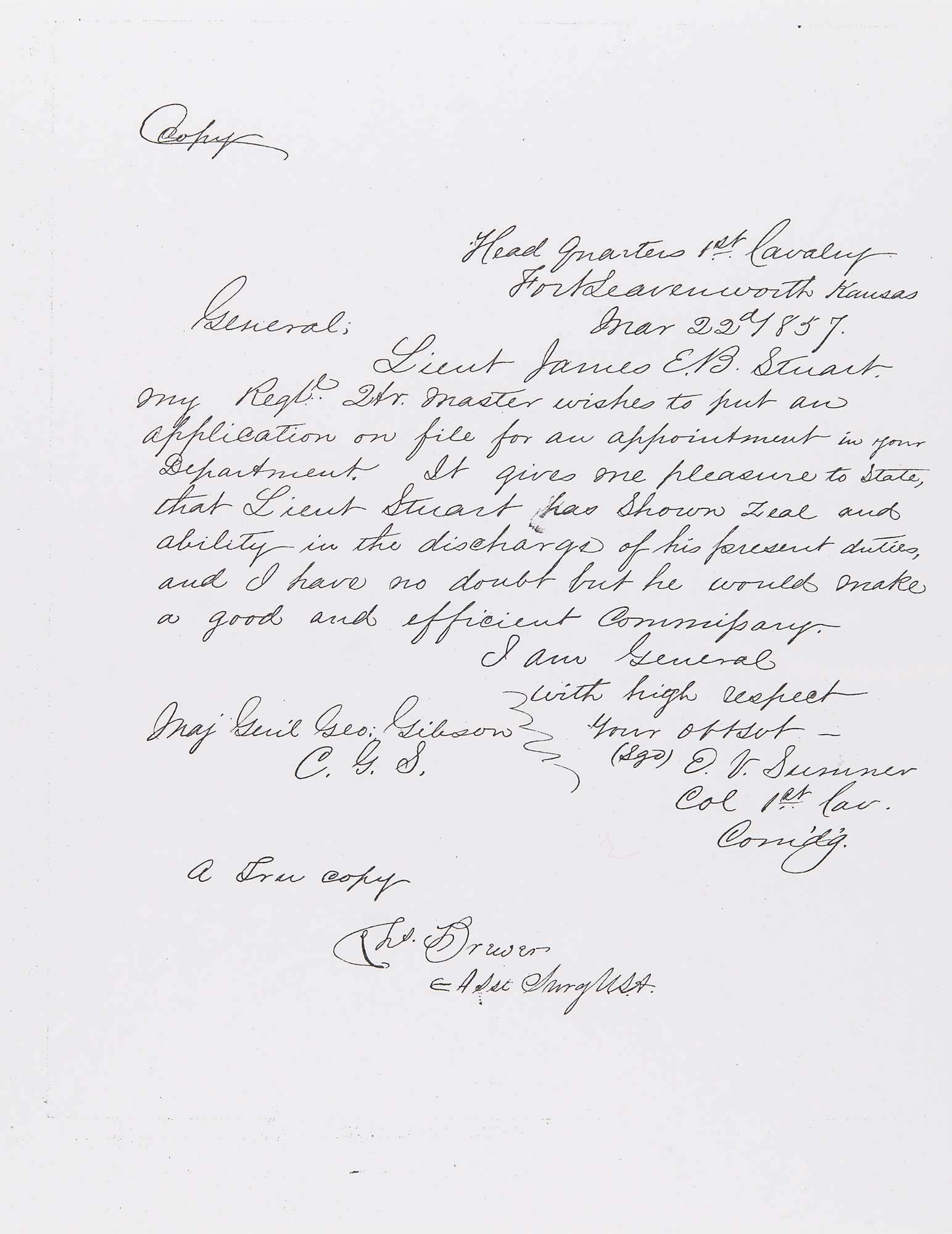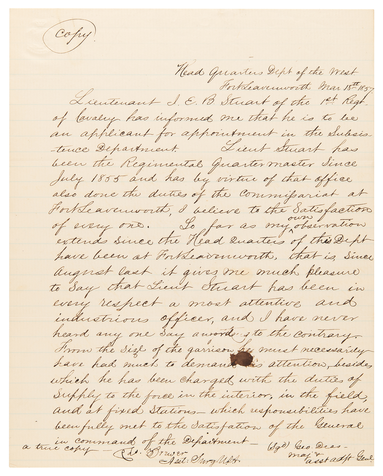 Third-person ALS by J. E. B. Stuart, signed three times within the text as “Lieutenant J. E. B. Stuart” and “Lieut. Stuart,” one page, 7.75 x 9.75, March 18, 1857. Marked “Copy” and addressed from “Head Quarters Dept. of the West, Fort Leavenworth [Kansas],” a handwritten letter of recommendation written on behalf of J. E. B. Stuart for himself. This retained true copy highlights Stuart’s qualities as a top candidate for a position in the Subsistence Department and was sent on his behalf by George Deas, Major and Asst. Adjt. Gen. (later a Confederate Lt. Col.). It reads, in full: “Lieutenant J. E. B. Stuart of the 1st Regt. of Cavalry has informed me that he is to be an applicant for appointment in the Subsistence Department. Lieut. Stuart has been the Regimental Quartermaster since July 1855 and has by virtue of that office also done the duties of the Commissariat at Fort Leavenworth, I believe to the Satisfaction of every one. So far as my own observation extends since the Head Quarters of this Dept. have been at Fort Leavenworth, that is, since Aug. last, it gives me much pleasure to say that Lieut. Stuart has been in every respect a most attentive and industrious officer, and I have never heard any one say a word to the contrary. From the size of the garrison he must necessarily have had much to demand his attention, besides which he has been charged with the duties of Supply to the force in the interior, in the field, and at fixed Stations, which responsibilities have been fully met to the satisfaction of the General in command of the Department.” The lower left bears an attestation by “Ch’s. Brewer, Asst. Surg. U.S.A.” that this letter is “a true copy,” with Stuart signing Deas’s name in the lower right. In fine condition.