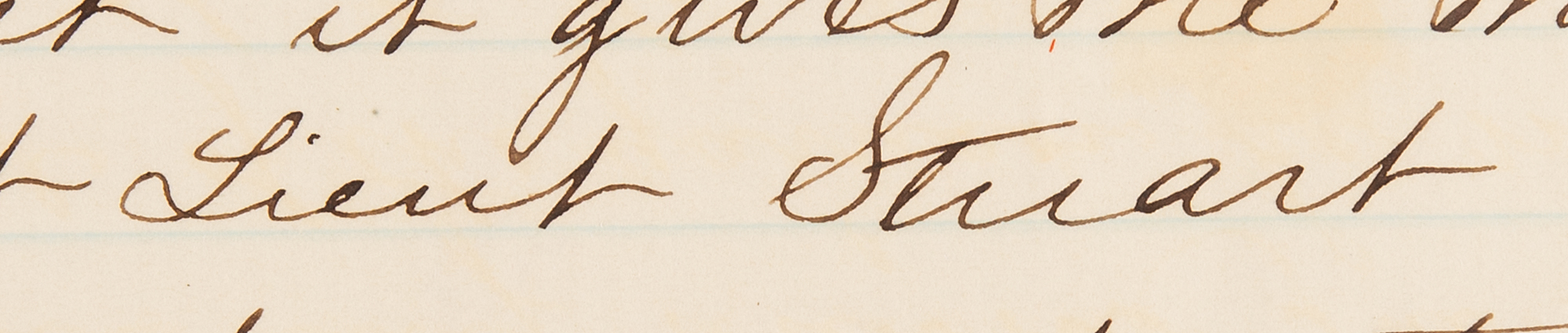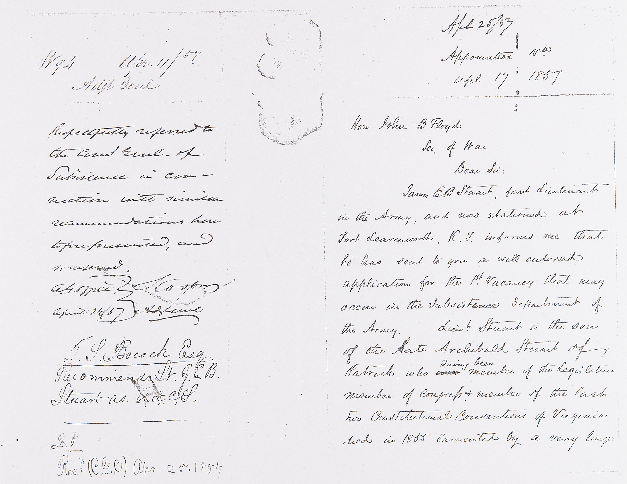 Accompanied by copies of letters from future Union General Edwin Vose Sumner (March 22, 1857) and Virginia Congressman Thomas S. Bocock (April 17, 1857), both proffering hearty letters of recommendation for Stuart’s placement in the department of Commissary General George Gibson, a post he failed to obtain. The mention of July 1855 refers to the creation of the 1st Cavalry at Fort Leavenworth. At the time of writing, Stuart was serving as a Union officer and was regularly skirmishing with Indians and riding the delicate line between anti- and pro-slavery guerrillas in Bleeding Kansas. The letter showcases his ambition as he sought advancement to the Subsistence Department and highlights the meteoric rise of one of the military heroes of the South, whose life would be cut short at the age of 31.