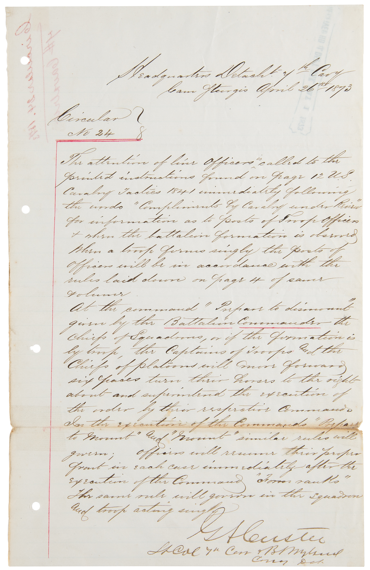 Extremely rare manuscript DS signed “G. A. Custer, Lt. Col. 7th Cav. & Bt. Mg. Genl,” one page, 8 x 12.5, April 26, 1873. Sent from “Headquarters Detach’t 7th Cav’y, Cam[p] Sturgis,” a document entitled “Circular No. 24” and addressed to the officers of Custer's 7th Calvary, providing new orders on proper formation tactics. In full: “The attention of line officers is called to the printed instructions found on page 12, U.S. Cavalry Tactics, 1841, immediately following the words ‘Compliments by Cavalry under review,’ for information as to posts of troop officers & when the battalion formation is observed. When a troop forms singly the posts of officers will be in accordance with the rules laid down on page 4 of same volume. At the command of ‘Prepare to dismount’ given by the battalion commander, the Chief of squadrons, or if the formation is by troop, the Captains of troops and the Chiefs of platoons, will come forward paces, turn their horses to the right about and superintend the execution of the order by their respective commands. In the execution of the commands ‘Prepare to mount’ and ‘Mount’ similar rules will govern; officers will resume their proper front in each case immediately after the execution of the command ‘Form ranks.’ The same rule will govern in the squadron and troop acting singly.” Signed prominently at the conclusion by George A. Custer. In fine condition, with file holes to the left edge, and toning and an old repair the lower horizontal fold. Accompanied by a handsome engraved portrait of Custer bearing a facsimile signature. Anything signed by Custer during his leadership of the 7th Cavalry remains rare and highly sought, with this unusual document, detailing the precise reorganization of cavalry formations, offering unique insight into Custer's meticulous mindset as commander.