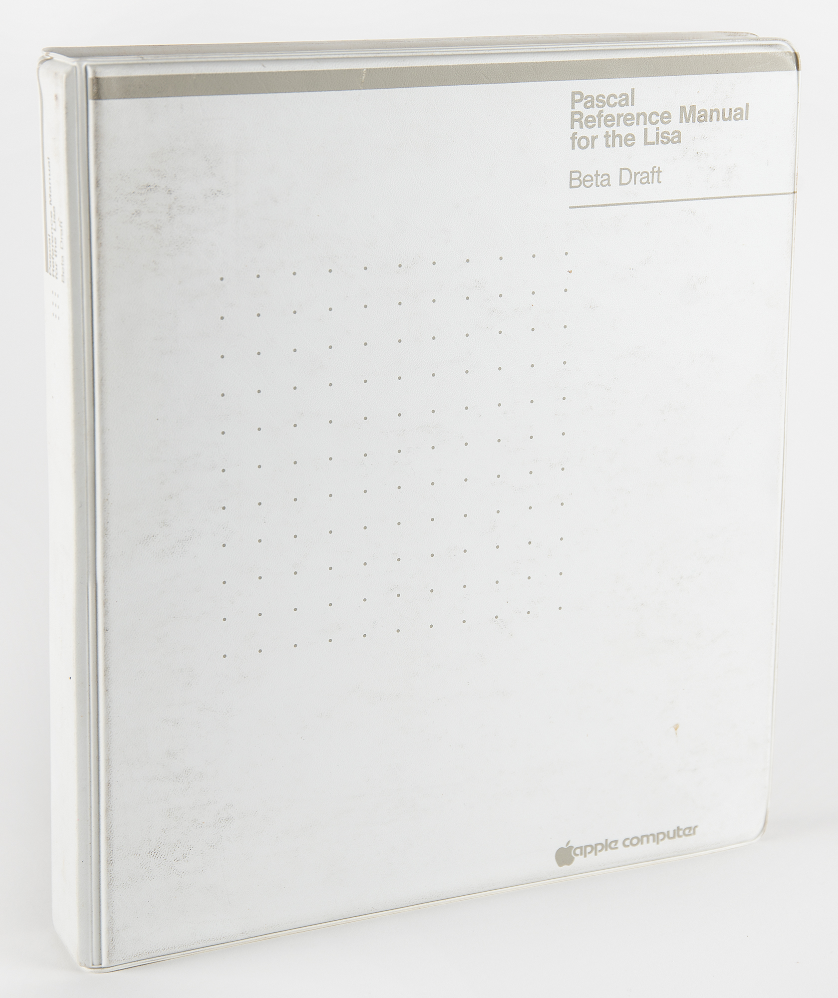 From the archives of Roger Wagner and his company at the time, Southwestern Data Systems—an Apple Computer binder labeled "Pascal Reference Manual for the Lisa - Beta Draft," containing the April 1983 beta draft of the Pascal reference manual, stamped on the title page: "A6D0191K, Pre-Rel Pascal." Includes three Apple Lisa FileWare ('Twiggy') 5.25˝ floppy disks for Pascal, all dated 1983 as the "A5+ Release," labeled "Pascal 0," "Pascal 1," and "Pascal 2." In overall very good to fine condition, with a few tears to binding holes of the reference manual's loose-leaf pages.
