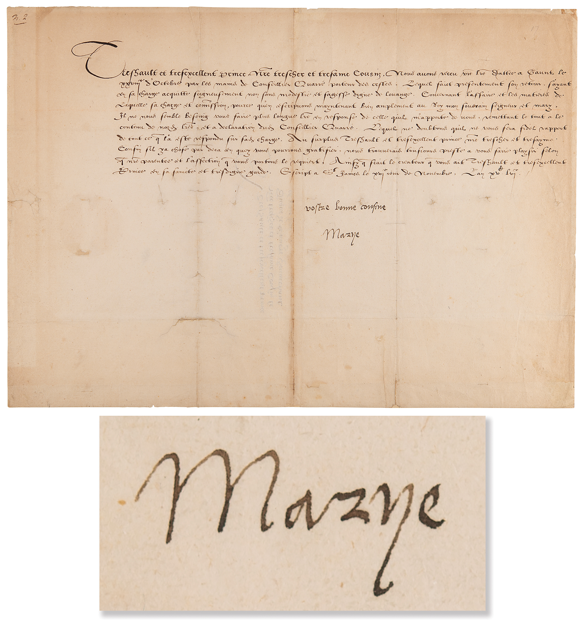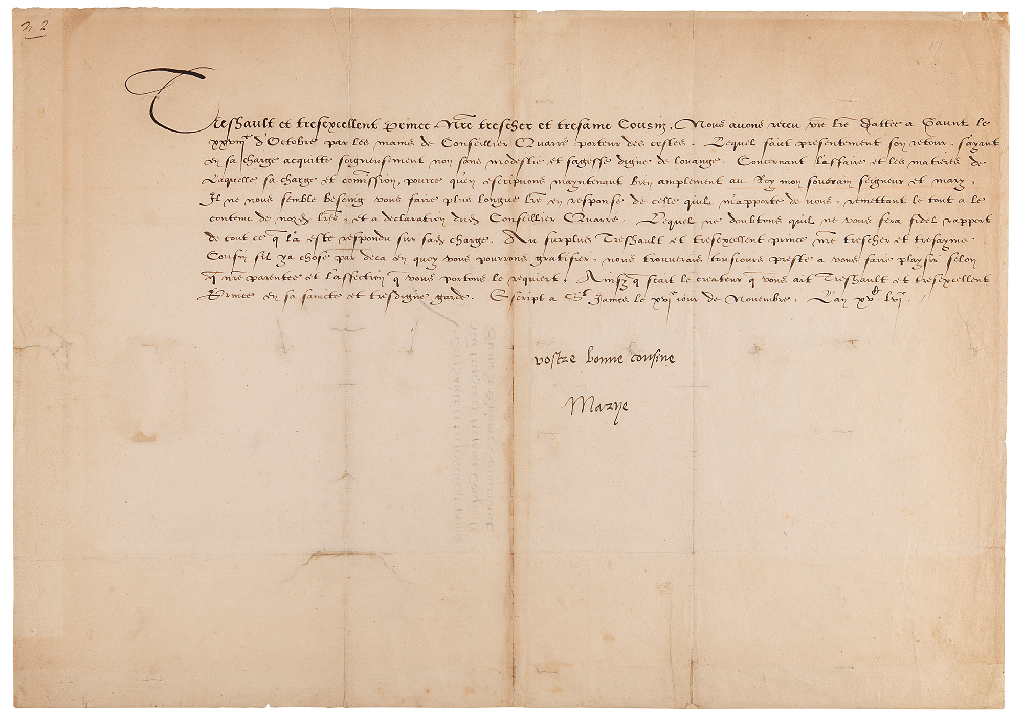 Queen of England and Ireland from 1553 until her death, whose brutal persecution of Protestants earned her the nickname 'Bloody Mary' (1516–1558). Rare LS in French, signed “votre bonne cousine, Marye,” one page, 15.25 x 10.75, November 16, 1556. Letter to her cousin, the Duke of Savoy, relaying news and making a recommendation. In very good to fine condition, with light soiling, toning from prior display, and professional repairs to several small tears.