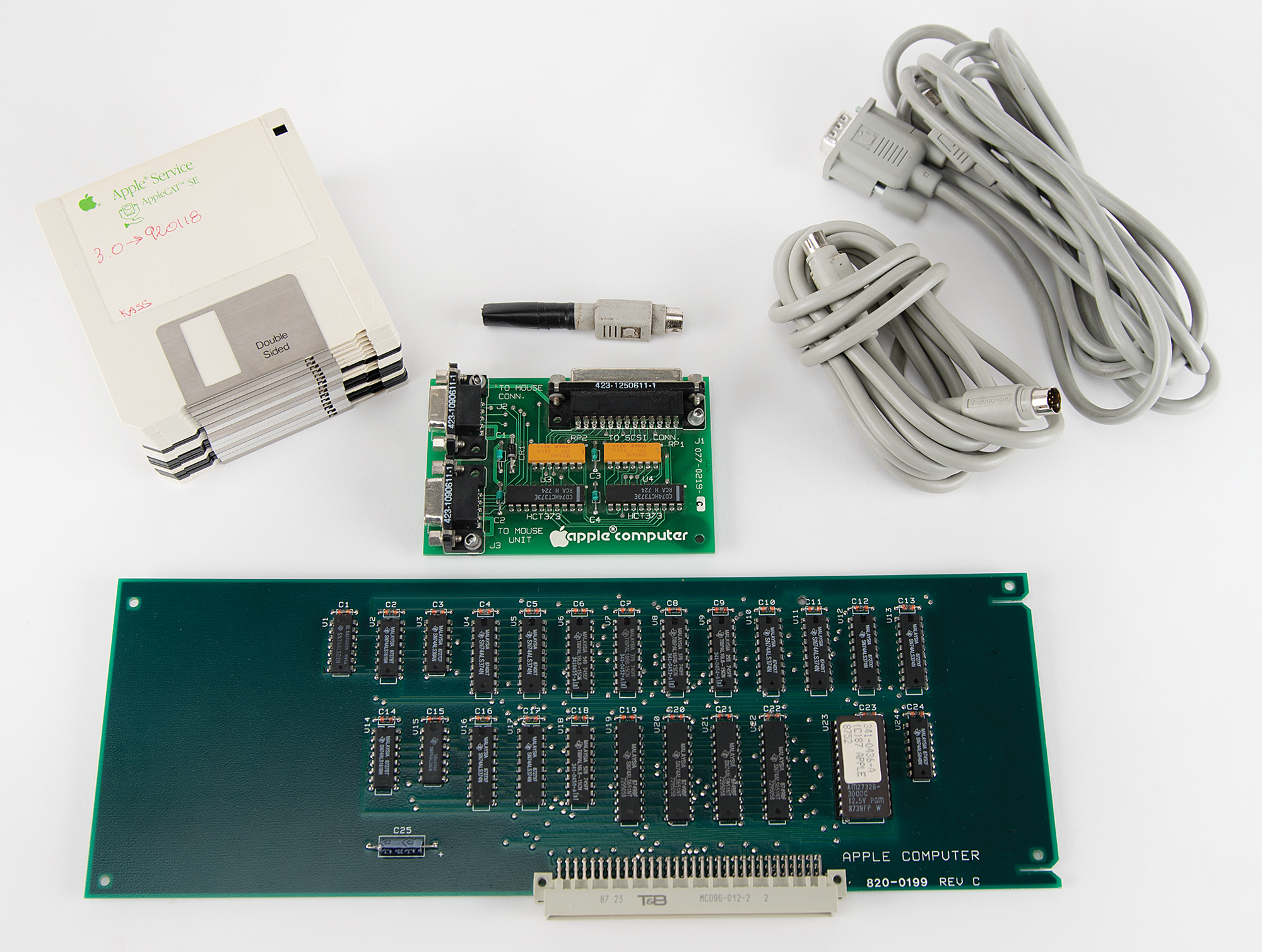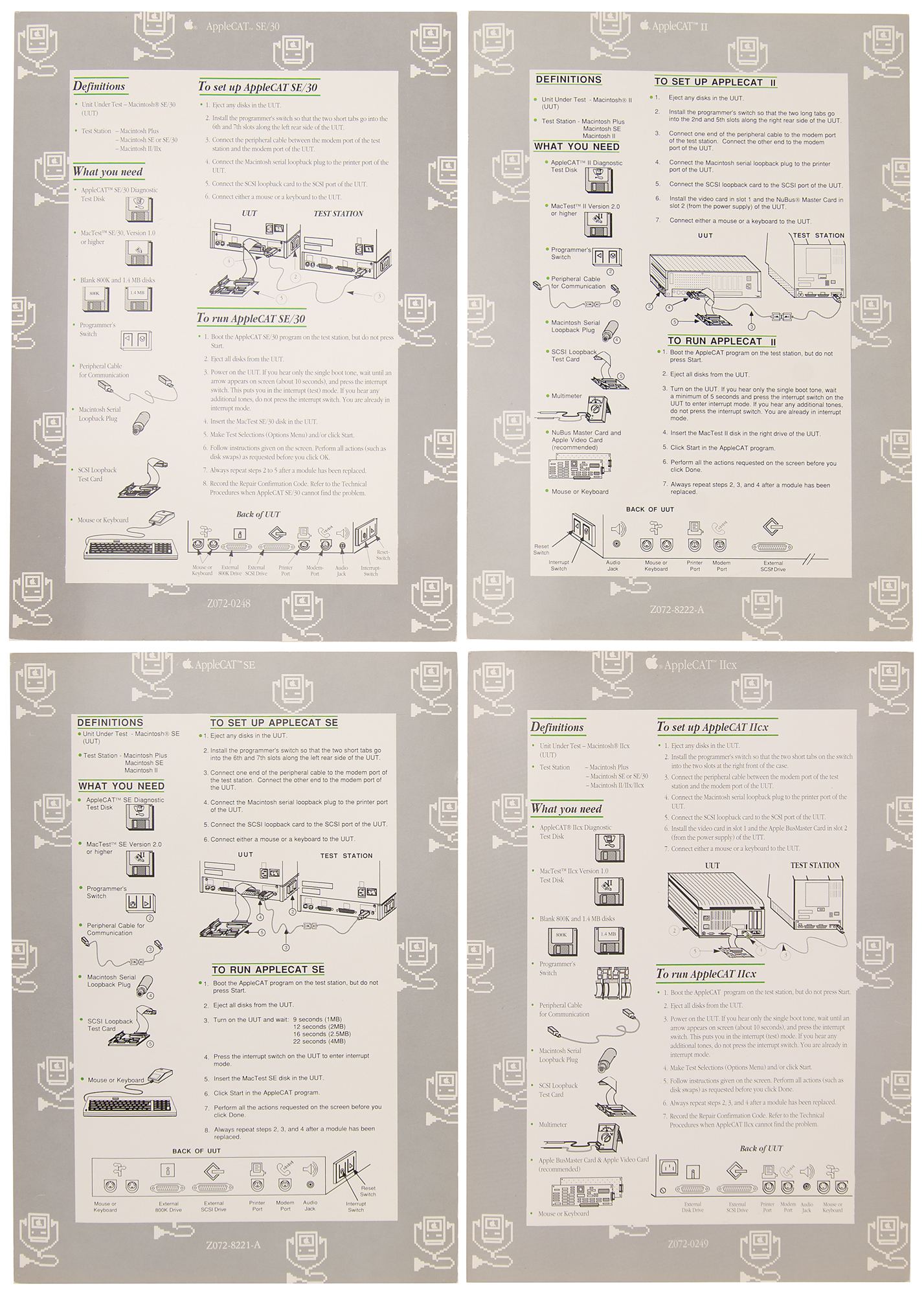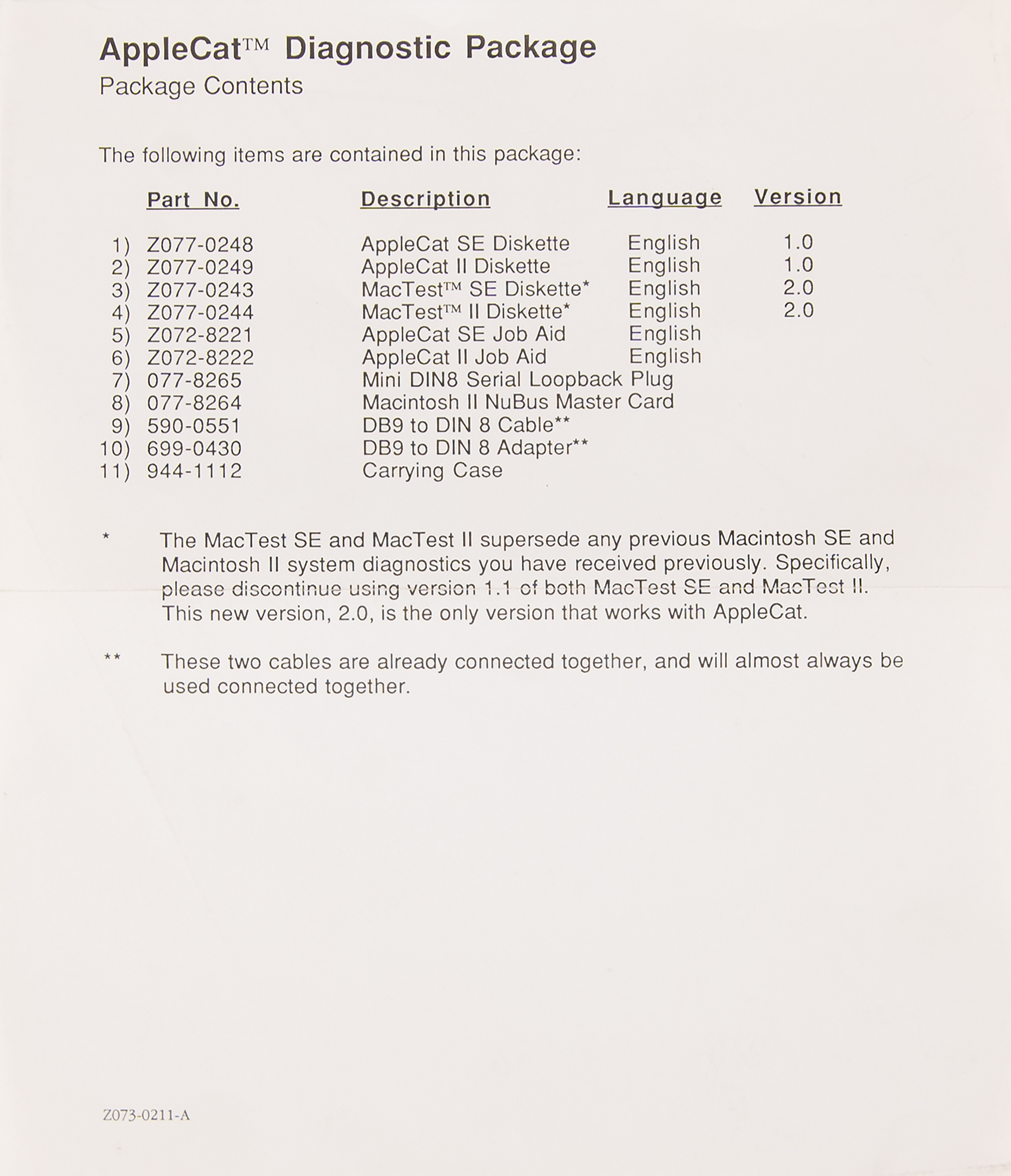 Original AppleCAT diagnostic package, housed in its original black 15˝ x 11˝ x 3˝ briefcase imprinted in green with an 8-bit stethoscope logo and "AppleCAT." Contents include: an Apple Computer SCSI loopback test card, Apple Busmaster (Rev C) board, DB9 to DIN 8 cable, nine original Apple Service diskettes (AppleCAT II, AppleCAT II/IIx, AppleCAT IIcx, AppleCAT SE, AppleCAT SE/30, MacTest II, MacText IIcx, MacTest SE/30), and a few other related cables. Also includes related paperwork and several non-original copied floppy disks. In very good to fine condition.