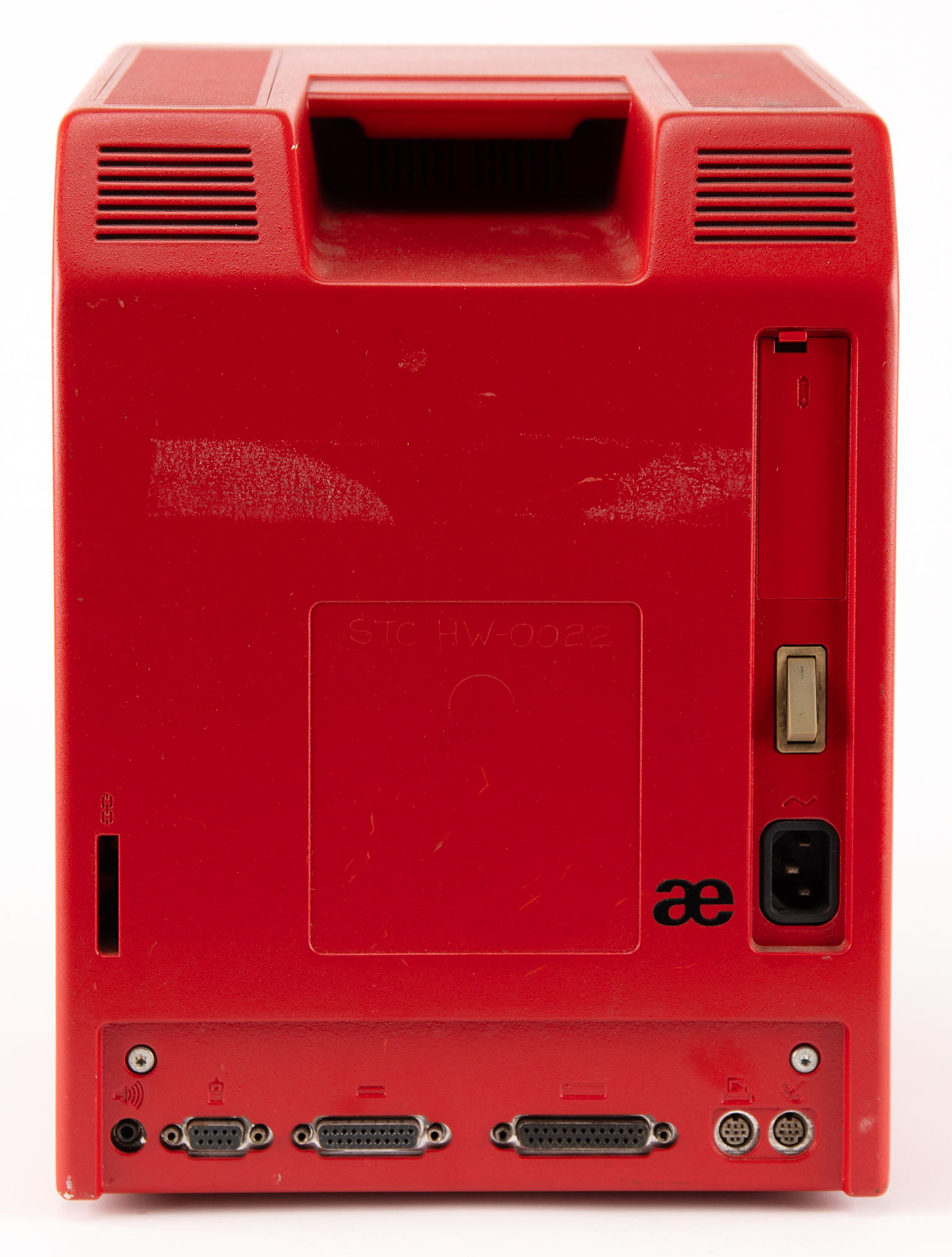 Unusual Apple Macintosh Plus computer housed in a special red case prepared by Aesthetics Technology of Palo Alto, evidenced by the "AE" logo on the rear. The computer lacks serial numbers or other markings aside from a hand-etched "STC HW-0022" on the back, where the manufacturer's specification plate would be. Tested, working, and in fine cosmetic condition, with minor wear to the case.