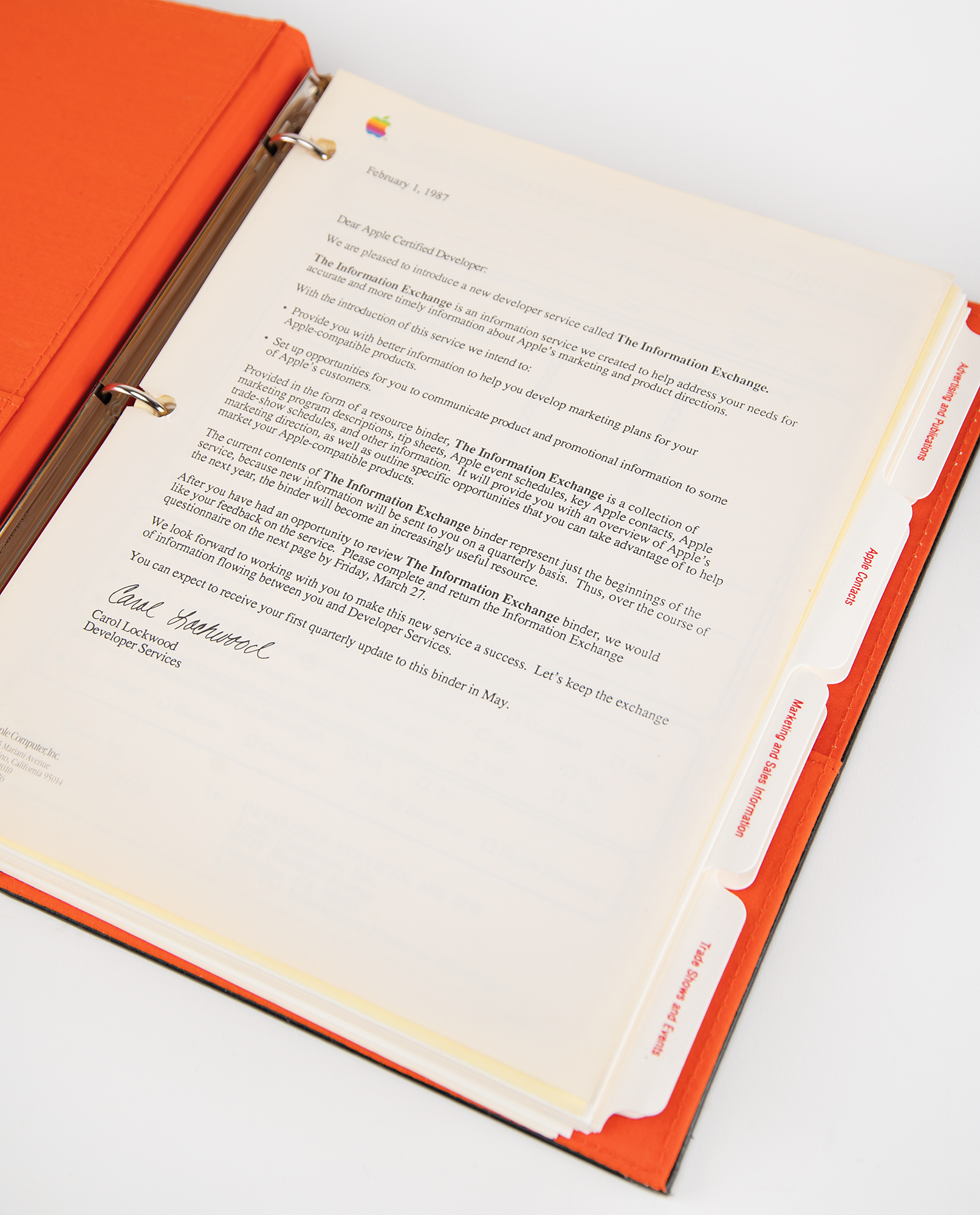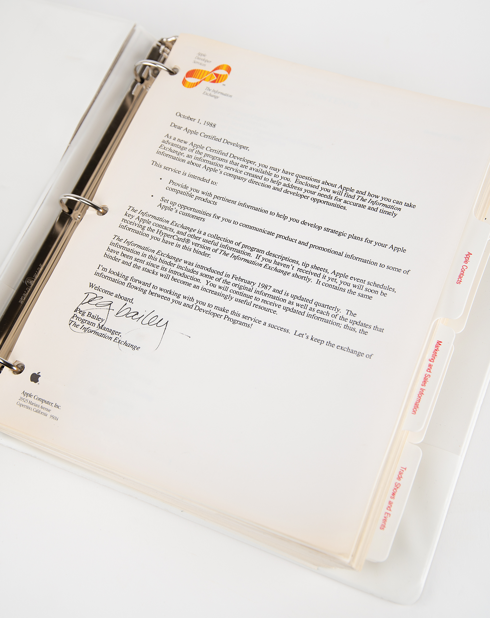 Accompanied by two "Information Exchange" binders from 1987 and 1988, distributed to Apple Certified Developers to provide information on the Apple organization, marketing and sales, advertising and publications, trade shows and events, public relations, market research, product design and support, distribution, and legal guidelines.