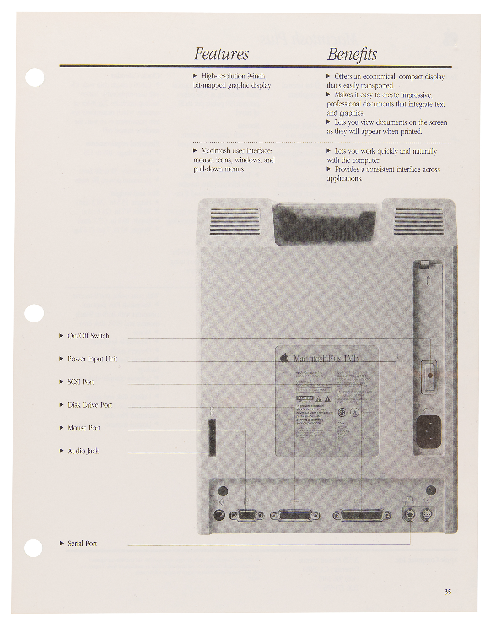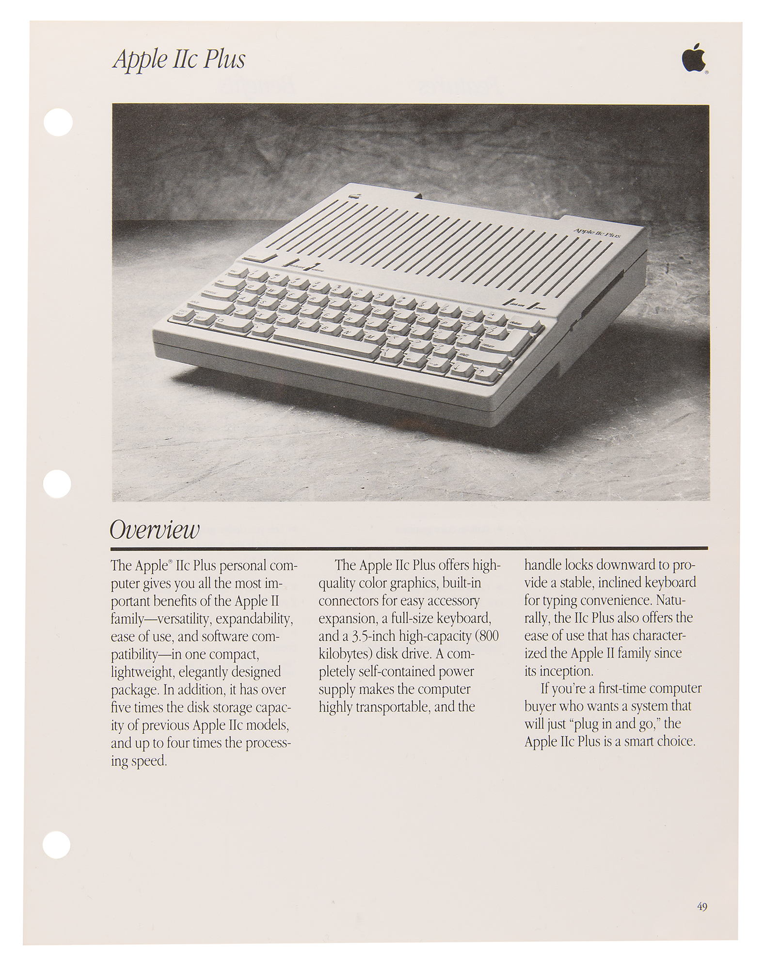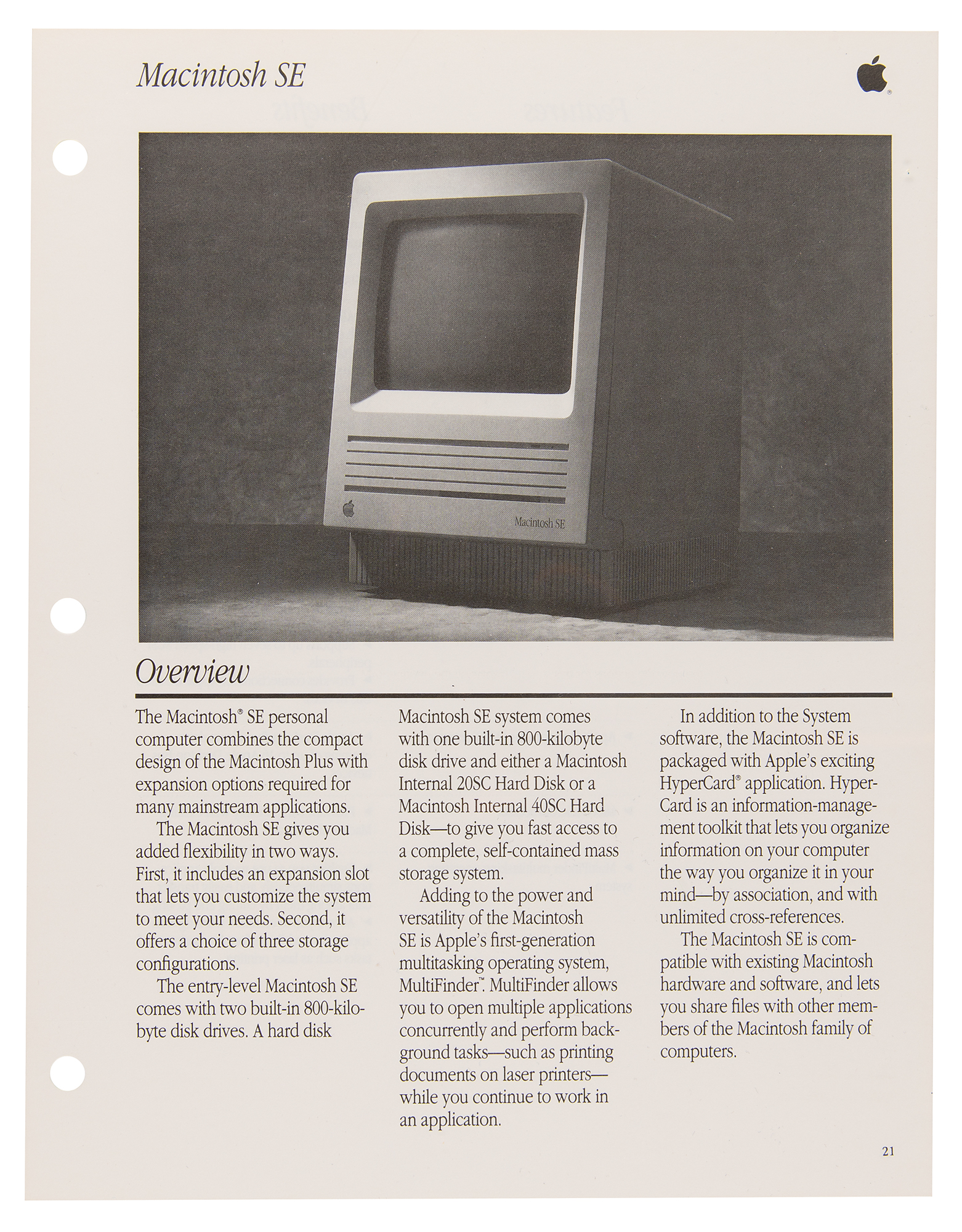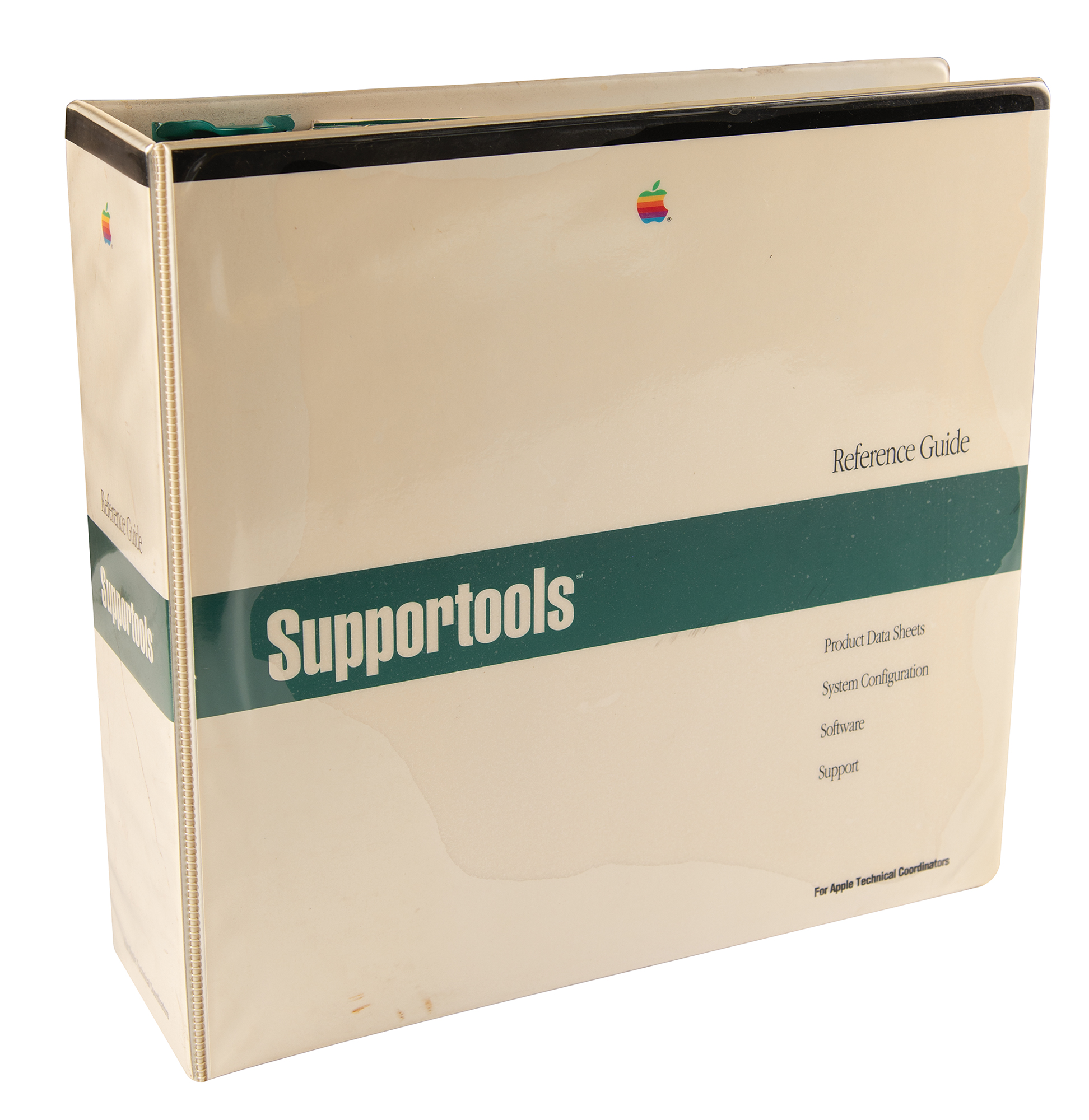 Official Apple "Supportools" reference guide produced for distribution to Apple Technical Coordinators and Authorized Apple Resellers, housed in the original 12˝ x 11.75˝ binder. Includes a program guide, support resource directory, product data sheets, system configuration overview, software data, and support information. Products listed in the guide include several computers from the Macintosh line—including the Macintosh II and variants, SE, SE/30, and Plus—and others like the Apple IIGS, IIc Plus, monitors, keyboards, disk drives, printers, and other peripherals. In fine condition.