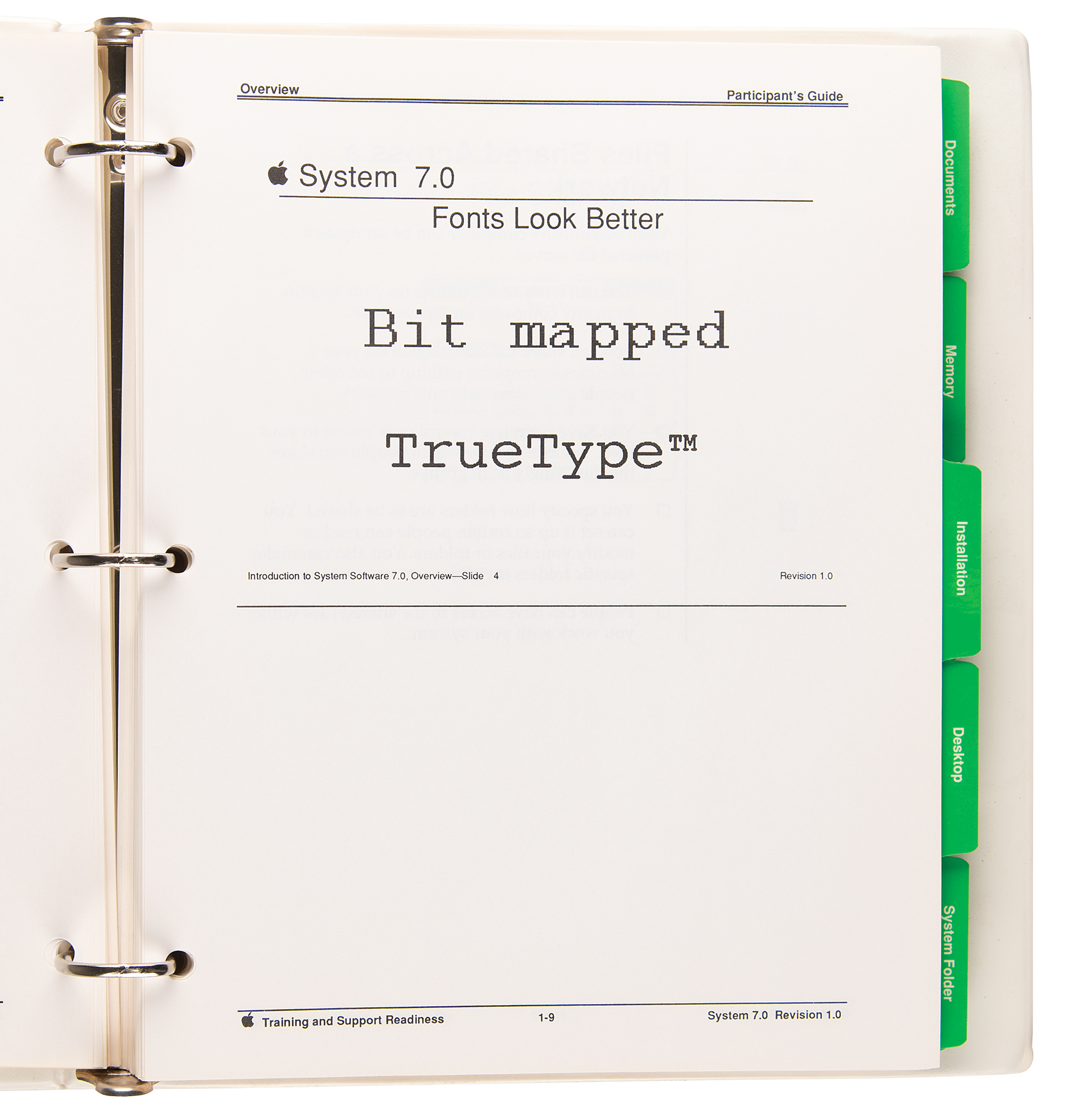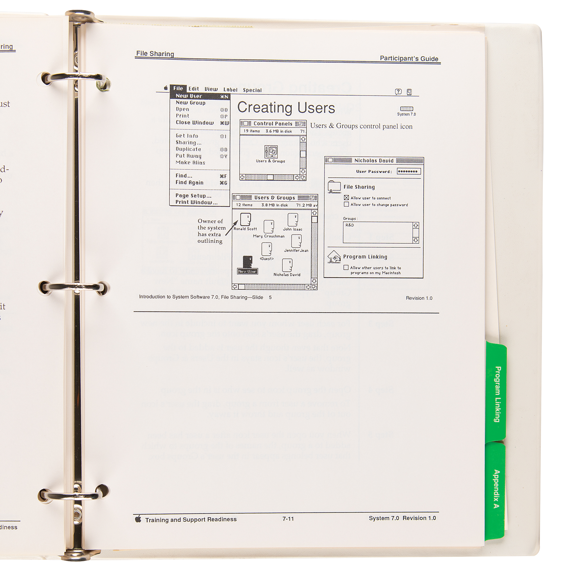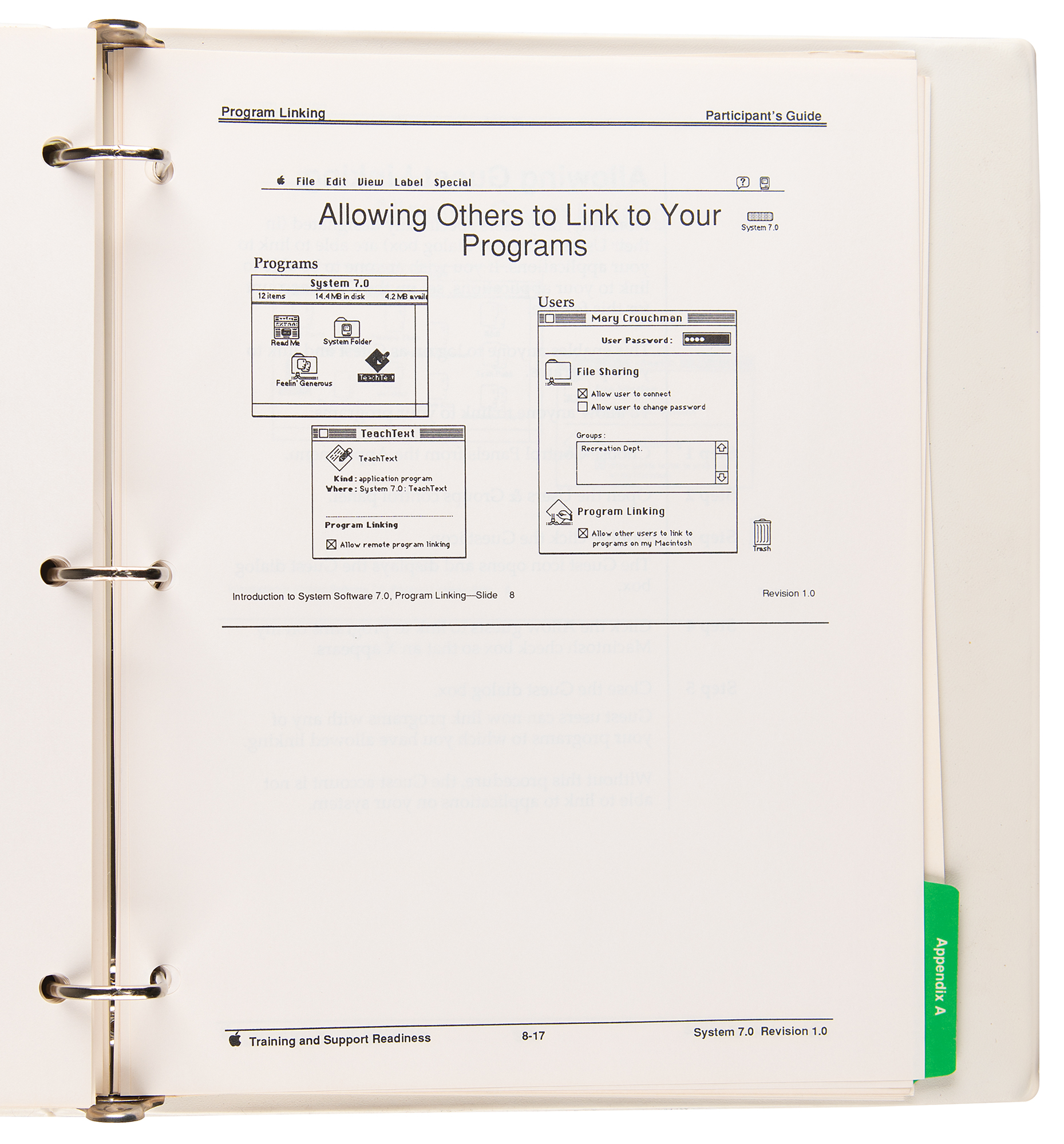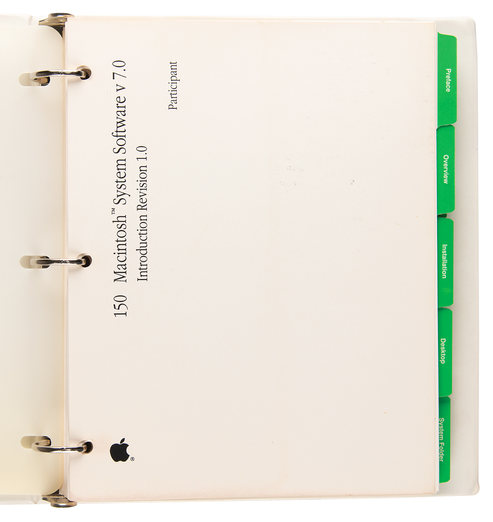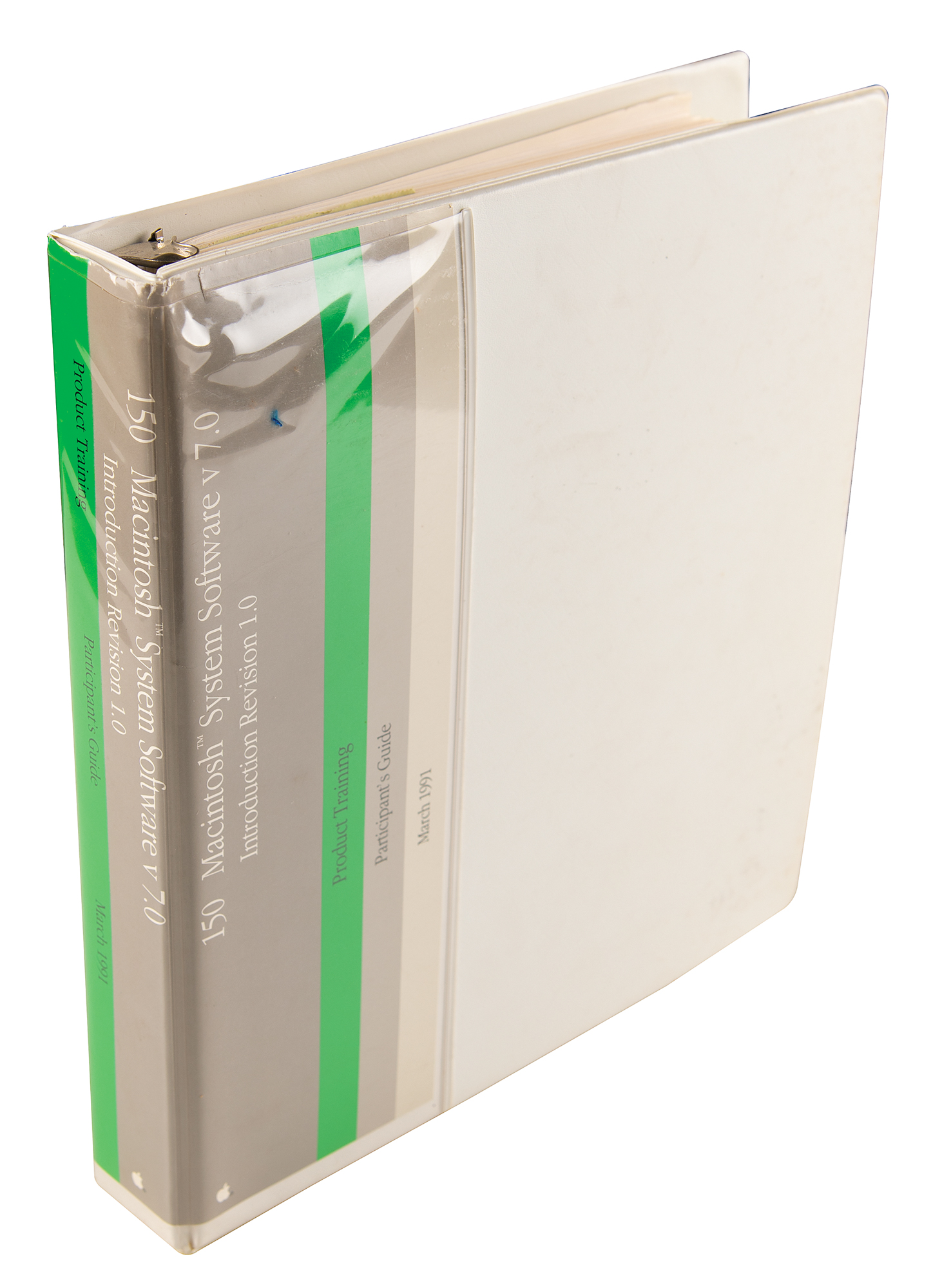 Official Apple "150 Macintosh System Software v 7.0 Product Training Participant's Guide," issued in March 1991, housed in a 10.75 x 11.5 binder, comprising ten tabbed section: "Preface," "Overview," "Installation," "Desktop," "System Folder," "Documents," "Memory," "File Sharing," "Program Linking," and "Appendix A." In very good to fine condition.