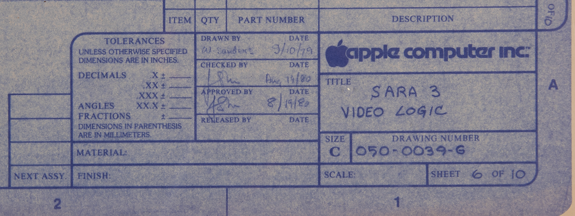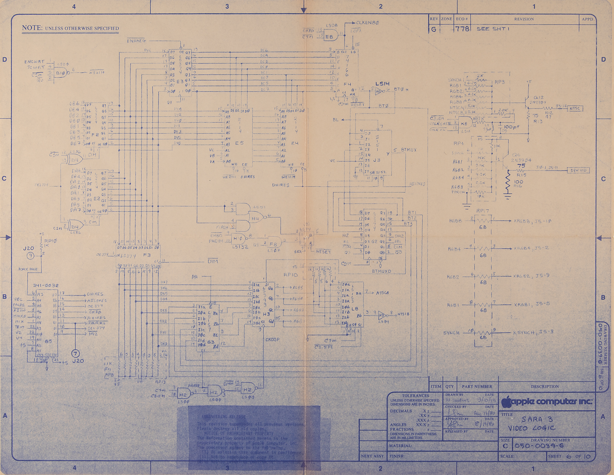 Original Apple Computer, Inc. blueprint schematic produced during the development of the Apple III (codenamed "Sara"), one page, 22 x 17, identified in the lower right corner: "Title: Sara 3 Video Logic, Drawing Number 050-0039-G…Drawn by W. Sander, 9/10/79." In fine condition.