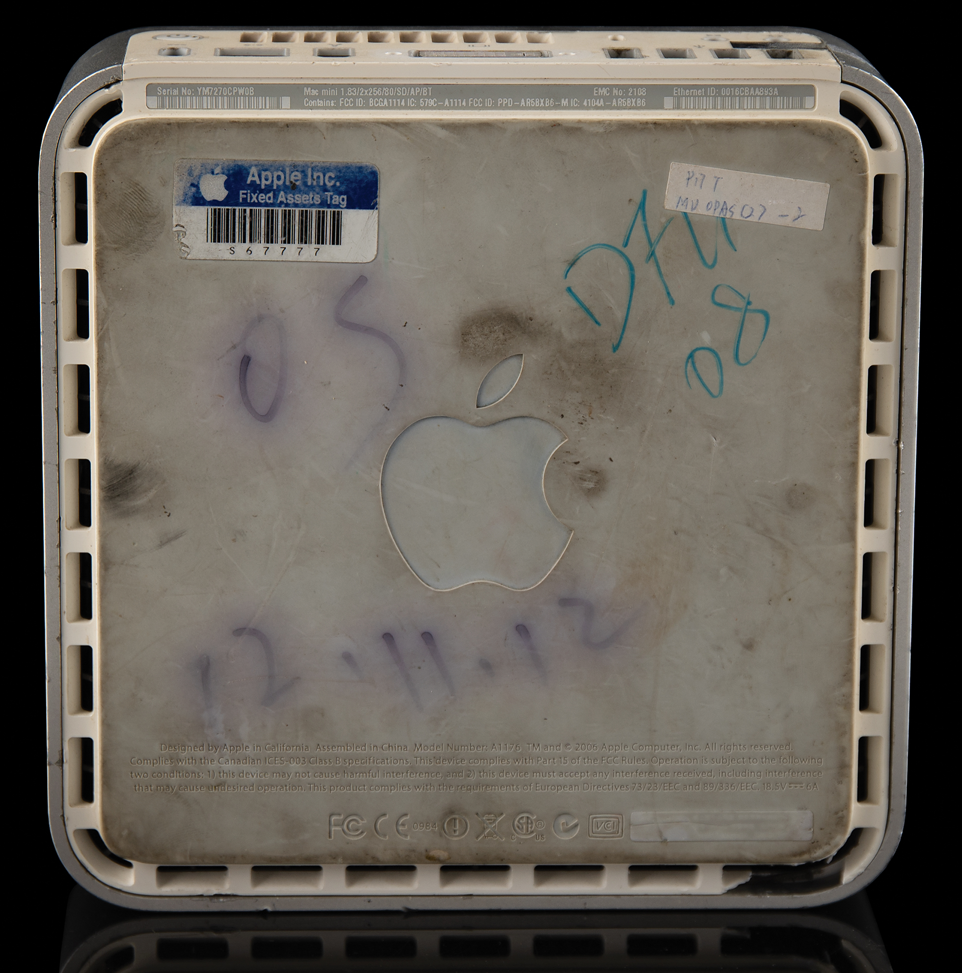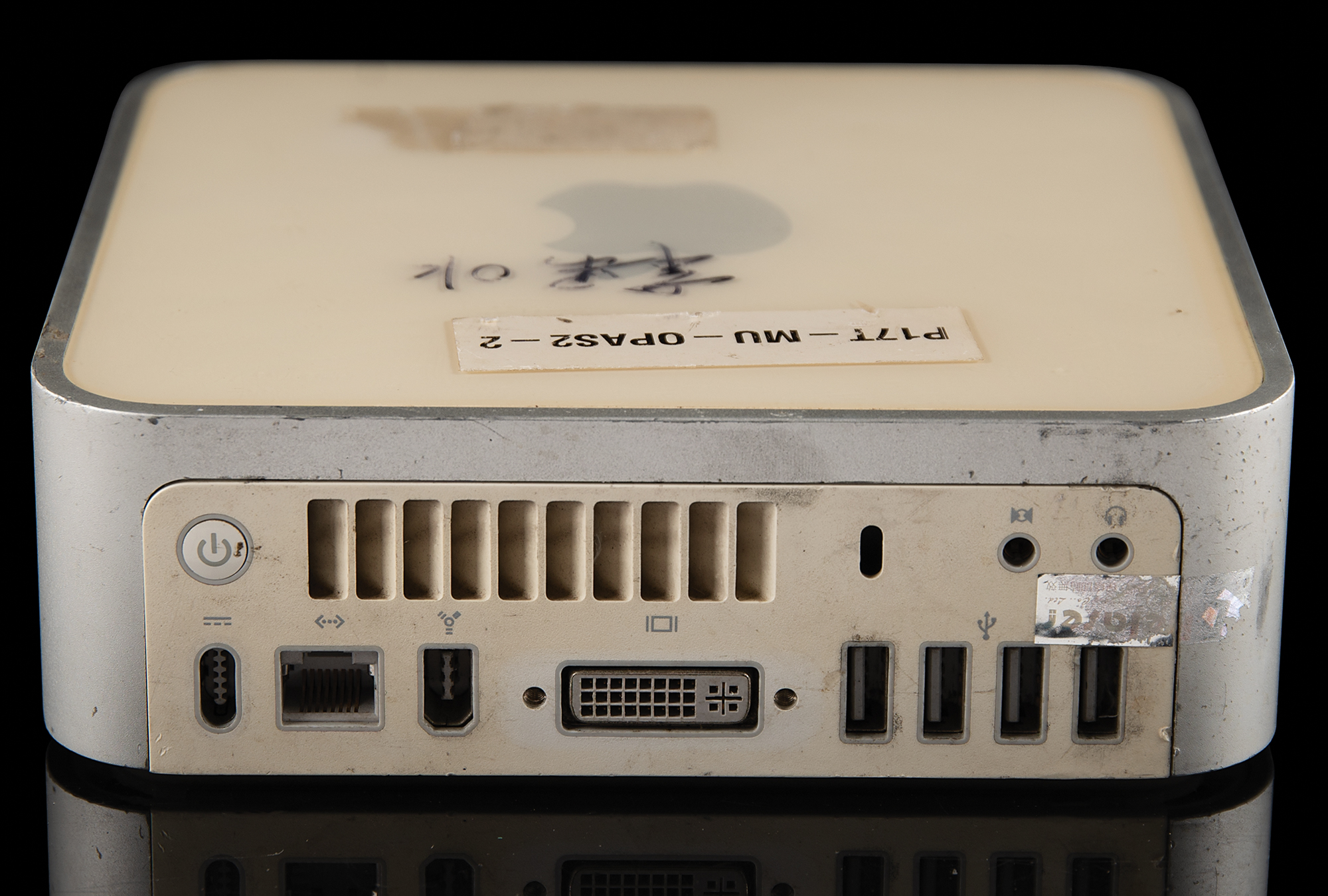 Uncommon circa 2008 Mac Mini prototype, measuring approximately 6.5˝ x 6.5˝ x 2˝, with an Apple asset tag affixed to the bottom and a label on the top: "P17T-MU-OPAS2-2." The front of the computer features the optical drive, and the rear features the power port, Ethernet port, FireWire port, DVI port, four USB ports, and audio in/out. Tested and working (but without a hard drive included), and in very good cosmetic condition.
