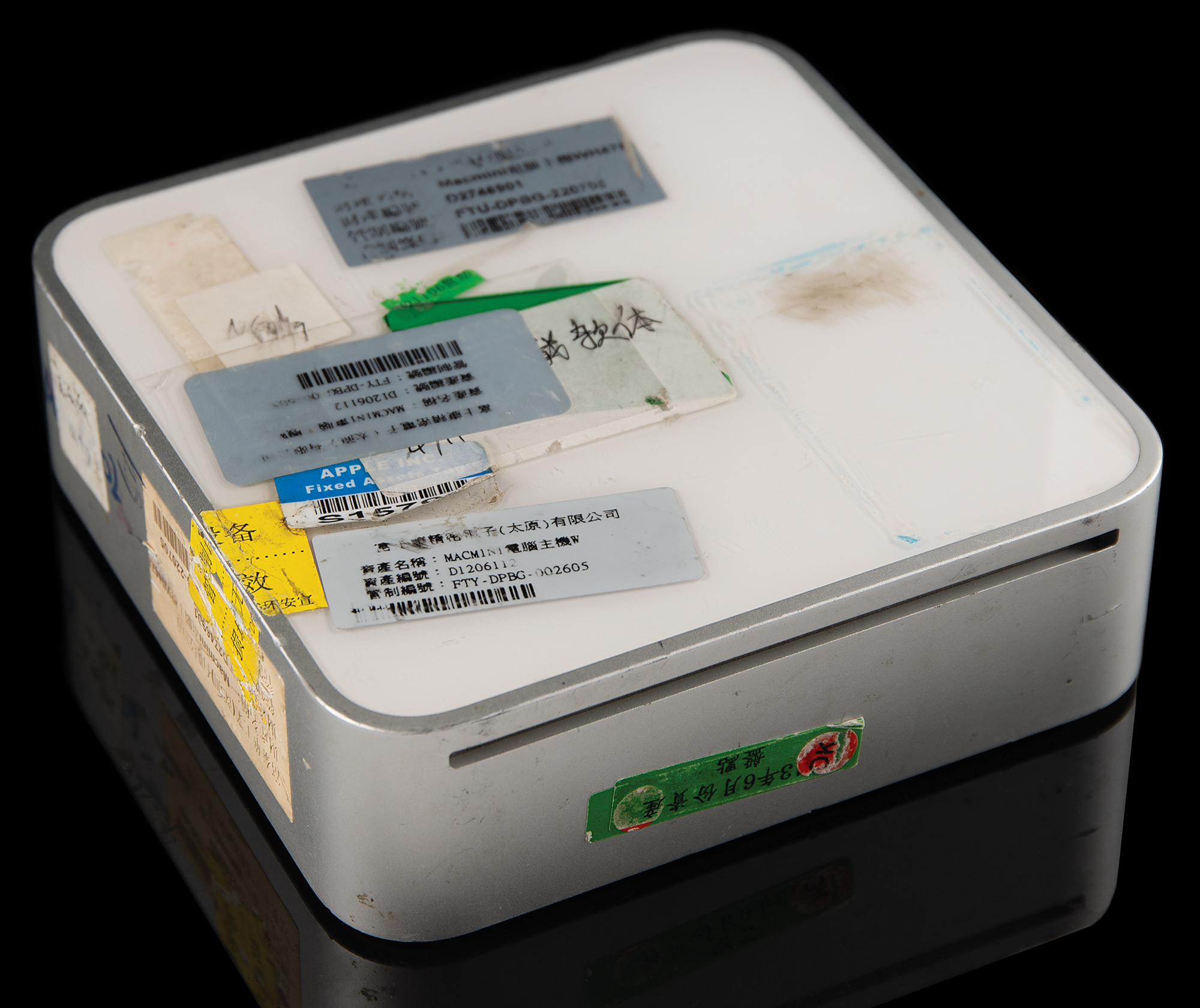Uncommon circa 2008 Mac Mini prototype, measuring approximately 6.5˝ x 6.5˝ x 2˝, with numerous stickers in English and Chinese affixed to the body. The front of the computer features the optical drive, and the rear features the power port, Ethernet port, FireWire port, Mini-DVI port, Mini DisplayPort, five USB ports, and audio in/out.
