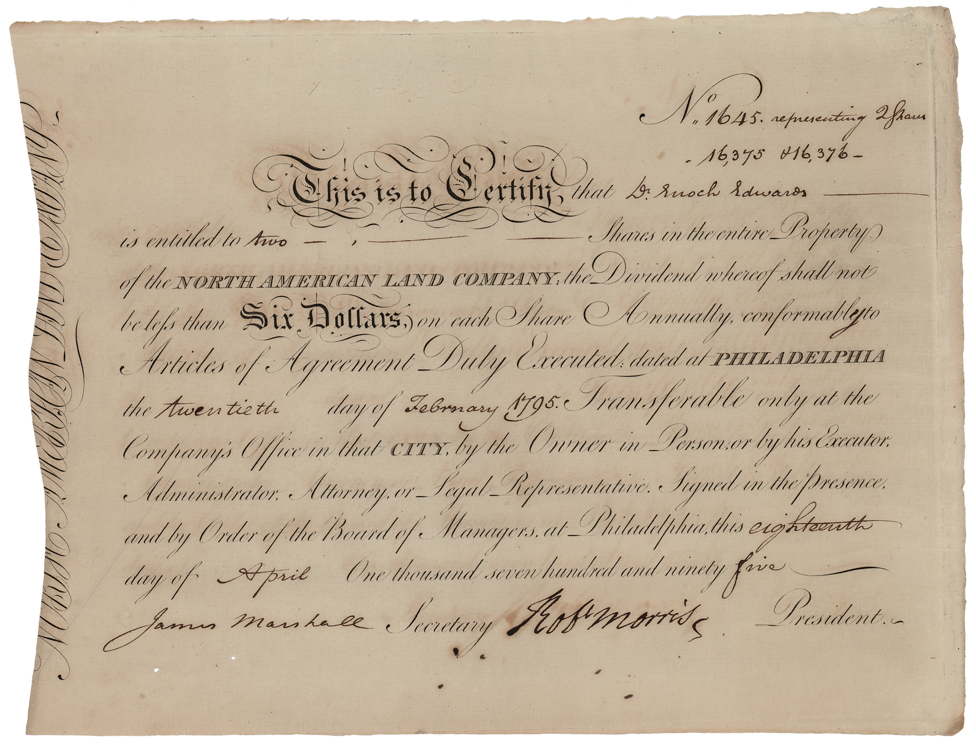 Partly-printed DS, signed “Rob't Morris,” one page, 12.5 x 9.75, April 18, 1795. Stock certificate issued to "Dr. Enoch Edwards" for two shares in the entire property of the North American Land Company. Signed boldly at the conclusion by Robert Morris as president, and countersigned by the company's secretary, James Marshall, the brother of Chief Justice and Secretary of State John Marshall. In fine condition. Morris was eventually bankrupted by land speculations and served a few years in the Prune Street prison until released by the passage of the national bankruptcy law in 1802.