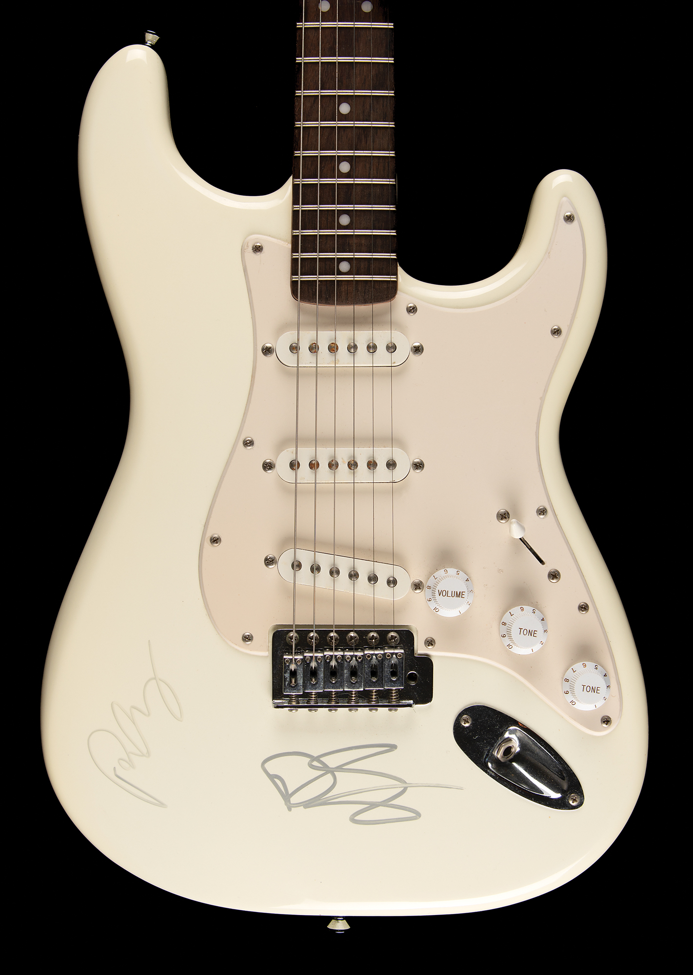 Cream-colored Fender Squier Bullet Strat right-handed electric guitar, signed on the body in silver ink by Dan Auerbach and Patrick Carney. In fine condition.