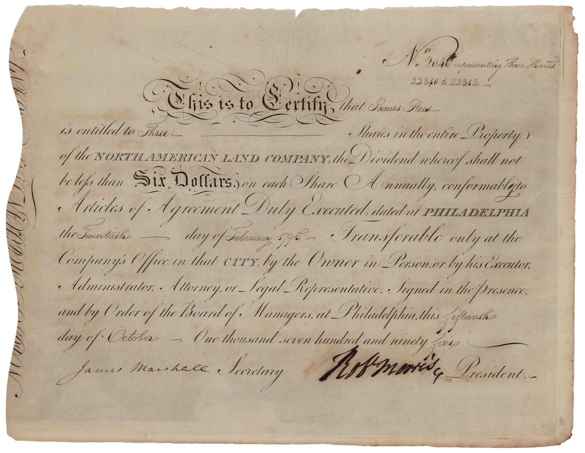 Partly-printed DS, signed “Rob't Morris,” one page, 12.5 x 9.5, October 15, 1795. Stock certificate issued to "James Rees" for three shares in the entire property of the North American Land Company. Signed boldly at the conclusion by Robert Morris as president, and countersigned by the company's secretary, James Marshall, the brother of Chief Justice and Secretary of State John Marshall. In fine condition. Morris was eventually bankrupted by land speculations and served a few years in the Prune Street prison until released by the passage of the national bankruptcy law in 1802.