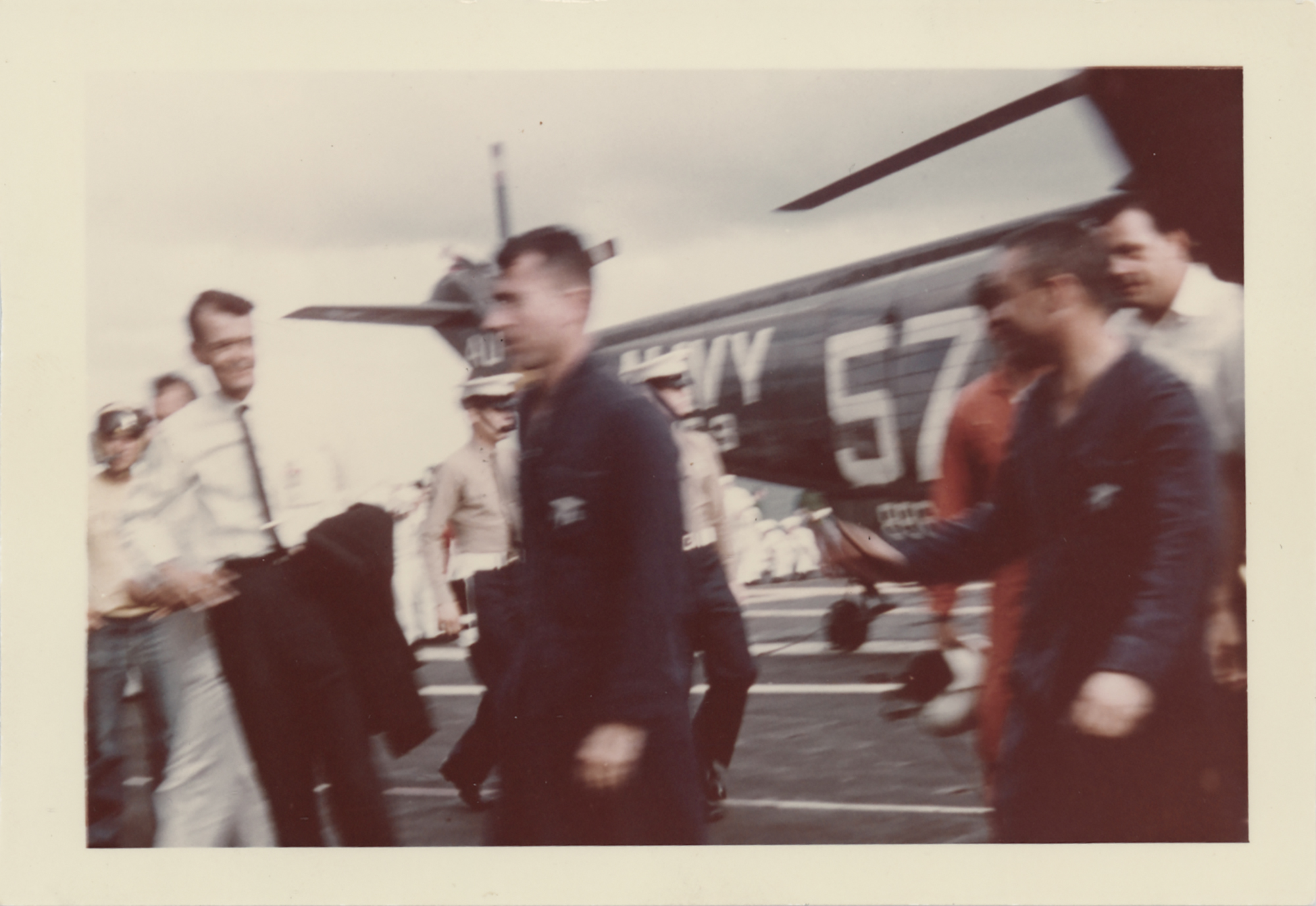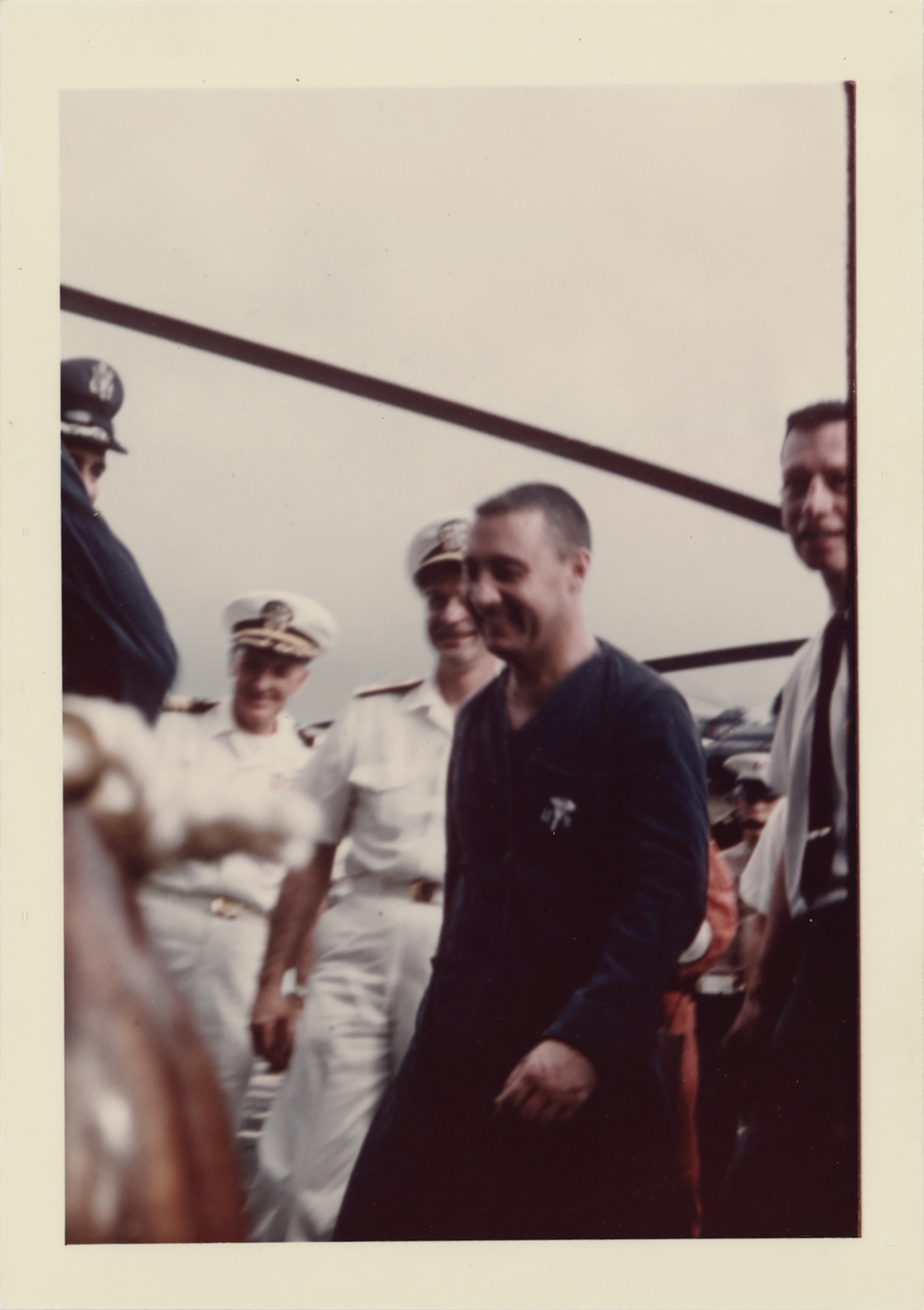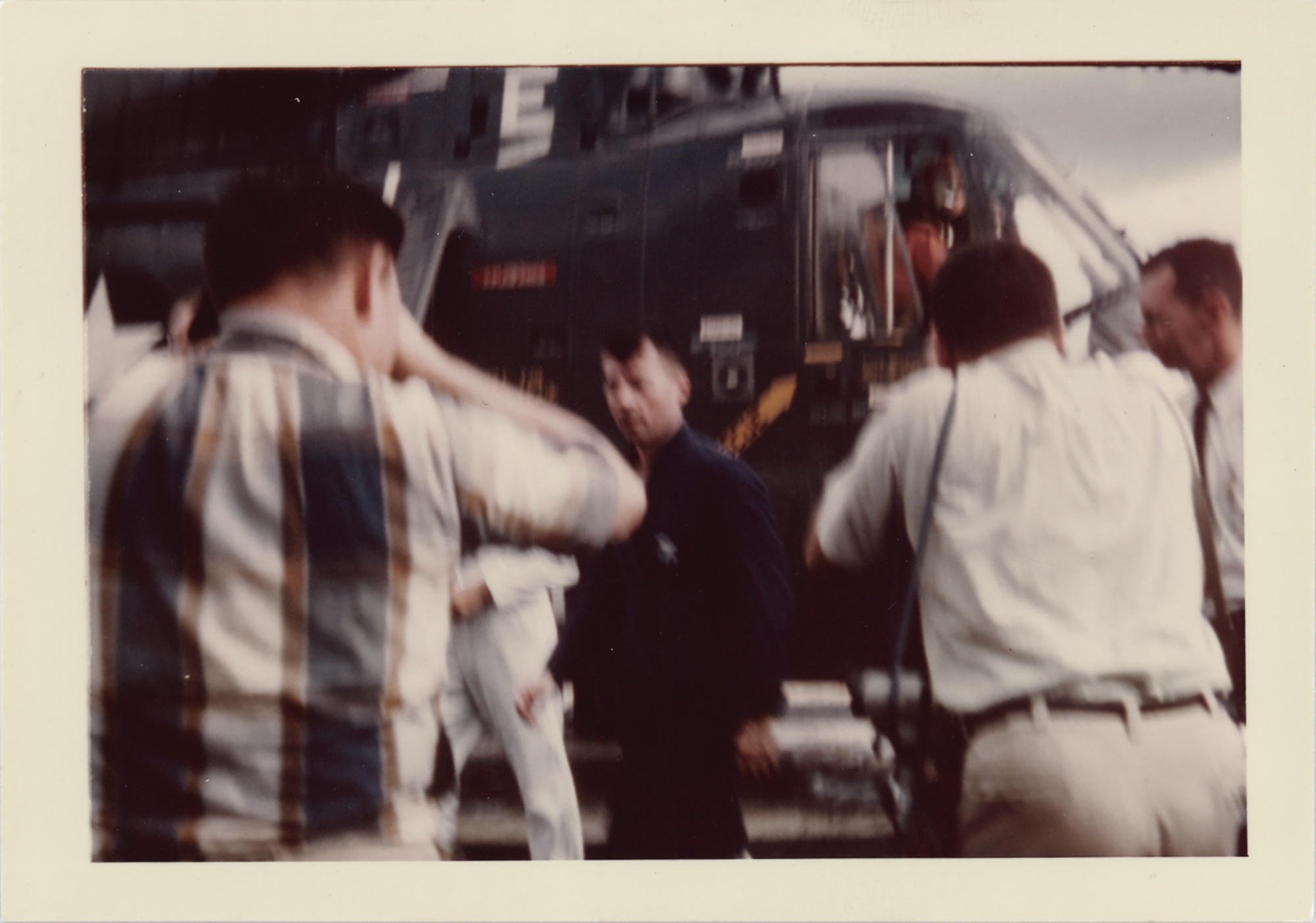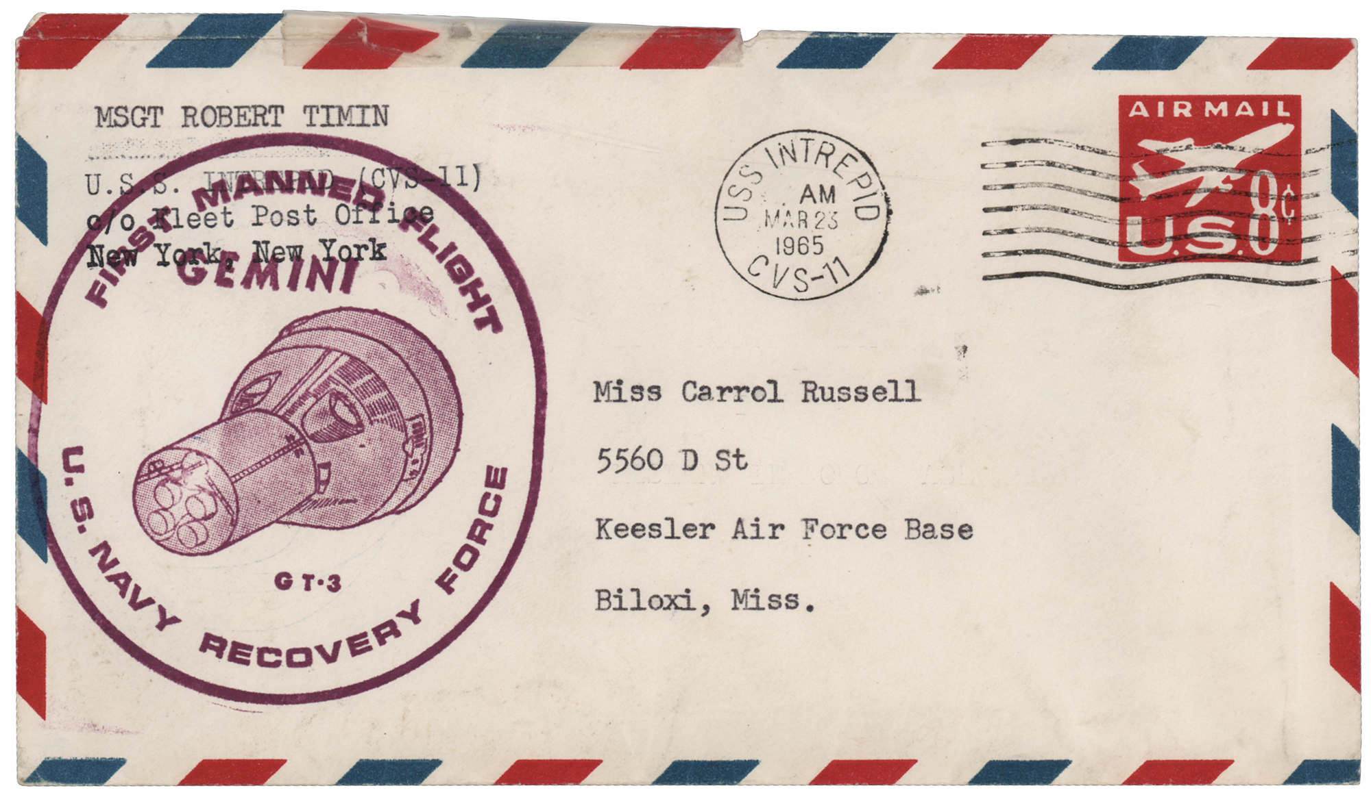 Fantastic group of five original vintage color glossy 5 x 3.5 candid photographs taken on the deck of the USS Intrepid following successful recovery of Gemini 3 astronauts Gus Grissom and John Young, showing both astronauts, the recovery helicopter, and the recovered 'Molly Brown' spacecraft. All have "A Kodak Paper" watermarks on the reverse. Also includes a recovery cover with a stamped cachet honoring the U.S. Navy Recovery Force, postmarked on board the USS Intrepid on the recovery date of March 23, 1965, with accompanying letter on USS Intrepid letterhead, dated "Somewhere at Sea," March 22, 1963: "I am sending you this stamped envelope as it someday may be a collector's item." In overall fine condition.