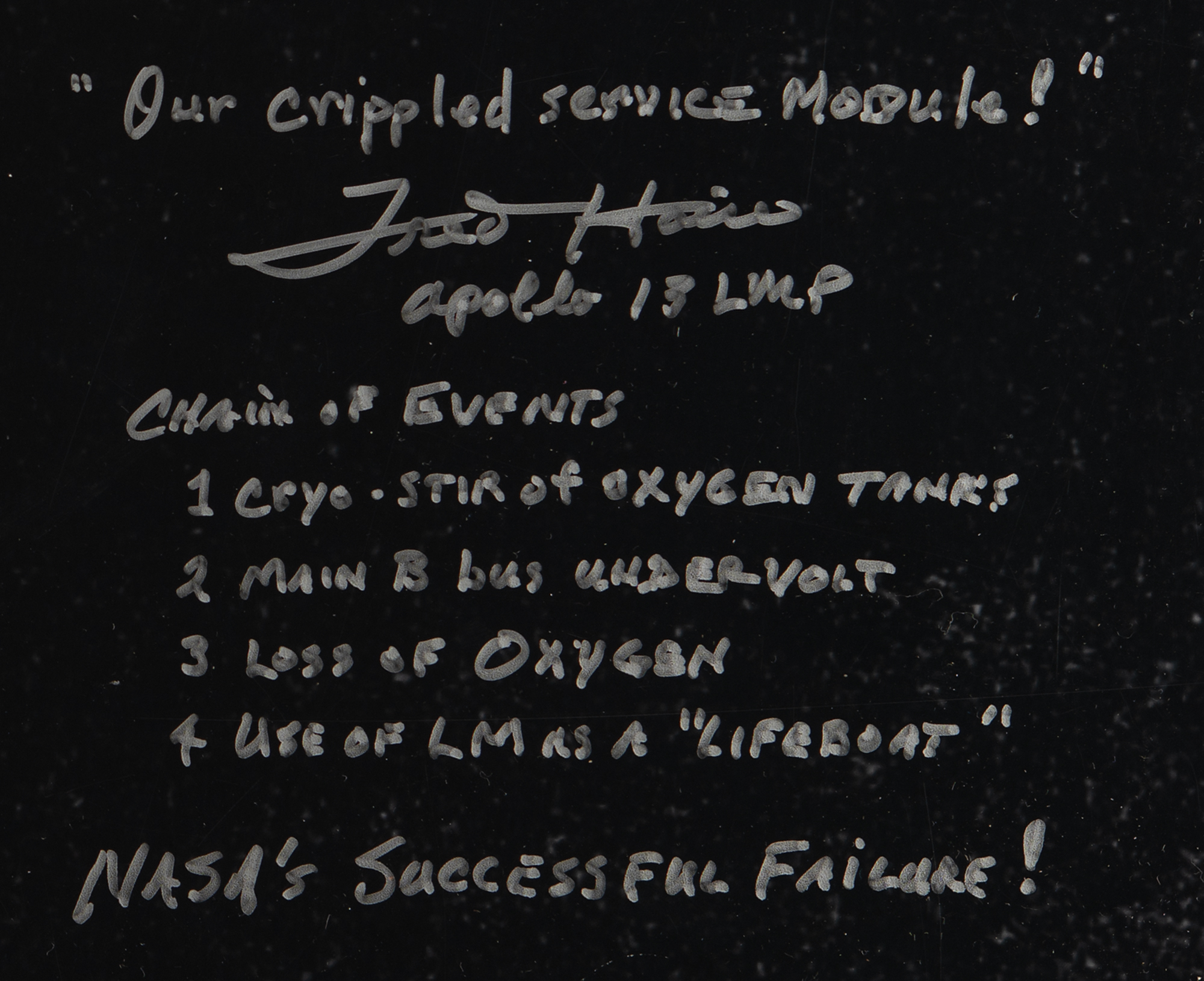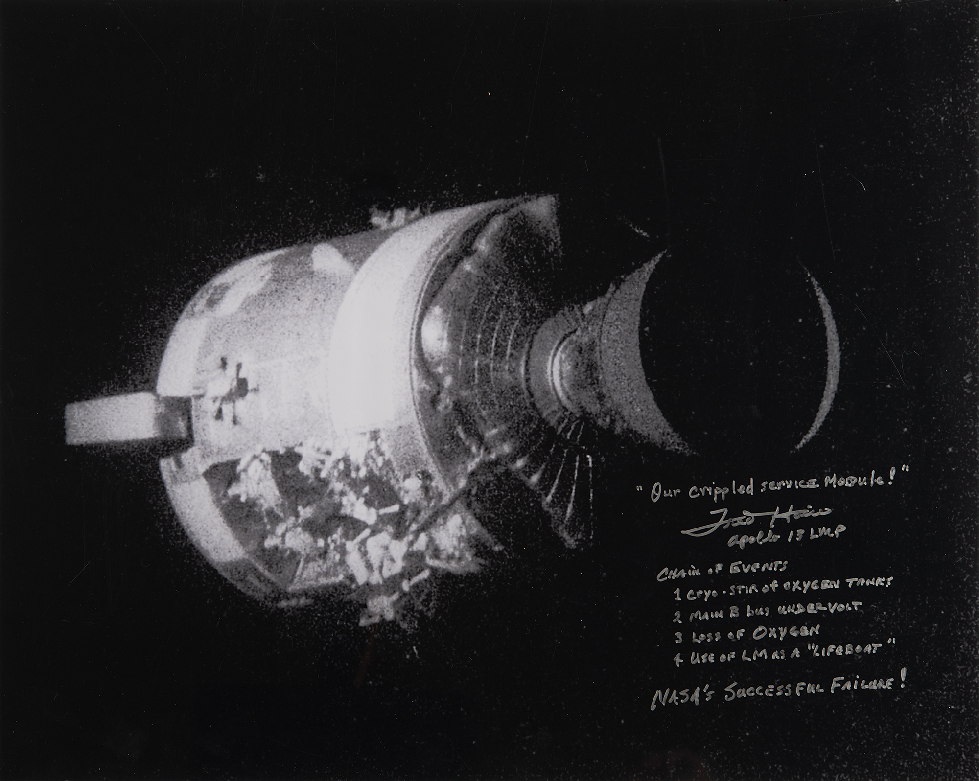 Satin-finish 20 x 16 photo of the damaged Apollo 13 service module floating in space, signed in silver ink, "'Our crippled service module!' Fred Haise, Apollo 13 LMP, Chain of events: 1. Cryo-stir of oxygen tanks, 2. Main B Bus undervolt, 3. Loss of Oxygen, 4. Use of LM as a 'Lifeboat,' NASA's Successful Failure!" Rolled and in very good to fine condition, with scattered small creases, and some light vertical bends.