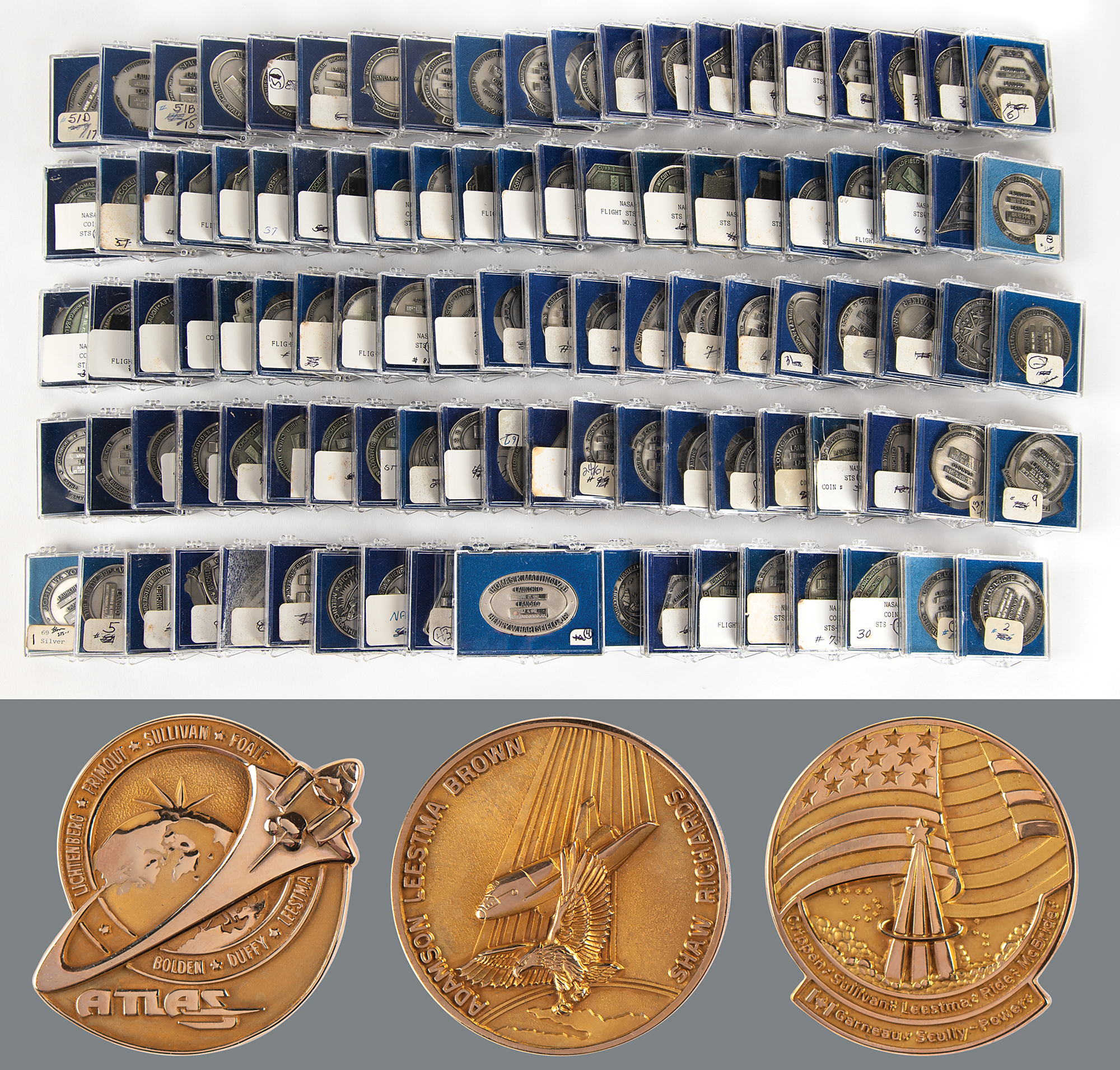 Outstanding collection of 108 Robbins medallions amassed by veteran Space Shuttle astronaut David Leestma, highlighted by an elusive trio of flown gold medallions from the STS-41-G, STS-28, and STS-45 missions