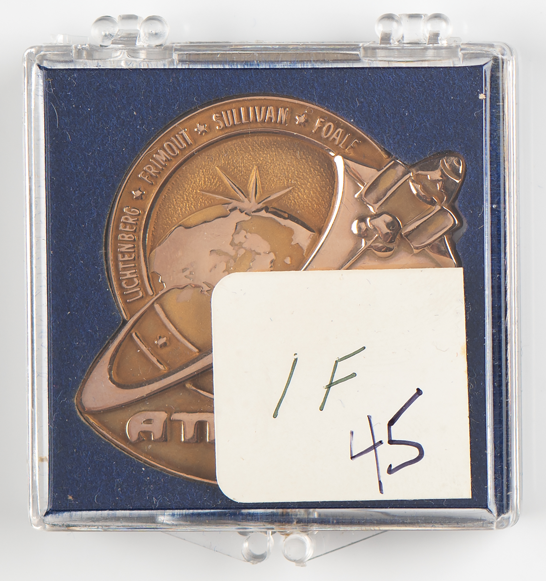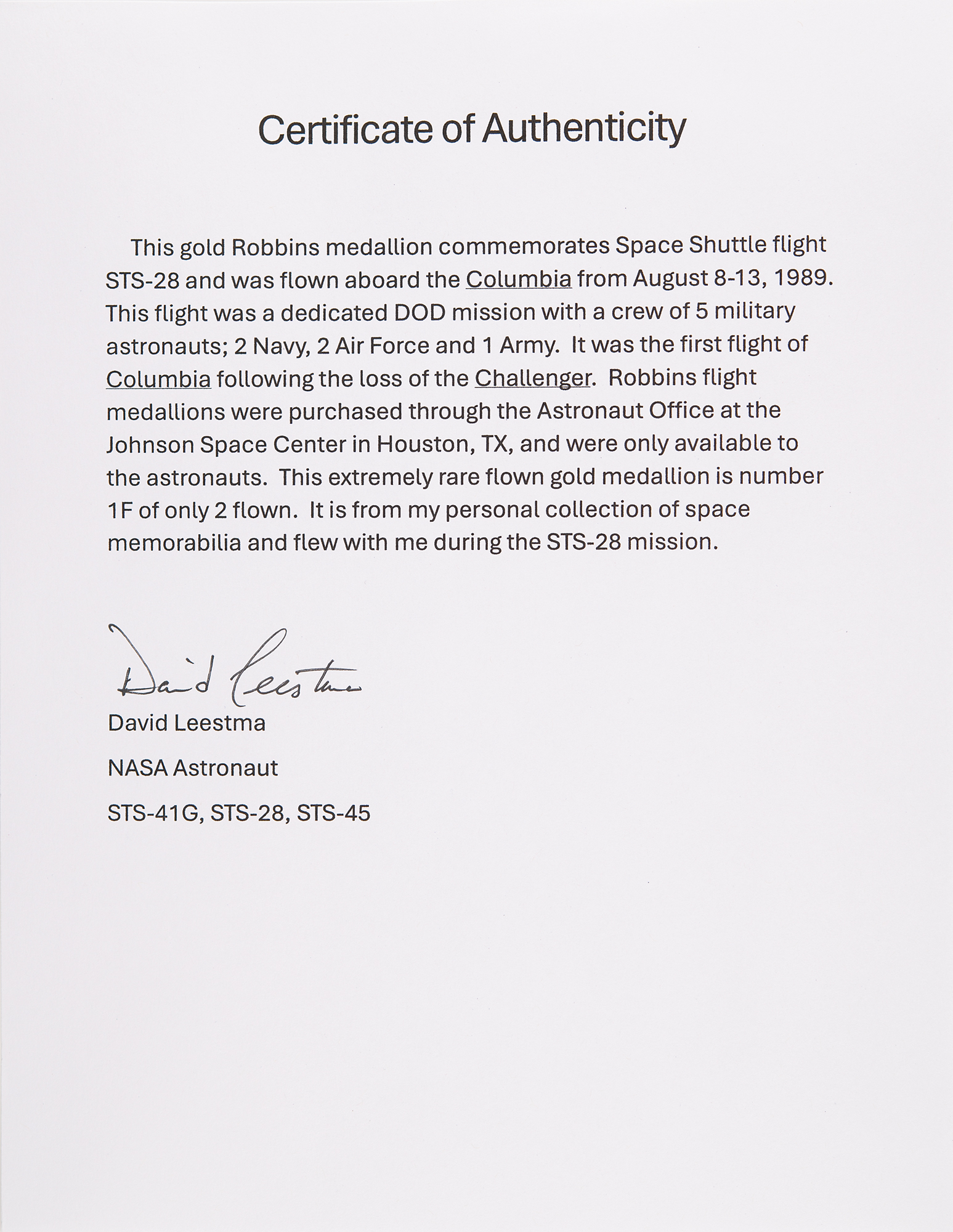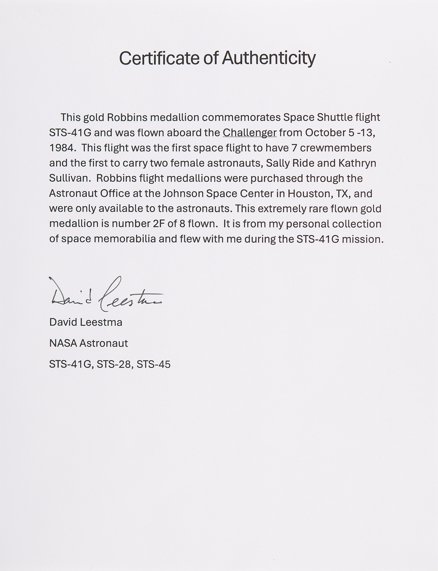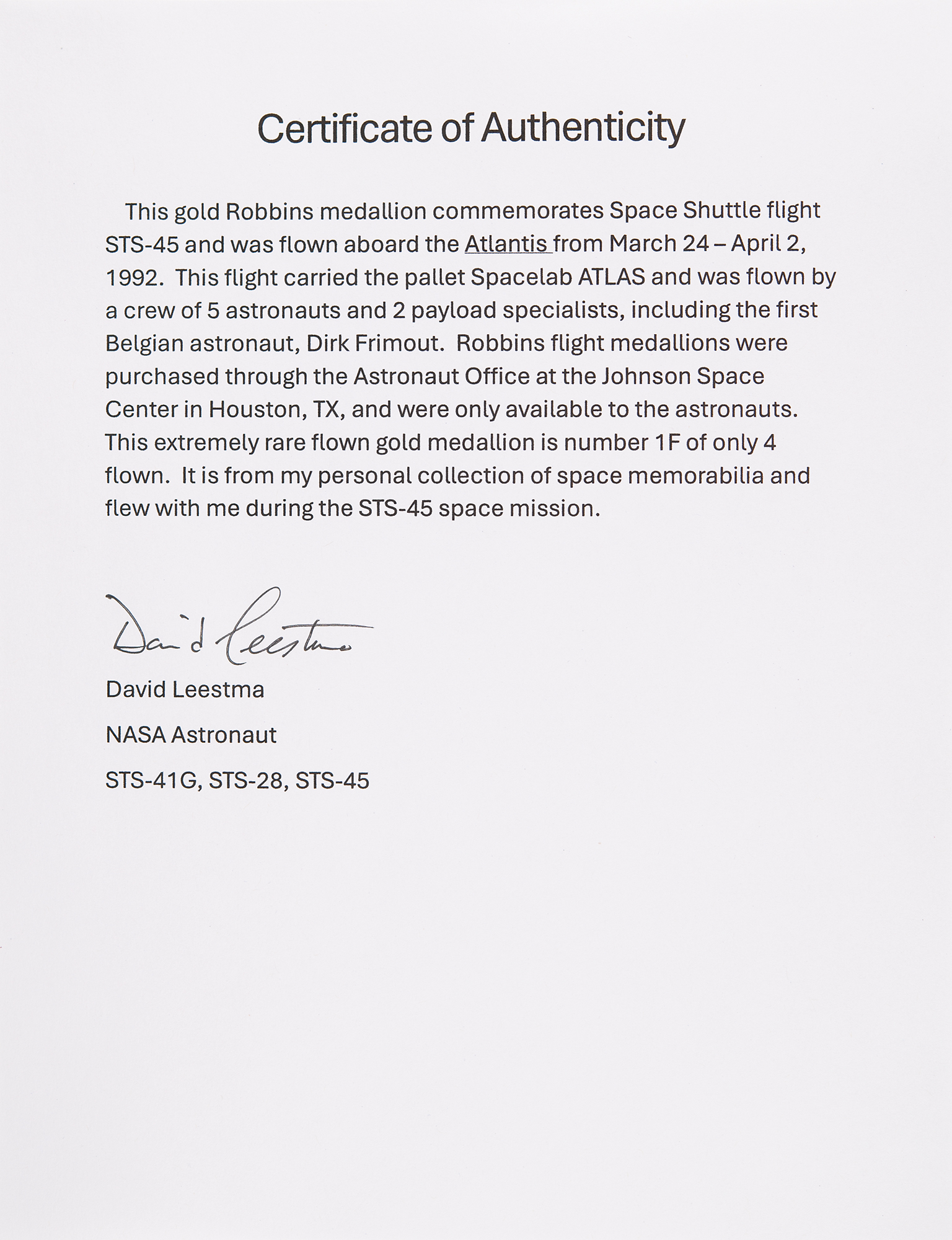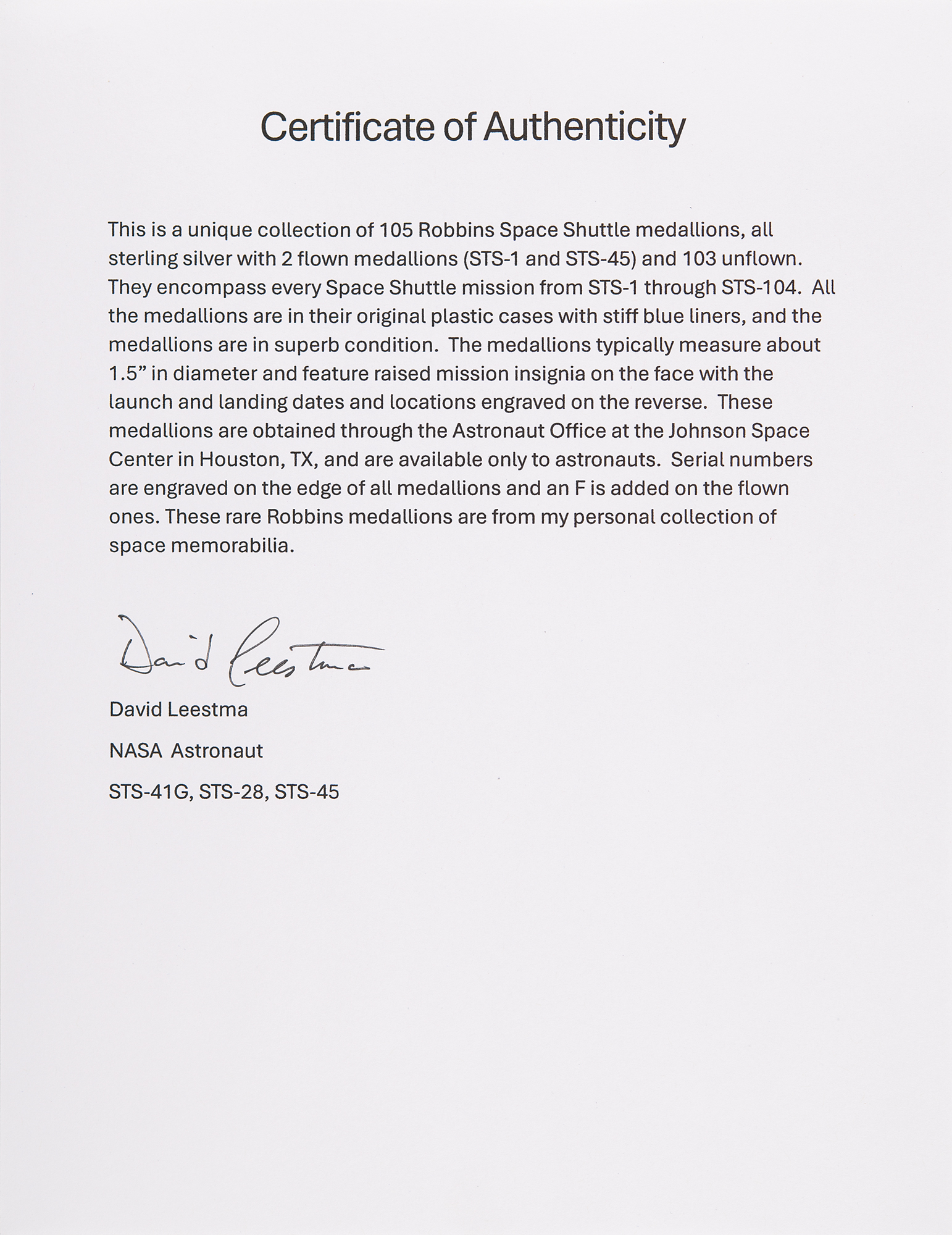 Unique collection of 108 Space Shuttle Robbins medallions from the personal collection of veteran Space Shuttle astronaut David Leestma, highlighted by three extremely rare flown gold medallions that Leestma carried into space during the STS-41-G, STS-28, and STS-45 missions—these medallions are accompanied by their respective crew-signed NASA lithographs. The collection contains 105 sterling silver Robbins medallions, with two flown examples (STS-1 and STS-45) and 103 unflown, an impressive group that encompasses every Space Shuttle mission from STS-1 through STS-104. The medals typically measure about 1.5˝ in diameter and feature raised mission insignia designs on the face with the launch and return dates engraved on the reverse, with each medal bearing an engraved serial number on its edge, with examples marked ‘F’ indicating flown status. All are in their original cases with stiff blue liners. These medallions are obtained through the Astronaut Office at the Johnson Space Center in Houston, TX, and are available only to astronauts. Condition is generally mint state. Accompanied by a signed NASA lithograph of Leestma, a complete inventory list of all sterling silver medallions, and signed certificates of authenticity for the three gold medallions and the full sterling silver collection. A marvelous assembly of Robbins medallions rarely offered in such great quantity and enhanced by its superior provenance.
