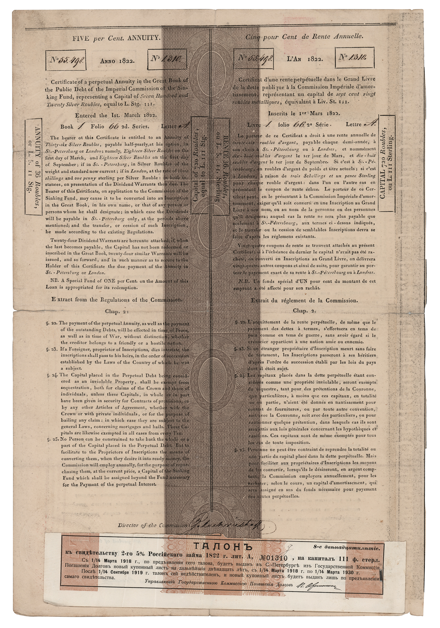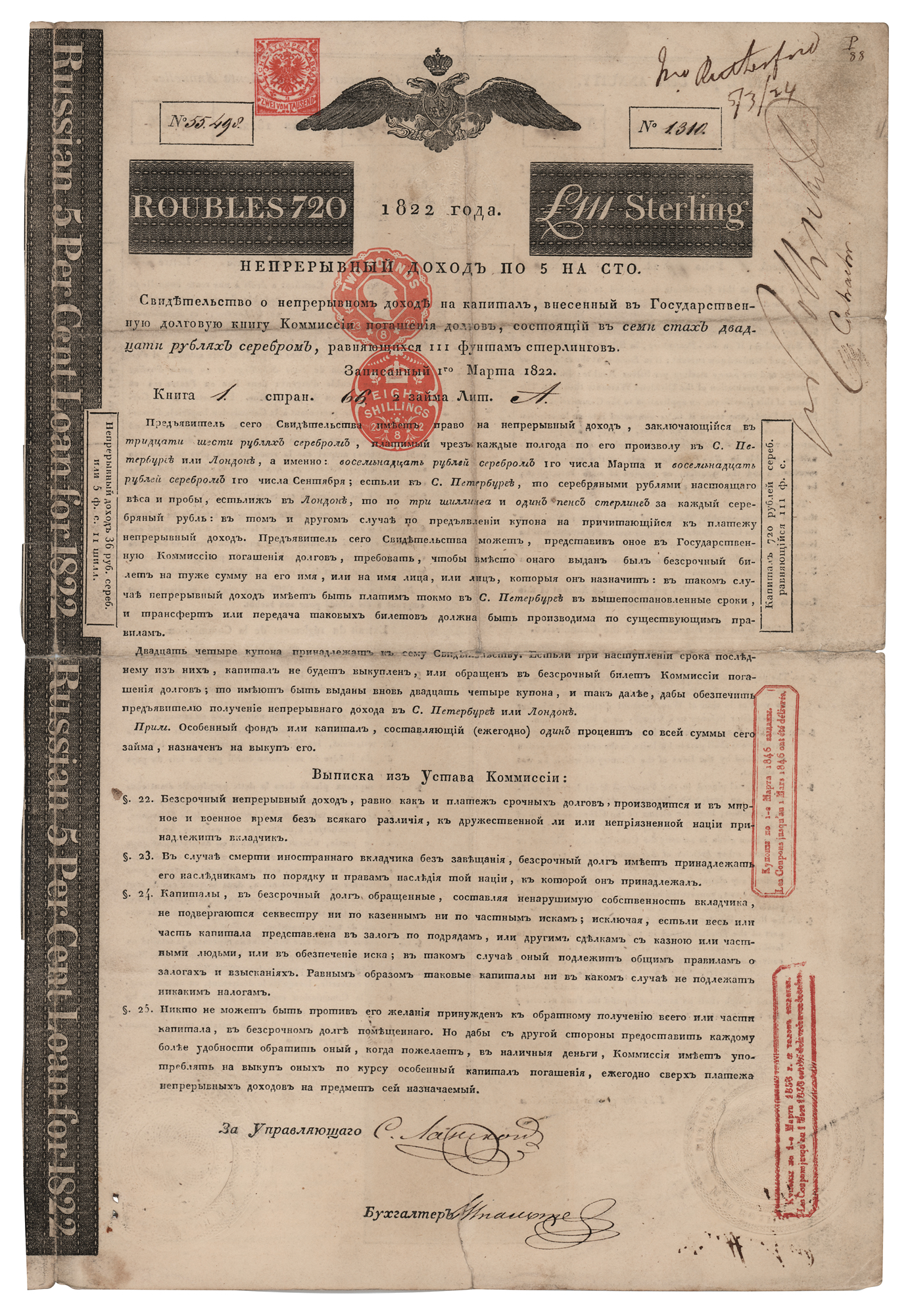 European Jewish financier (1777-1836) who founded his family’s famous banking dynasty and handled Allied loans for the campaign against Napoleon. Rothschild helped to ensure Britain’s preeminence as a financial market when bonds he handled as an investment banker were denominated in sterling and the interest made payable to London in pounds. Among the powers availing themselves of the new arrangements was Czarist Russia, which floated a loan for £3,500,000 in 1822. Three-language partly-printed DS, signed “N. M. Rothschild,” one page both sides, 9.75 x 14.25, March 1, 1822. A Russian imperial bond for 720 rubles with 5% annuity. Signed in the upper right margin in ink by Rothschild. In very good to fine condition, with light soiling and some short edge tears.
