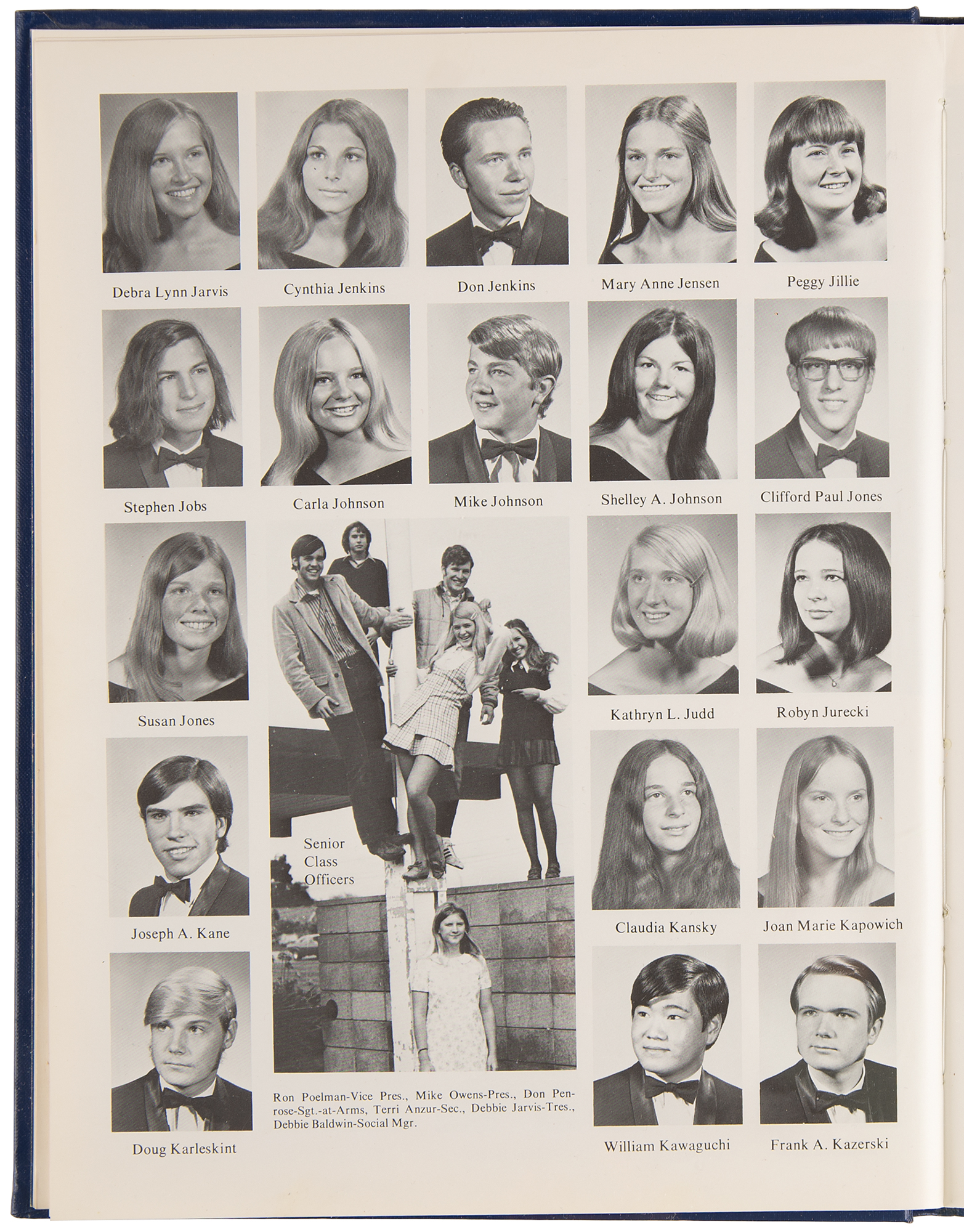 Hardcover 1972 Pegasus yearbook from Steve Jobs’ senior year at Homestead High School in Cupertino, California, 8.75 x 11.25, 201 pages. Jobs is pictured as a member of the graduating senior class on page 24; Chrisann Brennan, Jobs’ girlfriend and the mother of his first child, is pictured as a junior on page 47; and Bill Fernandez, a close friend of Jobs and Apple employee No. 4, is pictured as a senior on page 19.
