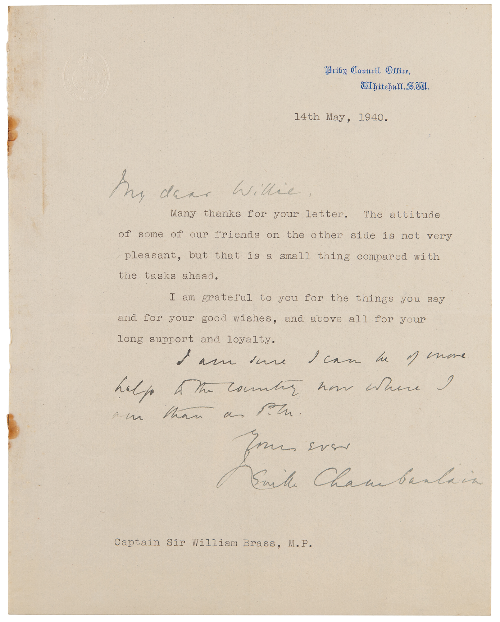 British politician (1869–1940) who served as prime minister from 1937 to 1940, and is remembered for his foreign policy of appeasement toward Nazi Germany; by signing the Munich Agreement in 1938, he allowed Hitler to annex Czechoslovakia's Sudetenland in what is now recognized as one of the major early steps toward World War II. World War II–dated TLS, signed “Yours ever, Neville Chamberlain,” one page, 7.5 x 9.5, Privy Council Office letterhead, May 14, 1940. Letter to Captain Sir William Brass, addressed in Chamberlain's hand as "My dear Willie," in full: "Many thanks for your letter. The attitude of some of our friends on the other side is not very pleasant, but that is a small thing compared with the tasks ahead. I am grateful to you for the things you say and for your good wishes, and above all for your long support and loyalty." Chamberlain finishes the letter in his own hand: "I am sure I can be of more help to the country now where I am than as P.M." In fine condition, with small rust stains to the left edge.