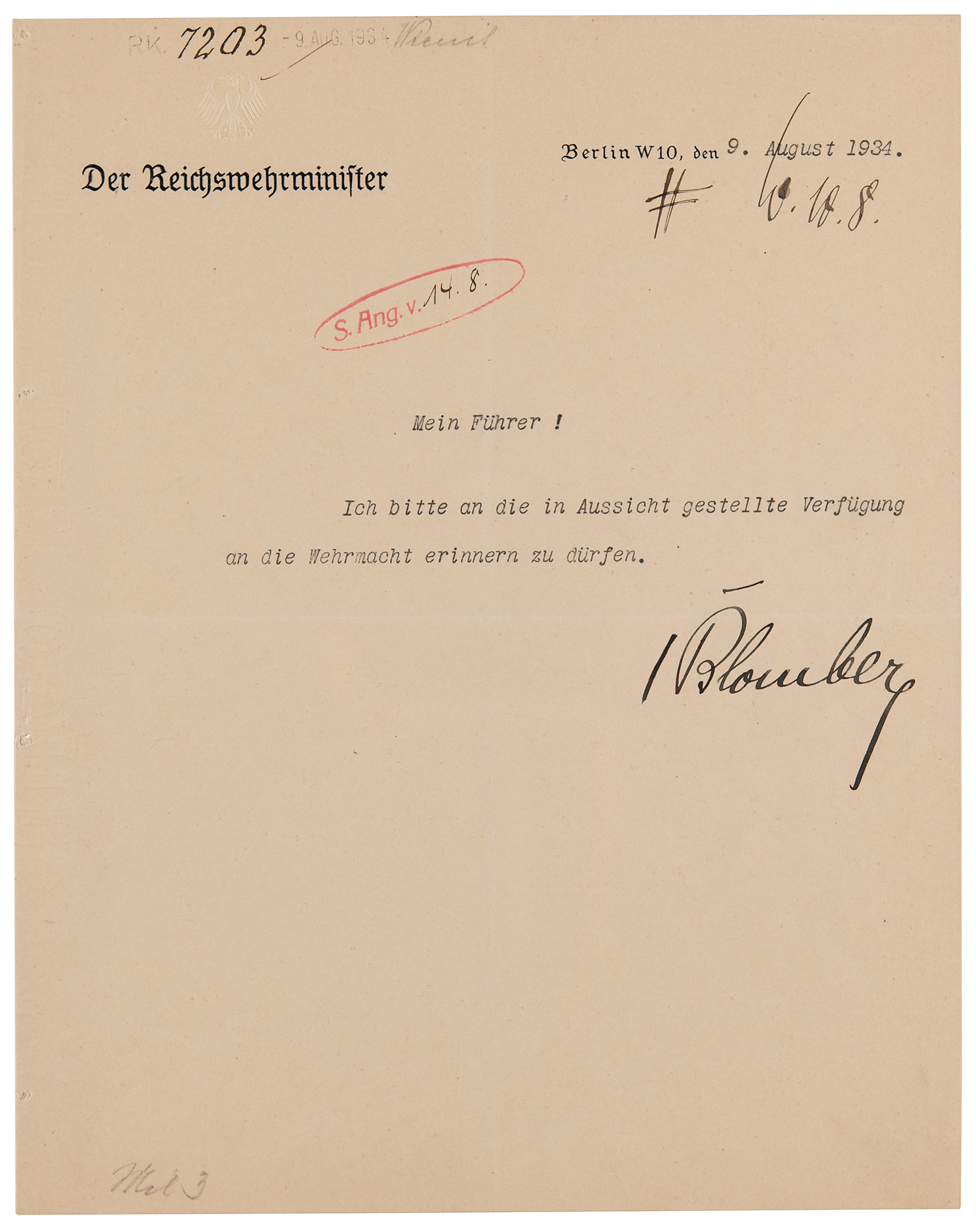 Important TLS in German, signed “v. Blomberg,” one page, 8.25 x 10.5, "Der Reichswherminister [Defense Minister]" letterhead, August 9, 1934. Historically significant 'blackmail' letter to Adolf Hitler, addressing him as "Mein Führer!" In full (translated): "I would like to remind you of the promised disposition of the Wehrmacht [Armed Forces]." In fine condition. The significance of this letter is twofold: first, it is an early example of Hitler being addressed as "Mein Führer," which Blomberg would mandate of all German soldiers in a decree issued the next day, August 10th; second, it represents a reminder to Hitler that that the Army stood back during the 'Night of the Long Knives' on condition that they would be the senior military authority in Nazi Germany, and so recognized by its leader.