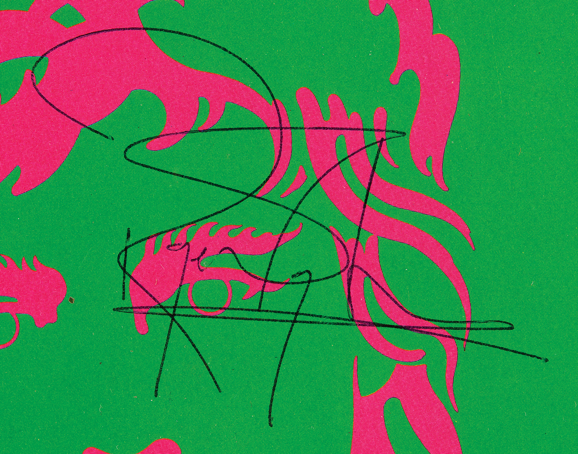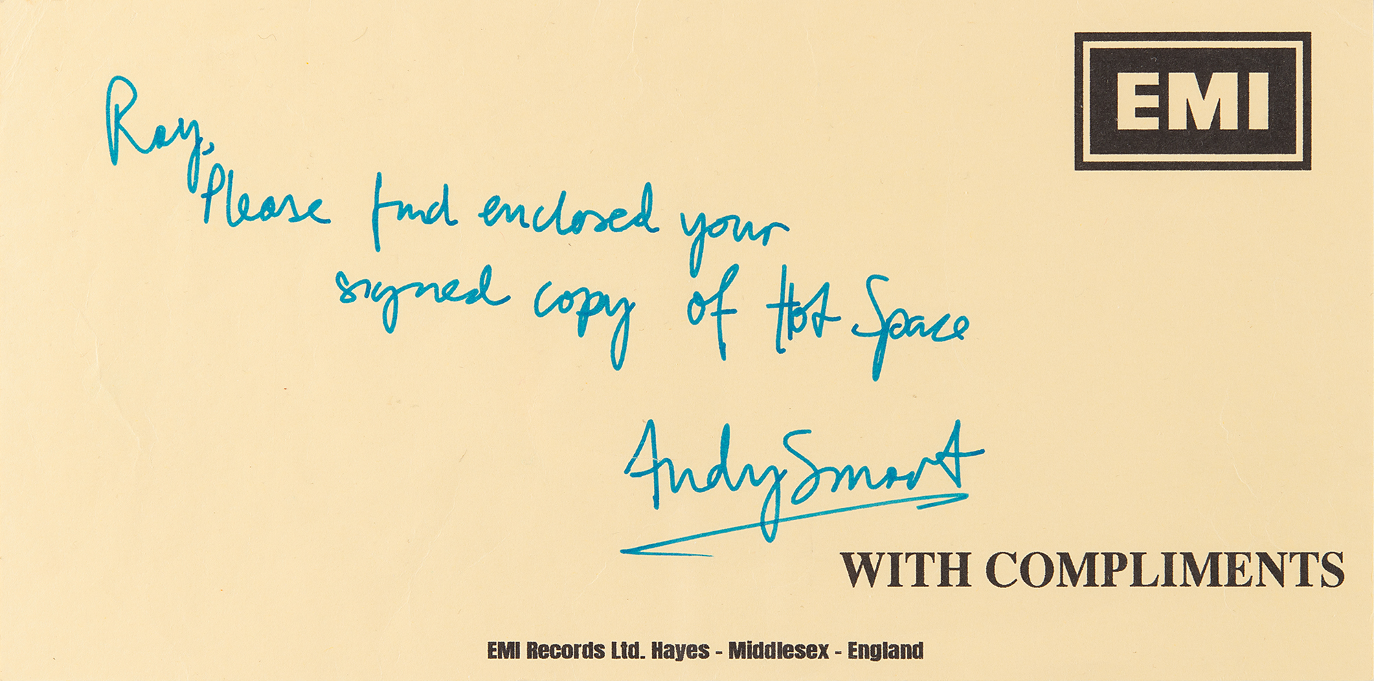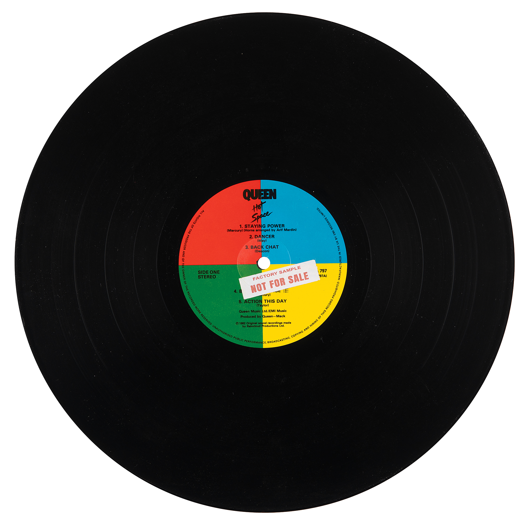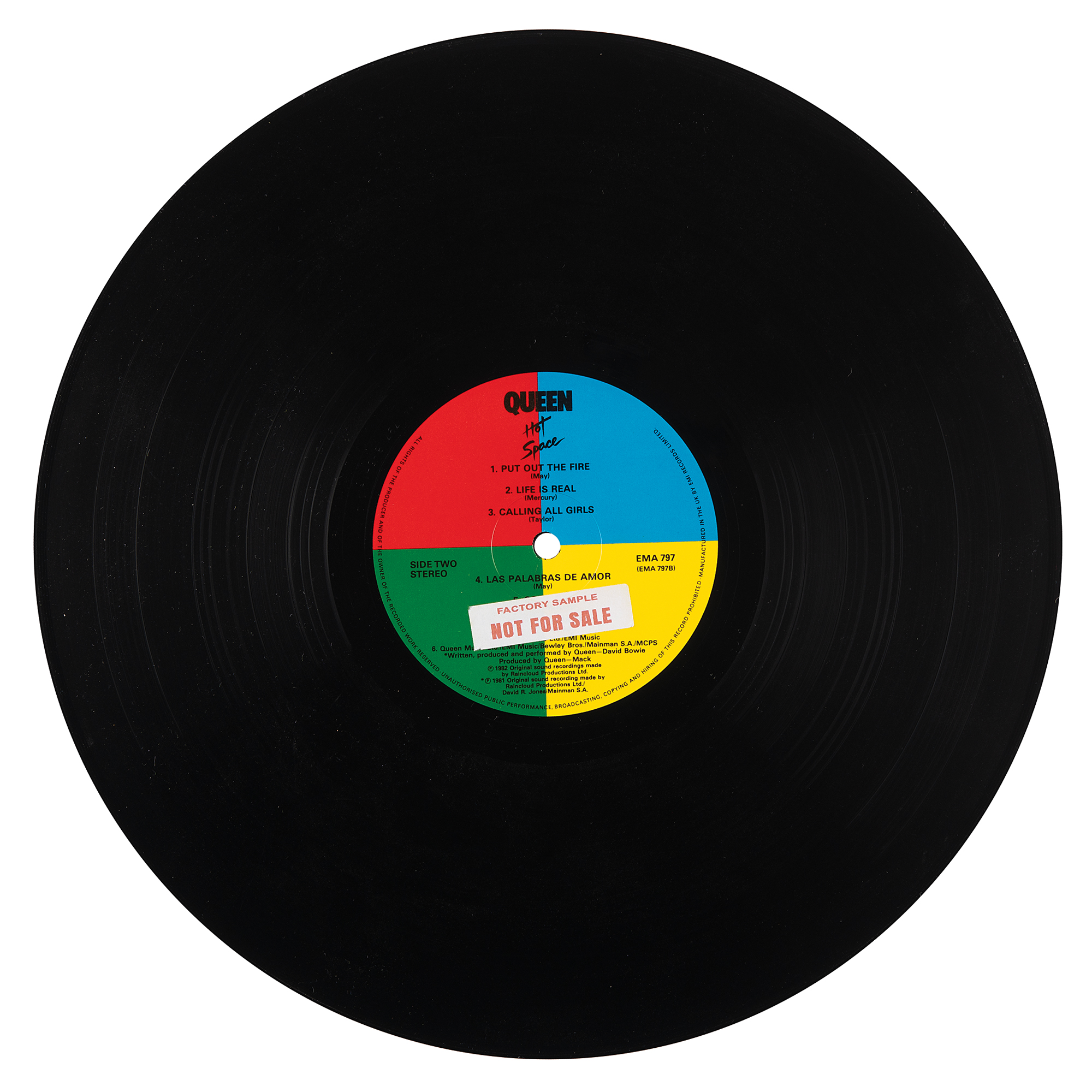 UK promotional vinyl pressing of the 1982 Queen album Hot Space, signed on the front cover in black ballpoint by Freddie Mercury, Roger Taylor, Brian May, and John Deacon, who adds “83.” The back cover bears an affixed EMI Records “Promotional Copy, Not for Sale” label, and both sides of the included record feature affixed “Factory Sample, Not for Sale” labels. In fine condition. Accompanied by an EMI compliments sheet transmitting the “signed copy of Hot Space.”