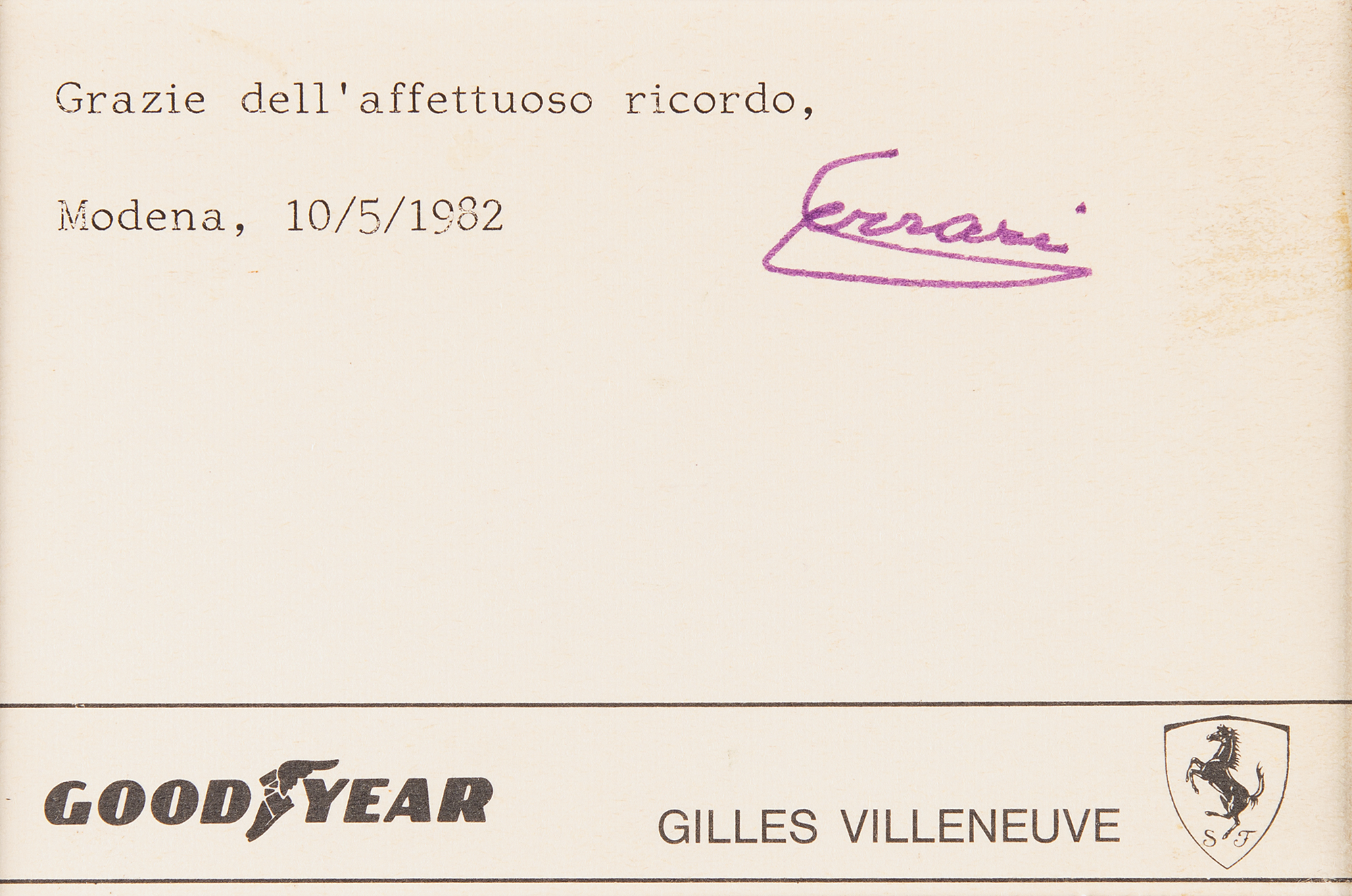 TNS in Italian, signed “Ferrari,” one page, 4.5 x 3, Goodyear and Ferrari (Gilles Villeneuve) stationery, May 10, 1982. Sent from Modena, a quick typed note of thanks from Enzo Ferrari (translated): “Thanks for the affectionate memory.” Double-matted with a large photo of Ferrari to an overall size of 11.75 x 18.25. In fine condition.