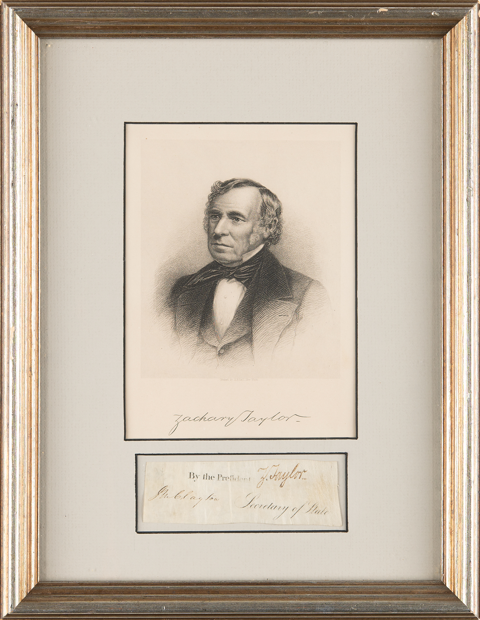 Ink signature as president, "Z. Taylor,” on an off-white 4.25 x 1.25 slip clipped from the close of a presidential document, which is countersigned by Secretary of State John M. Clayton. Matted and framed with an engraved portrait of Zachary Taylor (bearing a facsimile signature) to an overall size of 10.5 x 13.5. In fine condition, with light vertical creasing. Any Taylor presidential signature is quite uncommon, as he served only 16 months before suddenly passing away on July 9, 1850.