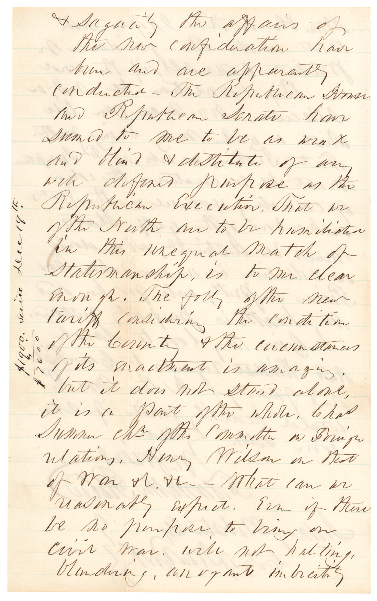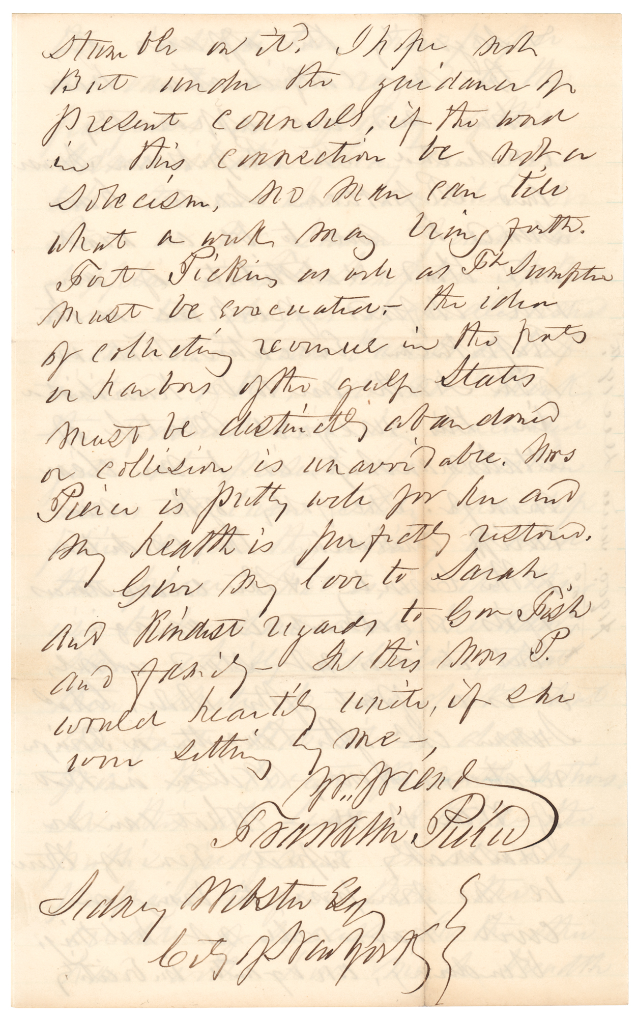 ALS, four pages on two adjoining sheets, 5.25 x 8.5, March 27, 1861. Handwritten letter to his former private White House secretary Sidney Webster, in full: "I received your letter of the 14th inst. some days since, and wrote to Mr. Merritt, our consul, particularly with reference to Mr. Neilson. Mr. M. is an intelligent kindhearted man—has seen a great deal of the world and is a thorough Gentleman. I feel quite sure, that Mr. Neilson & his sick sister w’d receive every attention from him without any suggestion from me, but Mr. N. ought not to come to the States before the June steamer, and my letter may be useful. I'm tired of reading the contradictory newspaper accounts with regard to the purposes and policy of this administration. Pray can you tell me in what condition Dr. Fox or Mr. Lamon found the supplies in Ft. Sumpter [sic]? If there were two dozens of candles instead of one and four barrels of beef instead of two I do not think the fortress will be evacuated just at present. The question seems to turn solely upon supplies & upon the ability to hold the place. That is, if the thing is to be done at all, the Adm’n seems chiefly solicitous, that there shall be no doubt about the fact that it is done from the lowest possible motives. In this at least I think the public judgment is already prepared to give them the credit of success—on the other hand with how much breadth and sagacity the affairs of the new confederation have been and are apparently conducted—The Republican House and Republican Senate have seemed to me to be as weak and blind & destitute of any well defined purpose as the Republican Executive. That we of the North are to be humiliated in this unequal match of statesmanship, is to me clear enough. The folly of the new tariff considering the condition of the country & the circumstances of its enactment is amazing, but it does not stand alone, it is a part of the whole. Chas. Sumner Ch’r of the Committee on Foreign relations, Henry Wilson on that of war, etc. etc.—what can we reasonably expect. Even if there be no purpose to bring on civil war, will not halting, blundering, arrogant imbecility stumble on it? I hope not but under the guidance of present counsels, if the word in this connection be not a solecism, no man can tell what a week may bring forth. Fort Pickins [sic] as well as Ft. Sumpter must be evacuated—The idea of collecting revenue in the ports or harbors of the Gulf States must be distinctly abandoned or collision is unavoidable. Mrs. Pierce is pretty well for her and my health is perfectly restored. Give my love to Sarah and kindest regards to Gov. Fish and family—In this Mrs. P. would heartily unite if she were sitting by me—.” In fine condition.