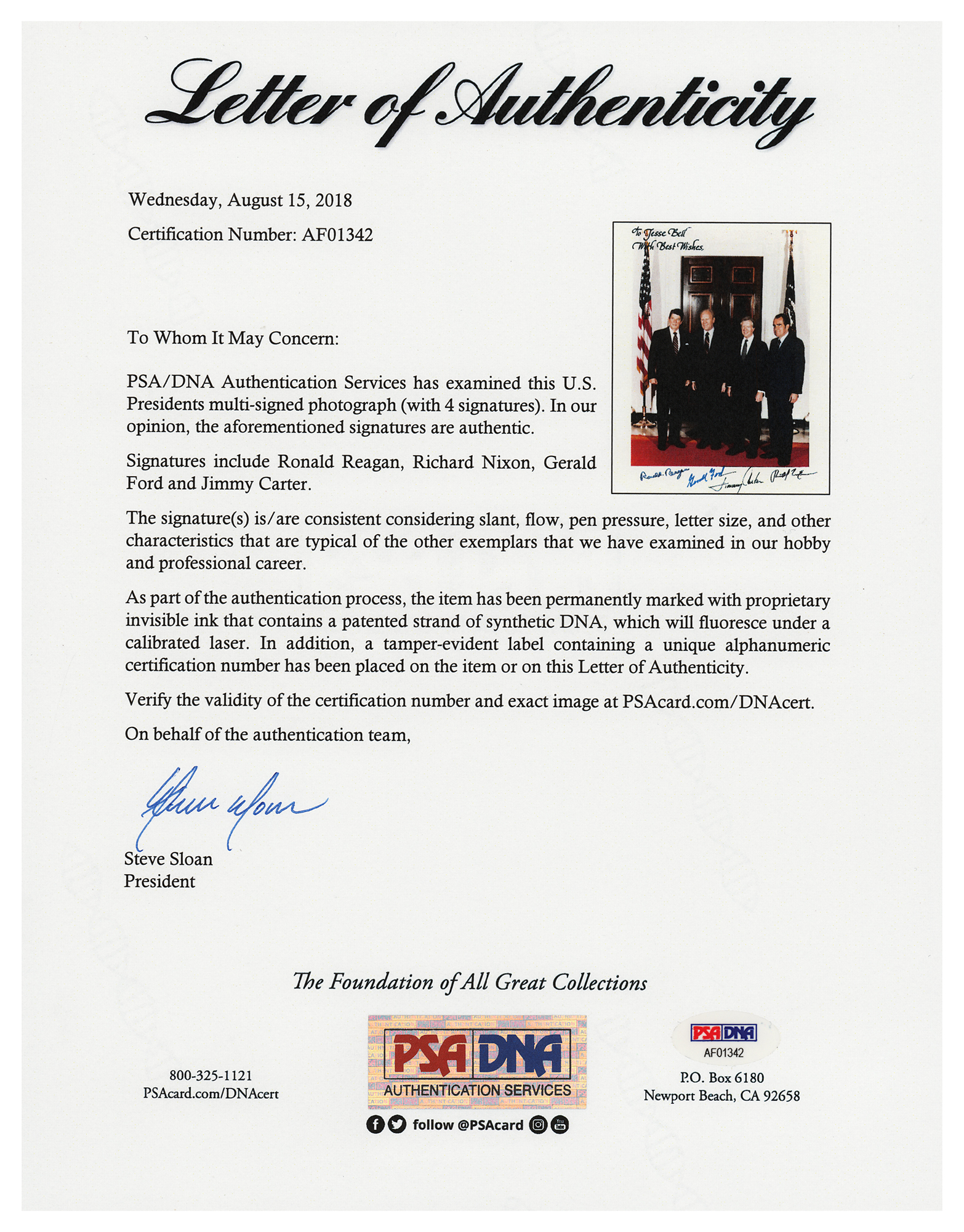 Color satin-finish 8 x 10 photo of Presidents Nixon through Reagan gathered at the White House prior to departing for Anwar Sadat's funeral in 1981, signed in the lower border in black felt tip, "Ronald Reagan," "Jimmy Carter," and "Richard Nixon," and in blue felt tip, “Gerald Ford.” The upper left bears the calligraphic inscription: “To Jesse Bell, with best wishes.” In fine condition, with a few tiny creases to the lower left corner. Accompanied by a full letter of authenticity from PSA/DNA, and by a letter from the original recipient, affirming that all of the autographs were obtained in person.