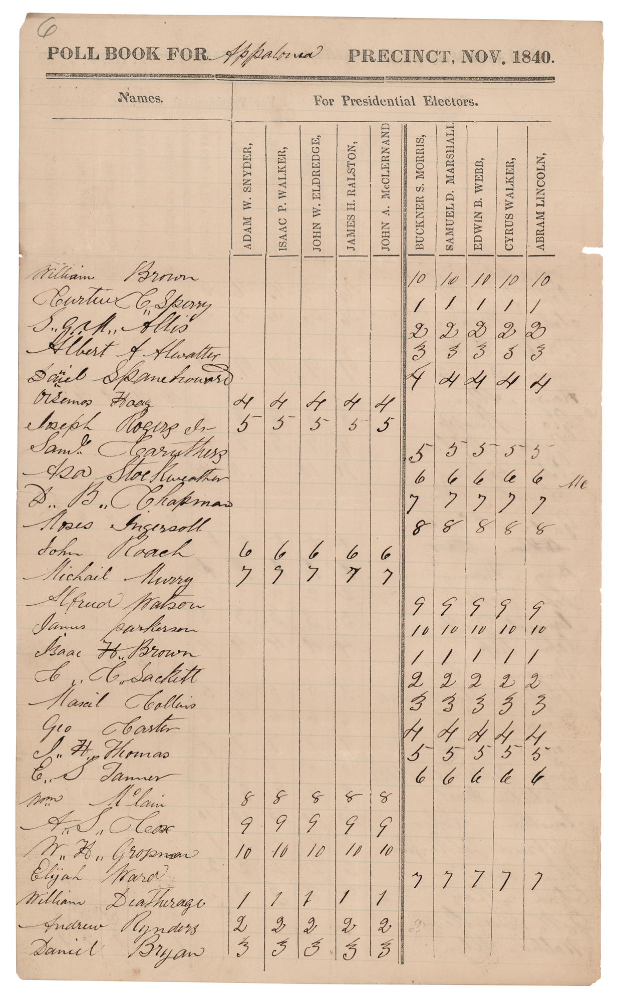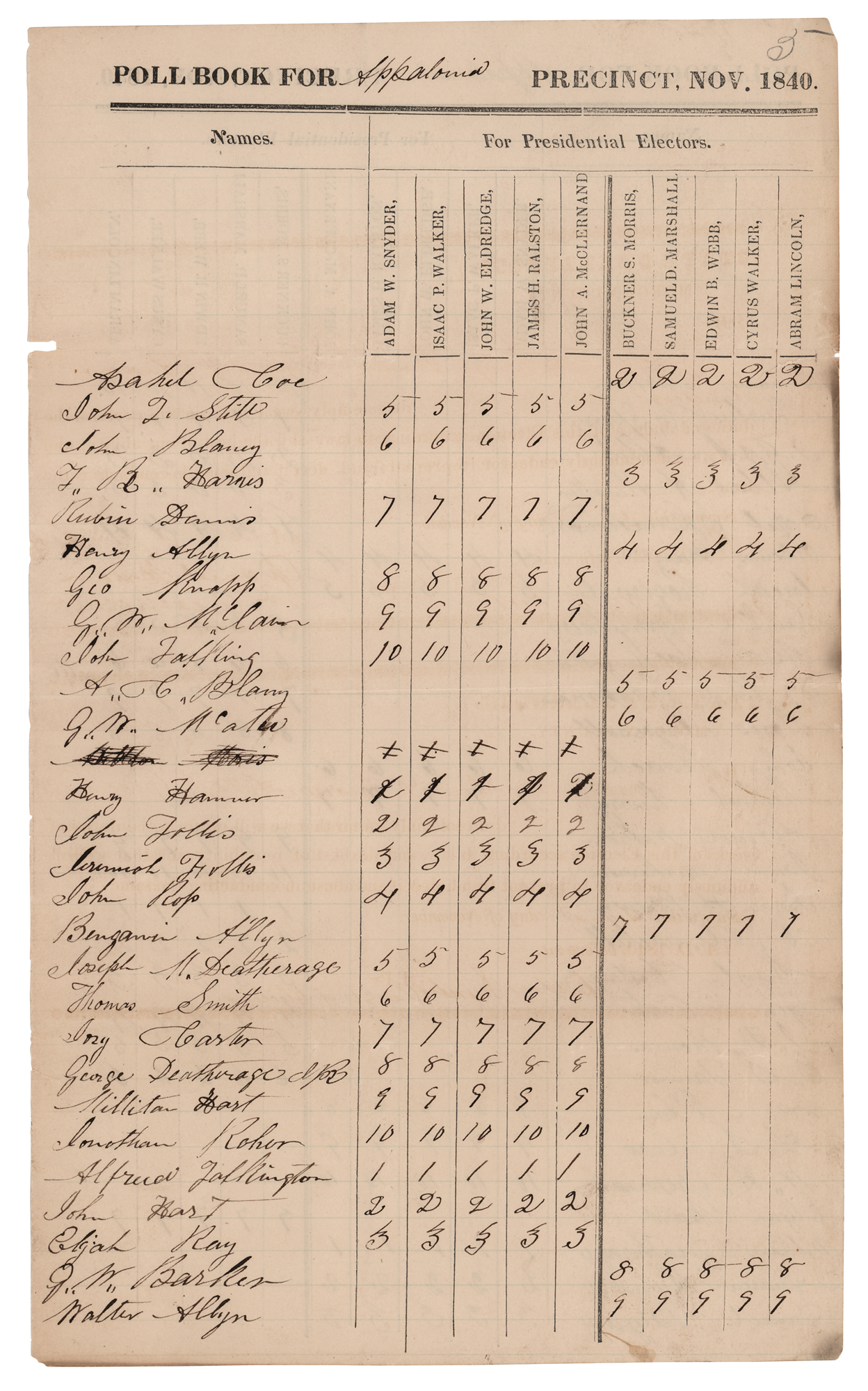 Uncommon partly-printed double-sided poll book page headed "Poll Book for Appalonia [Illinois] Precinct, Nov. 1840," 7.75 x 13, showing Abraham Lincoln, at the age of 31, running for elector on behalf of William Henry Harrison in the forthcoming Harrison vs. Van Buren presidential election. Interestingly, his name is misspelled at the top: "Abram Lincoln." Lincoln’s colleague, future Union General John A. McClernand, is also listed is a potential elector. The registered voters' names and associated tallies clearly penned in the same hand, likely that of an election official. In fine condition.