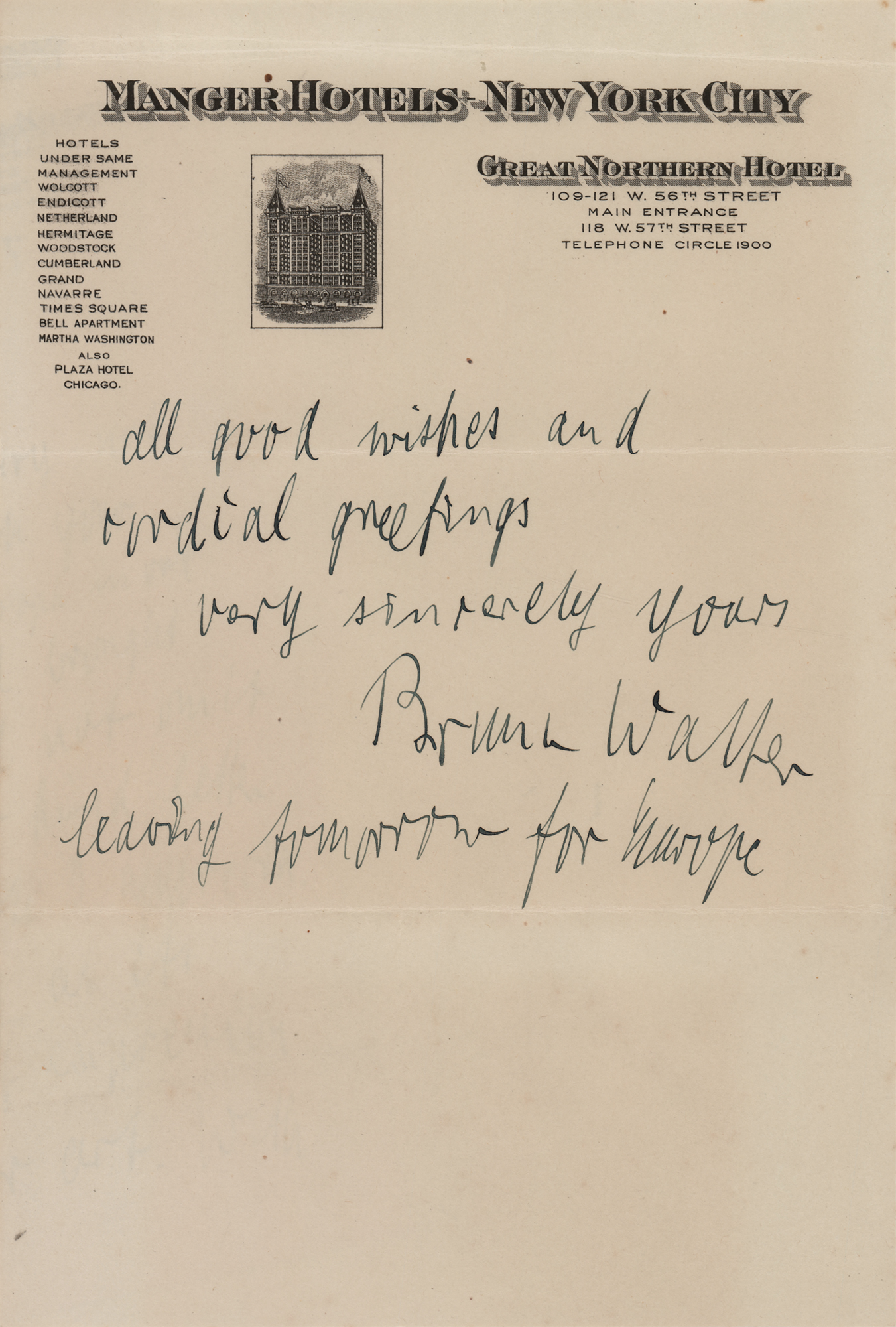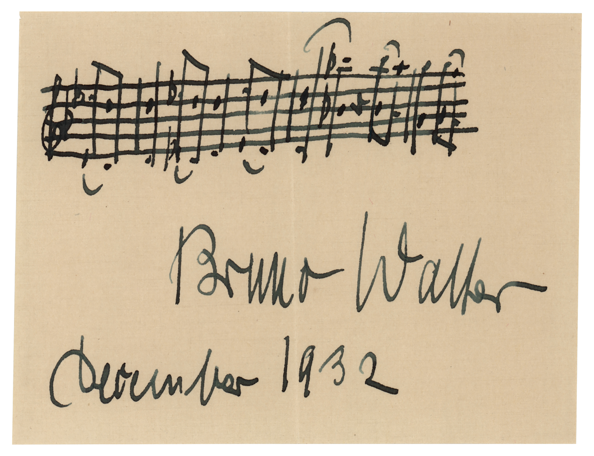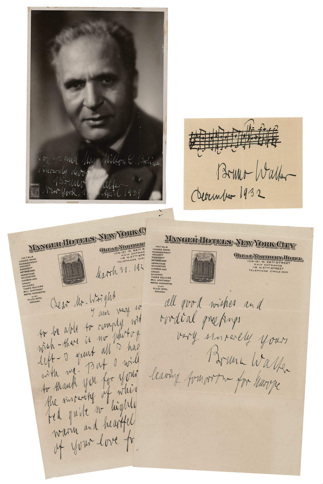 German-born conductor and composer (1876-1962) who worked closely with Gustav Mahler and is widely considered to be one of the great conductors of the 20th century. Three items: an AMQS on an off-white 4.25 x 3.25 sheet, which is signed in bold fountain pen by Bruno Walter, who adds the date, “December 1932,” and several bars of unknown work; a vintage pearl-finish 5 x 7 photo of Bruno by Nelly's of Athens, signed and inscribed in white ink, “To Mr. and Mrs. Milton L. Berliner, sincerely devoted, Bruno Walter, New York, 15th April 1939”; and an ALS, two pages, 5.75 x 8.75, Great Northern Hotel letterhead, March 31, 1925, in part: “I am very sorry not to be able to comply with your wish – there is no photograph more left – I spent all I had brought with me. But I will not omit to thank you for your kind letter the sincerity of which I appreciated quite so highly as its warm and heartfelt expression of your love for art.” Walter adds a brief postscript: “Leaving tomorrow for Europe.” In overall very good to fine condition, with a scratch, and some silvering, to the photo.