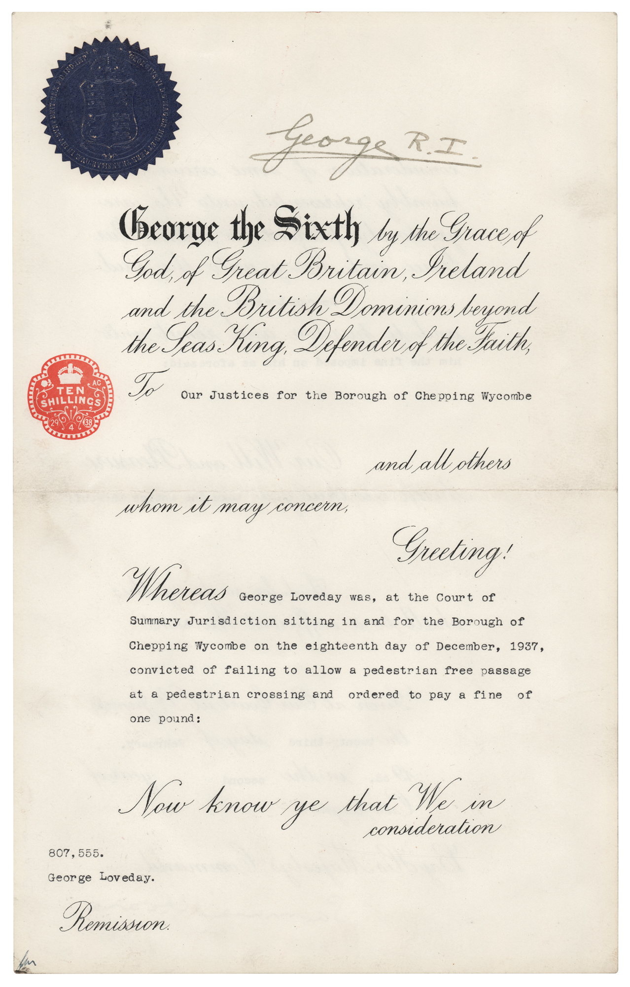 Partly-printed DS, signed “George RI,” one page both sides, 8.25 x 13, February 23, 1938. King George VI grants a pardon to George Loveday, "convicted of failing to allow a pedestrian free passage at a pedestrian crossing and ordered to pay a fine of one pound." Prominently signed at the head in ink by King George VI, and countersigned at the conclusion by Home Secretary Samuel Hoare. The embossed navy seal affixed at the head remains intact. In fine condition.