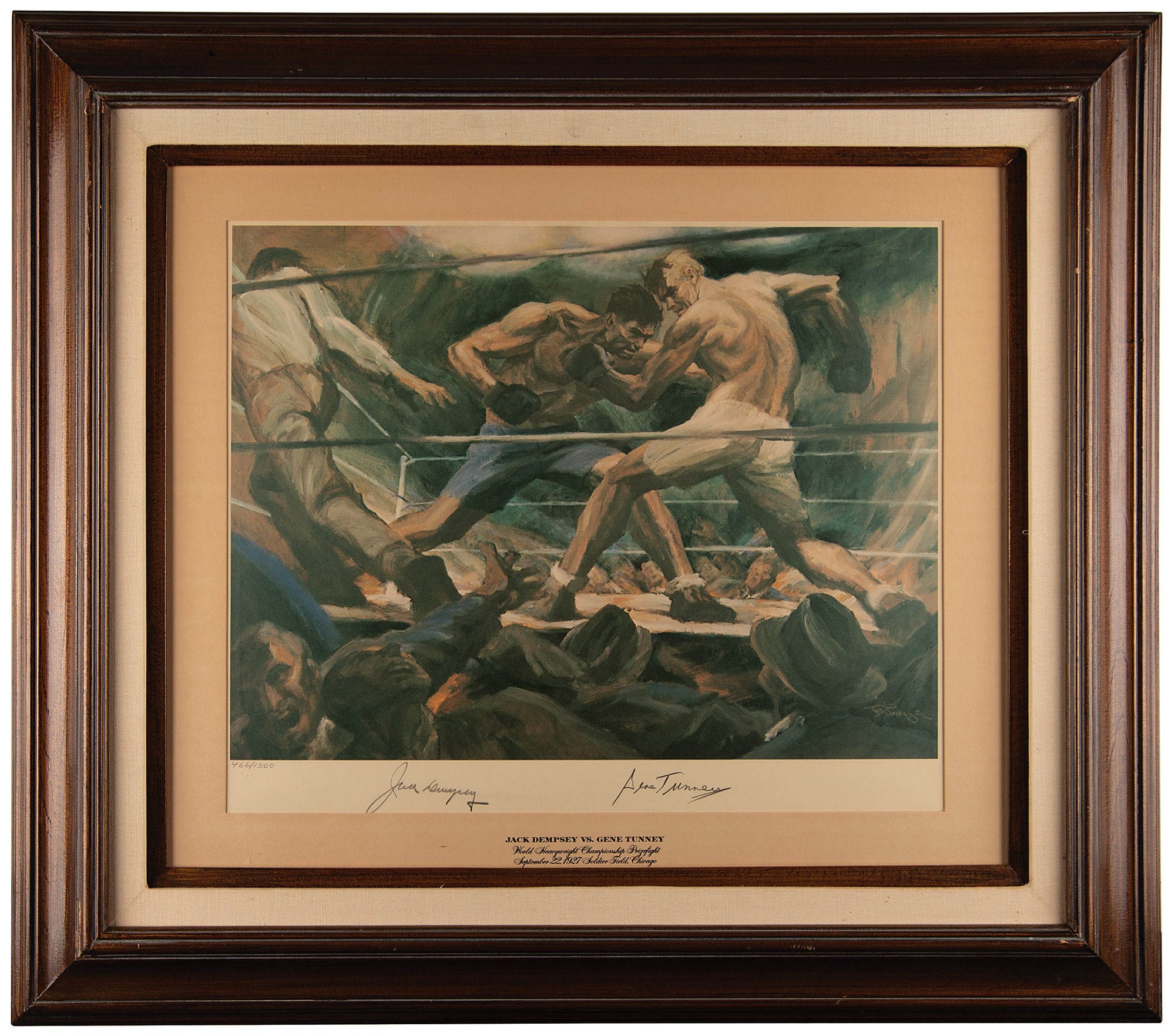 Color limited edition 20 x 16.75 lithograph of a Gustav Rehberger painting entitled 'Jack Dempsey vs. Gene Tunney,' showing the pair stylishly slugging it out in the ring, numbered 466/1500, signed in the lower border in pencil by Dempsey and Tunney. Framed in its original mat to an overall size of 33 x 28.75. Released as part of Sports Illustrated's 'Living Legends' series, with a descriptive caption affixed to the frame's backing. In fine condition.