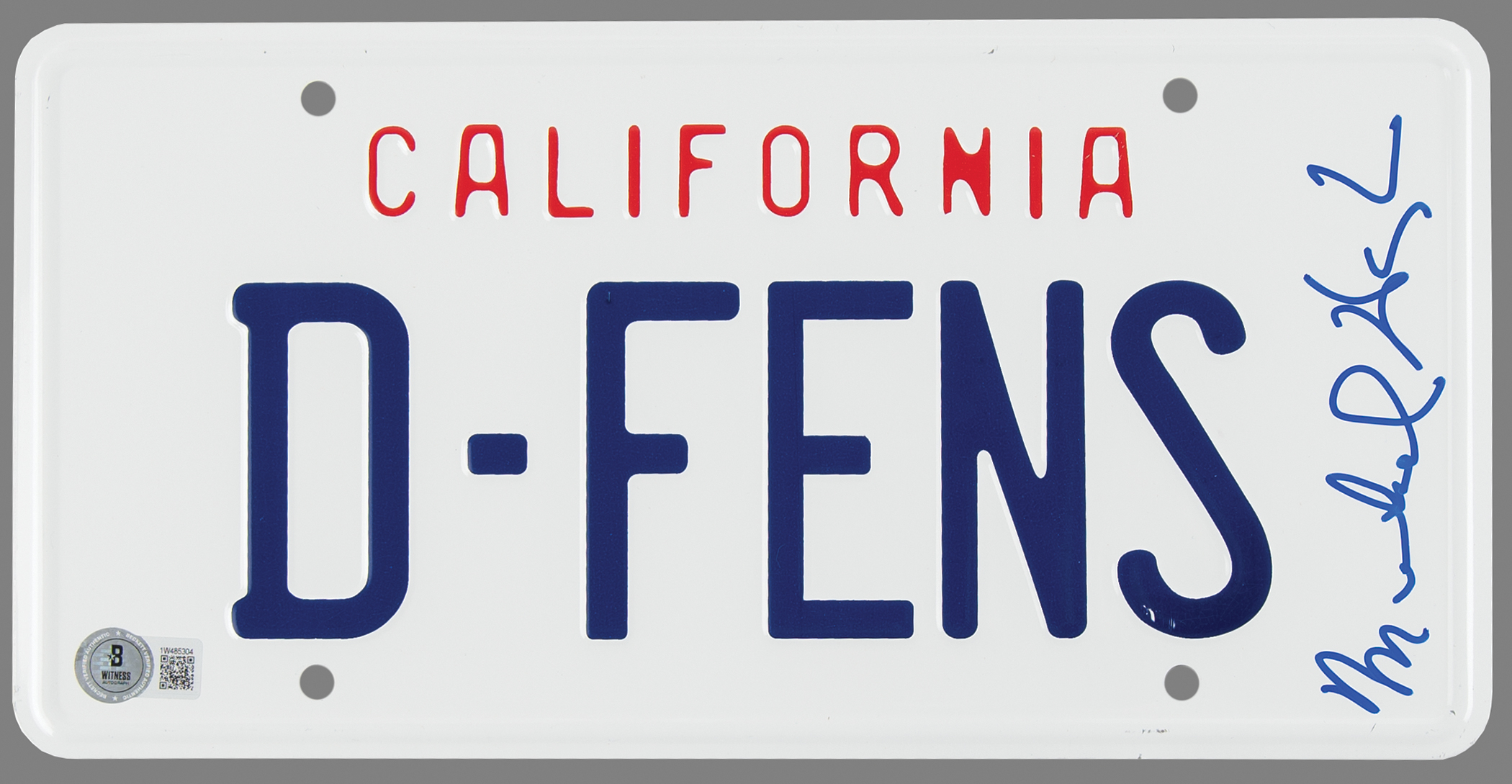 Souvenir California state license plate that reads “D-FENS,” 12 x 6, signed vertically in blue felt tip by Michael Douglas, the star of the 1993 film Falling Down. In very fine condition, with a Beckett label affixed to the lower left corner. ‘D-Fens’ was the license plate of Douglas’s character William Foster, a divorced and unemployed former defense engineer who has a mental break during a traffic jam and begins a violent trek across Los Angeles.