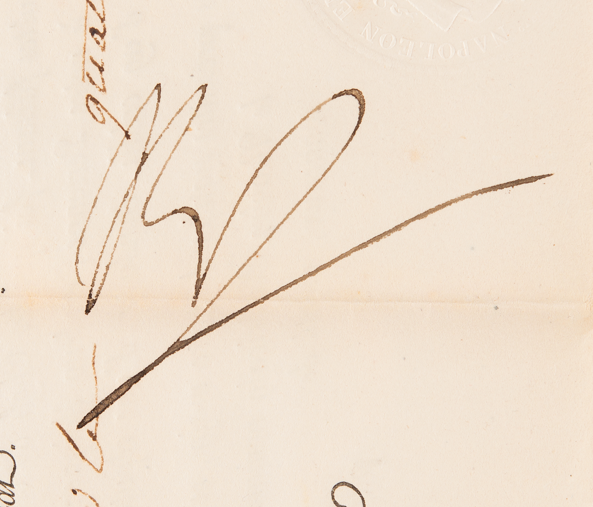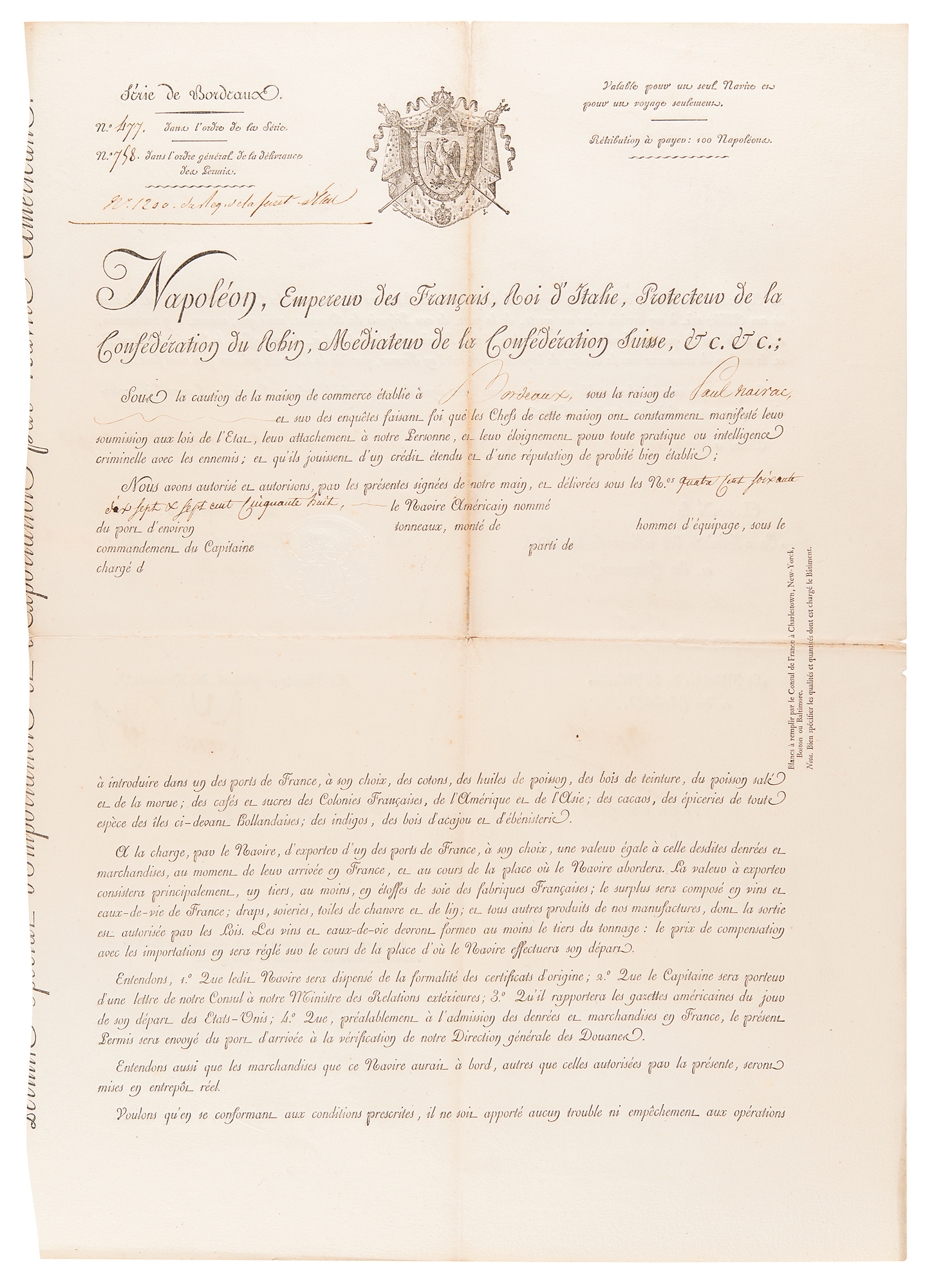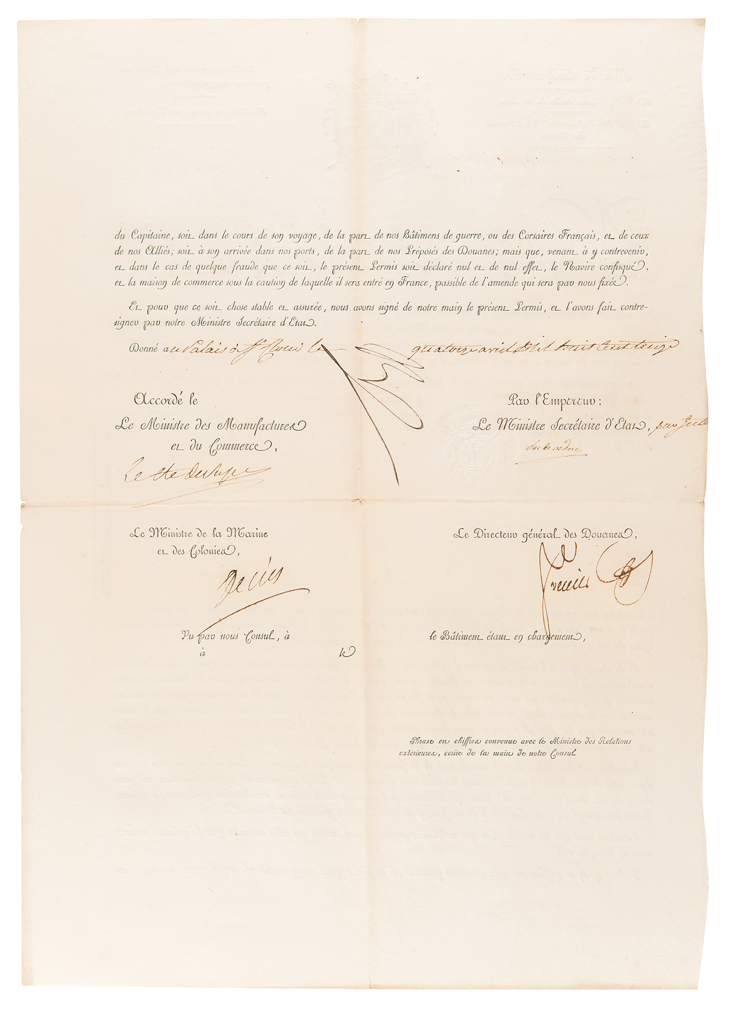 Partly-printed DS in French, signed “Nap,” one page both sides, 13.5 x 19.25, April 14, 1813. Maritime passport granted to a ship of the trading house 'Paul Nairac,' departing from the port of Bordeaux, "to introduce, at its choice, into one of the ports of France, cotton, fish oils, dye woods, salted fish, and cod; coffees and sugars from French, American, and Asian colonies; cocoas, groceries of all kinds from former Dutch islands; indigos, mahogany, and cabinet woods." Prominently signed at center by Napoleon Bonaparte, and countersigned by the Minister of Manufactures and Commerce Jean-Baptiste Henry Collin, Count of Sussy; Minister Secretary of State Jean-Baptiste Nompère de Champagny, duc de Cadore; Minister of the Navy and Colonies Denis, Duc de Decrès; and the Director General of Customs François Ferrier. In fine condition, with light toning to the intersecting folds.