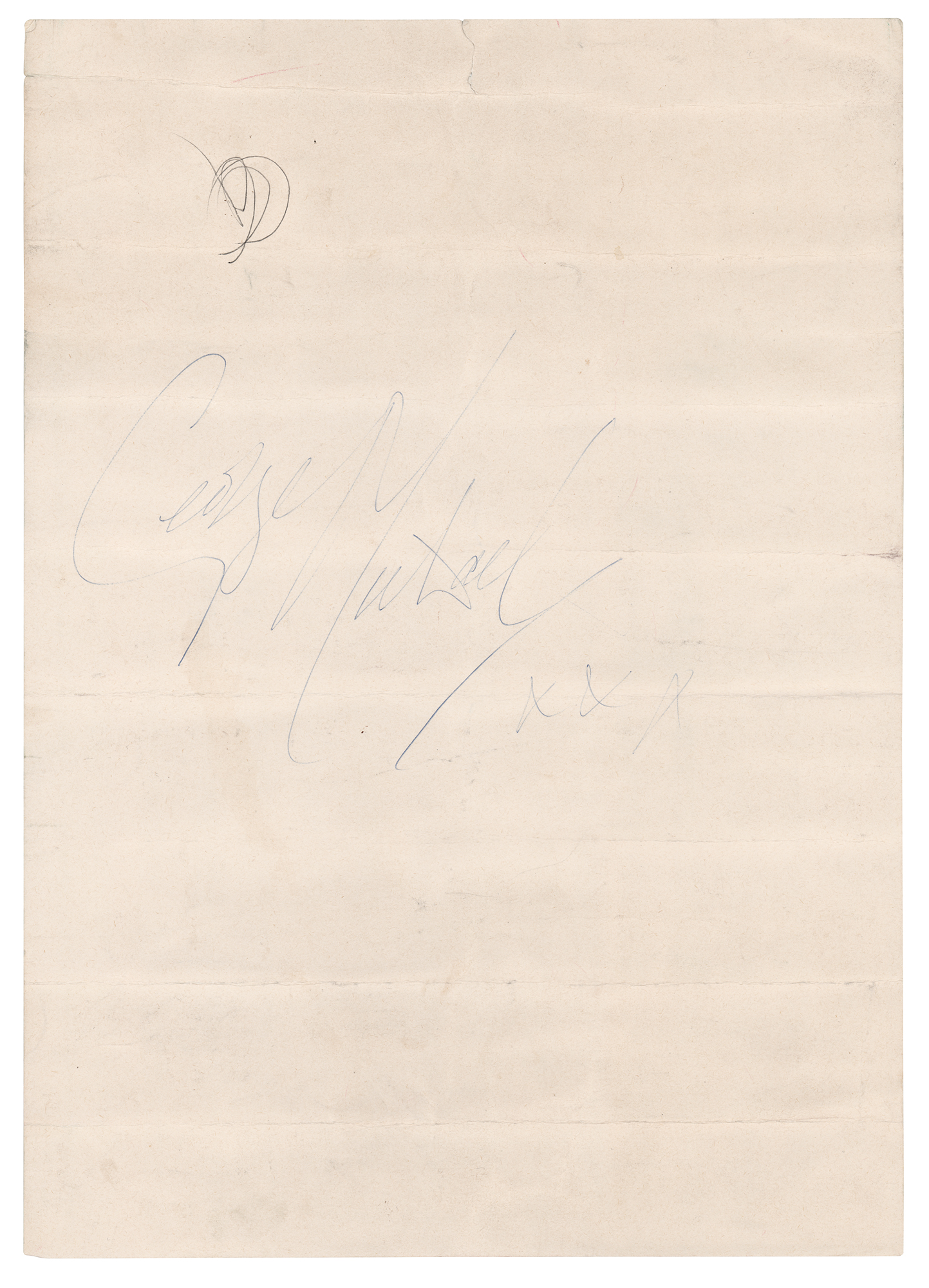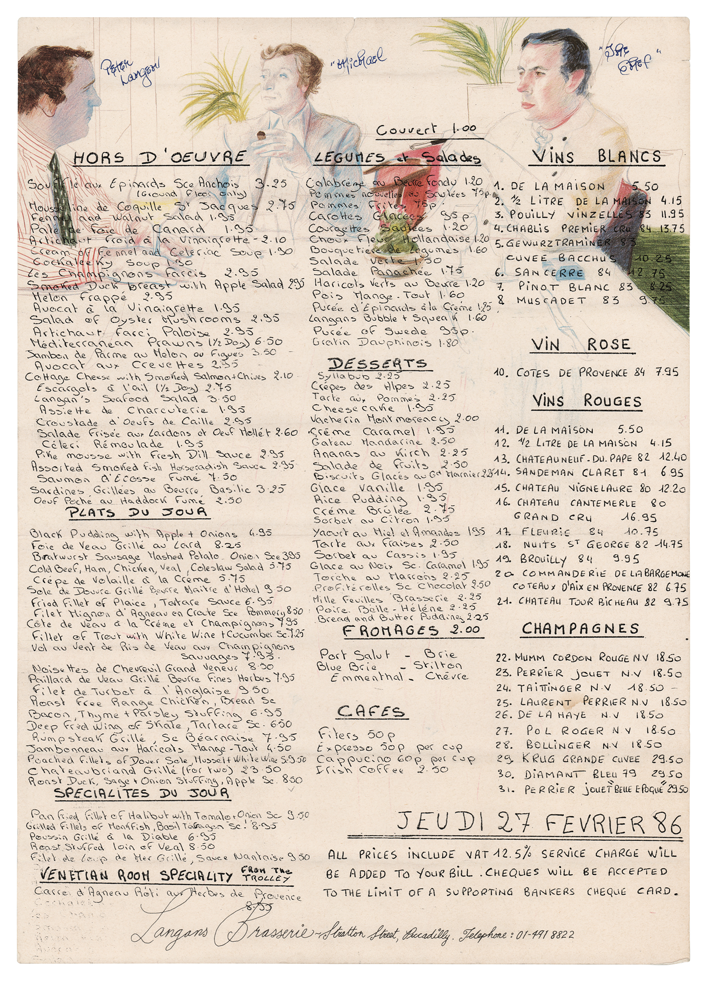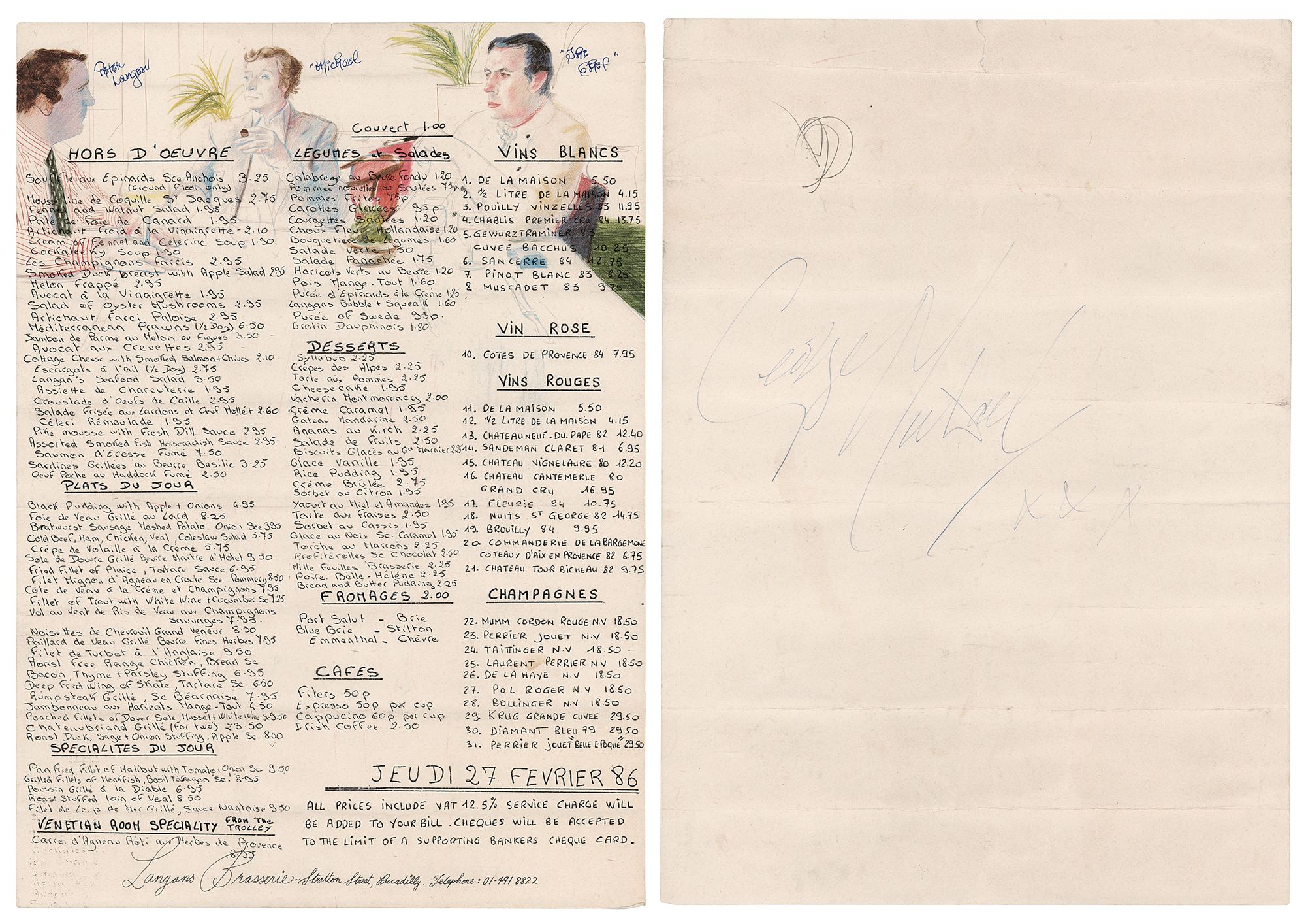 Original color 11.75 x 16.5 menu for the popular London-area restaurant Langan's Brasserie from February 27, 1986, featuring artistic images of entrepreneur Peter Langan, actor Michael Caine, and chef Mark Baumann along the top, signed on the reverse in blue ballpoint, “George Michael, xxx.” In very good condition, with a tear to the top edge, and heavy repeating horizontal folds.