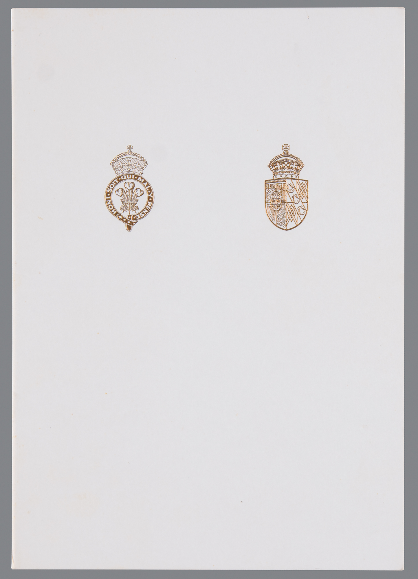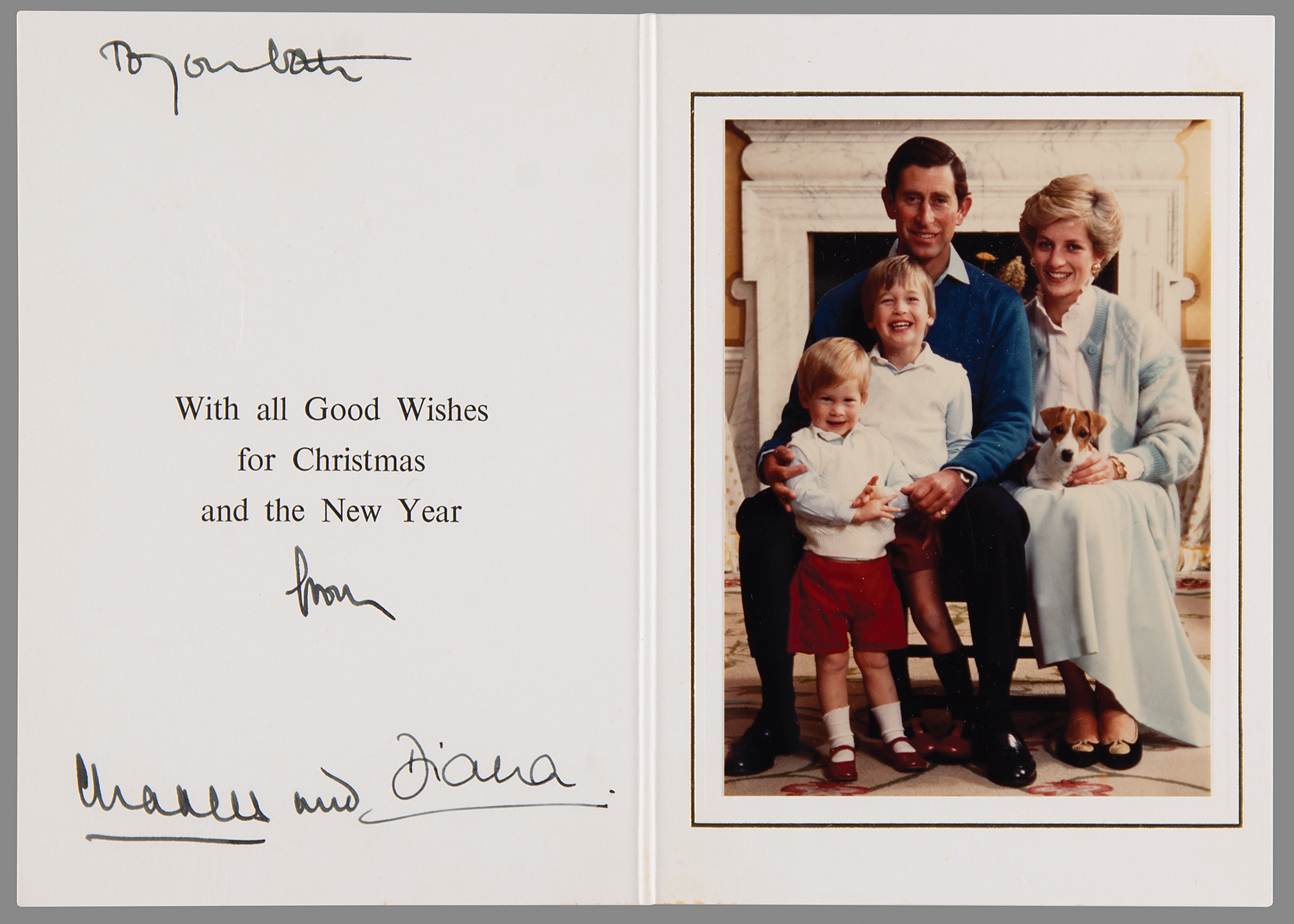 Appealing 1986 Christmas card embossed on the front with the Prince of Wales’s feathers and Order of the Garter motto and the Spencer family arms, measuring 10.25 x 7.25 open, featuring an affixed color photo of the royal couple posing with their young sons Prince William and Prince Harry, signed and inscribed in fountain pen, "To you both, from Charles and" and "Diana." In very fine condition.