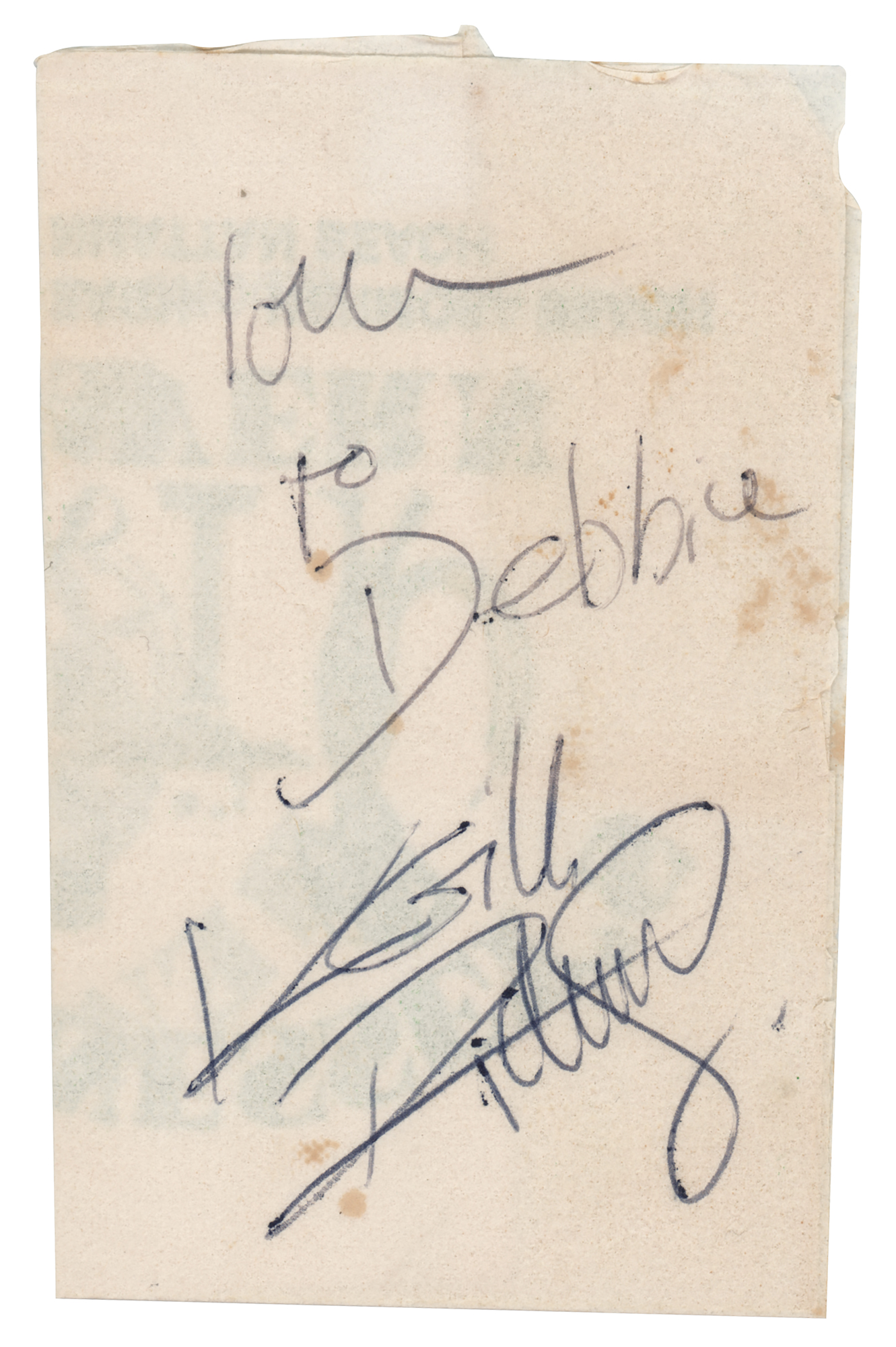 Vintage ballpoint signature, "Keith Richard, x,” on a folded off-white 3.25 x 5 napkin from Hennessey’s Tavern in California; the inscription is in another hand. In fine condition, with scattered small stains. Accompanied by a mailing list card from The Jacknives, the reverse of which is filled out in a hand pretending to be Richards.