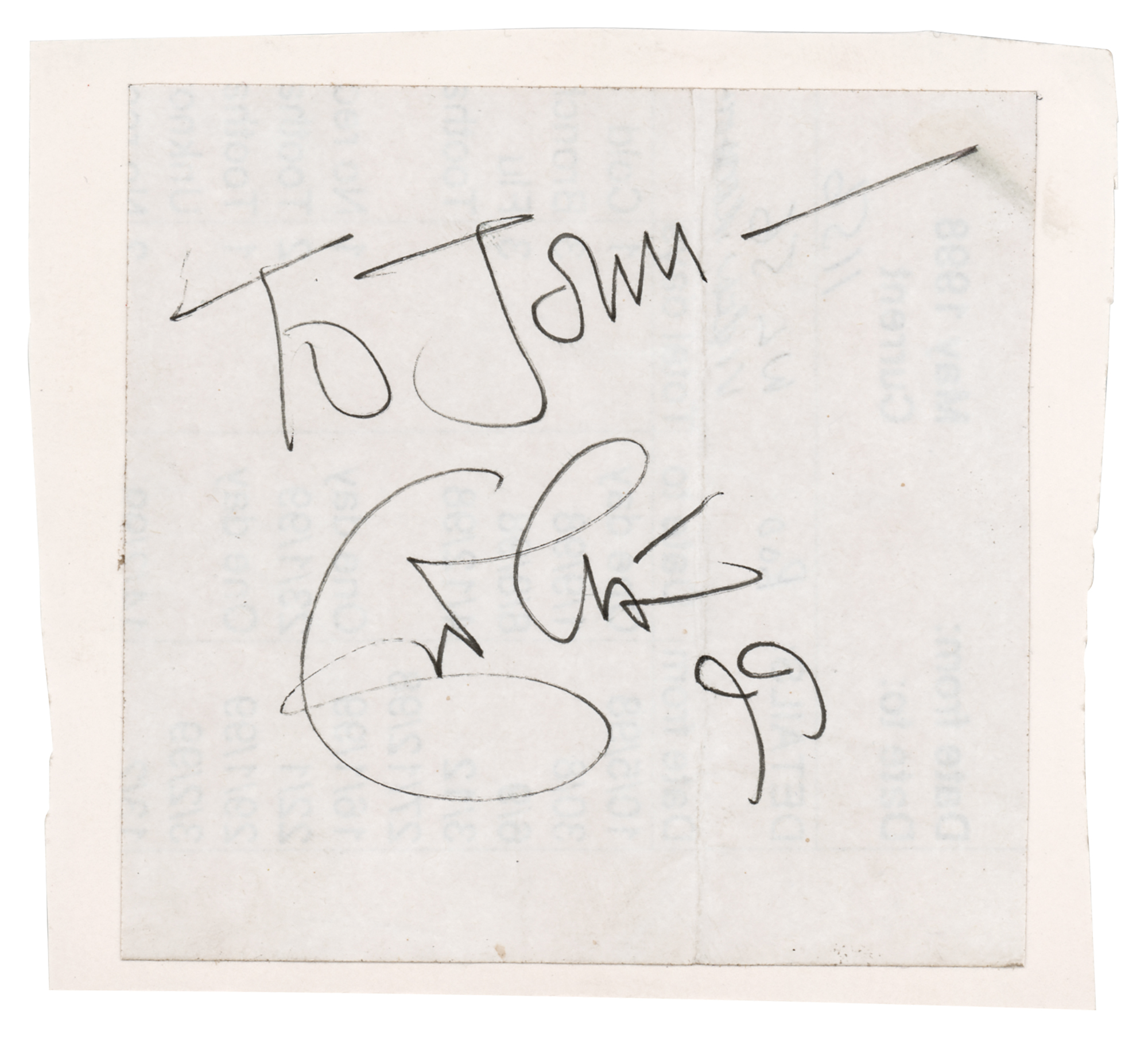 Ink signature and inscription, "To John – Eric Clapton, 99,” on an off-white 3.75 x 3.75 sheet affixed to a slightly larger mount. In fine condition, with a vertical fold passing through the last name.